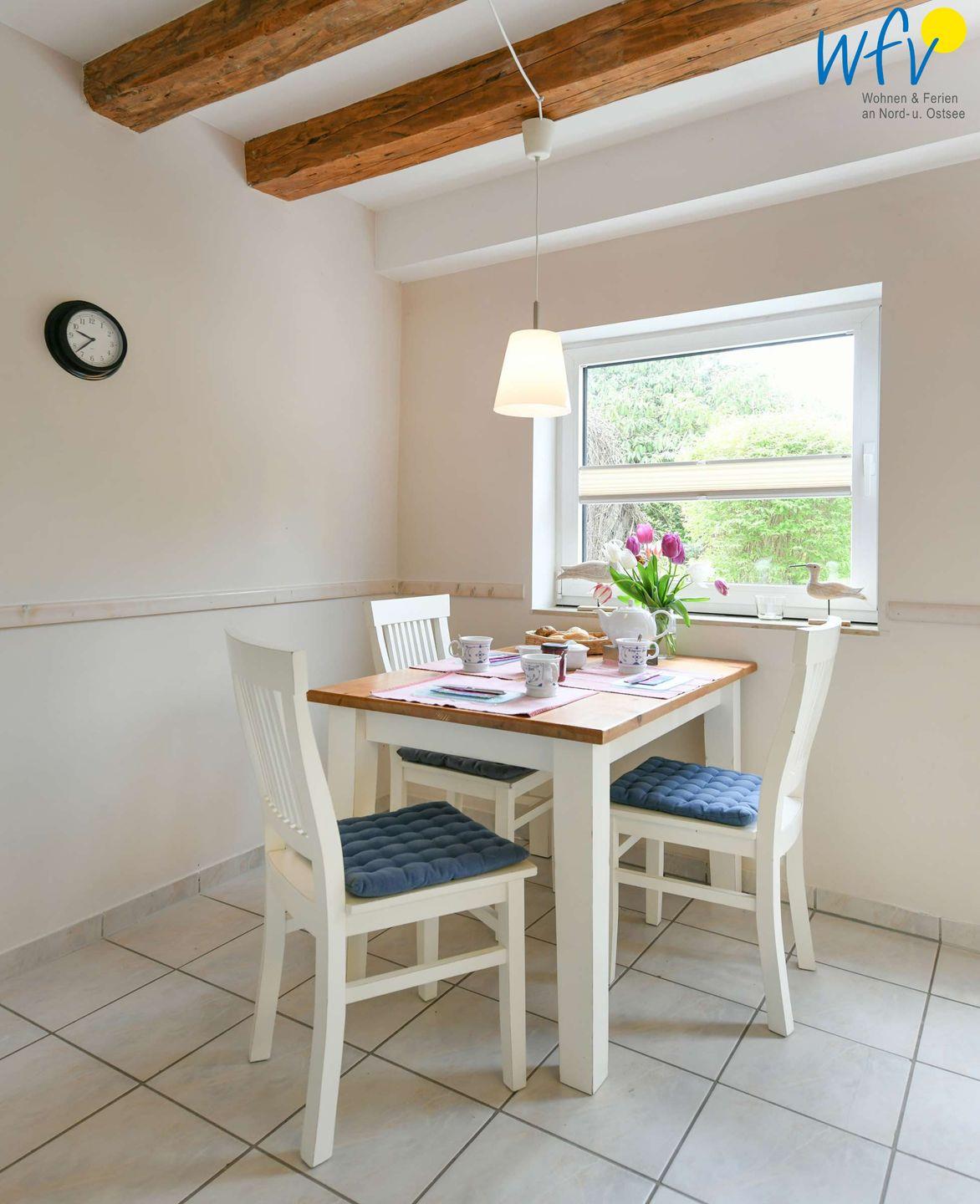 Helle Räume mit charmanter Holzbalkenoptik, stilvolles Mobiliar und eine schöne Aussicht in den Garten verleihen dem Rügener Ferienhaus viel Gemütlichkeit. Wunderbar relaxen können Sie auch auf der möblierten Westterrasse! Zu der Ferienanlage „Haus am Hövt“ gehört zudem ein großer Gemeinschaftsgarten mit Grillplatz, Tischtennisplatte und Spielmöglichkeiten, den Sie gerne nutzen dürfen.