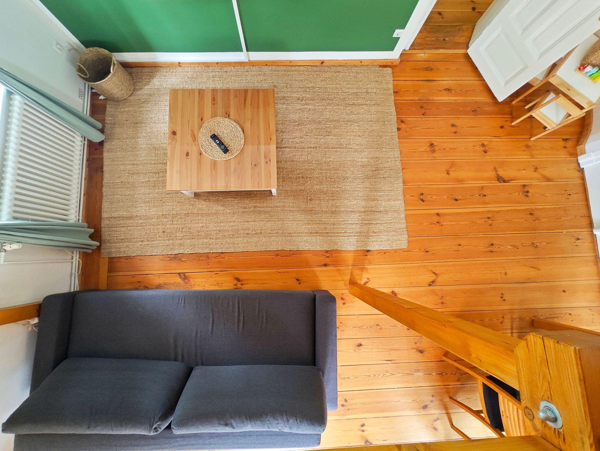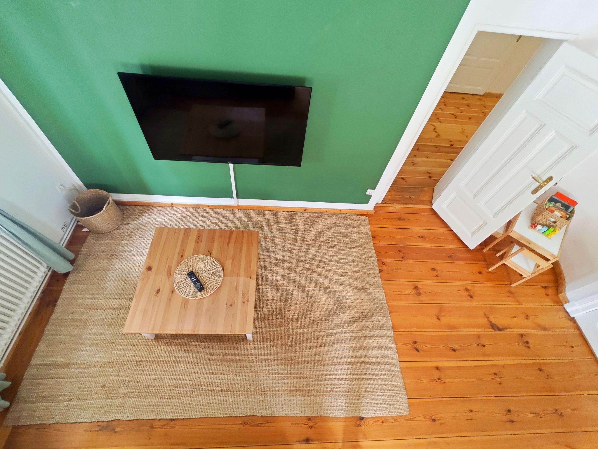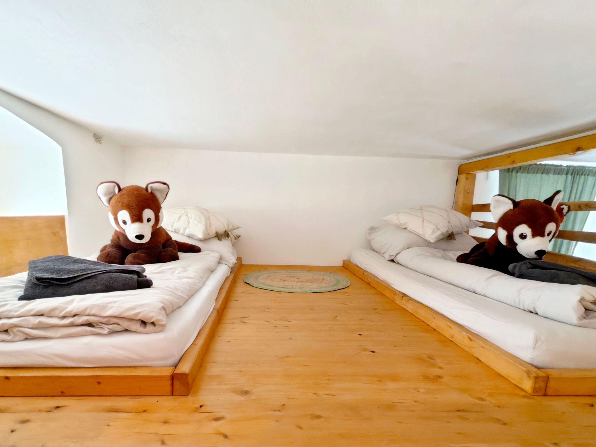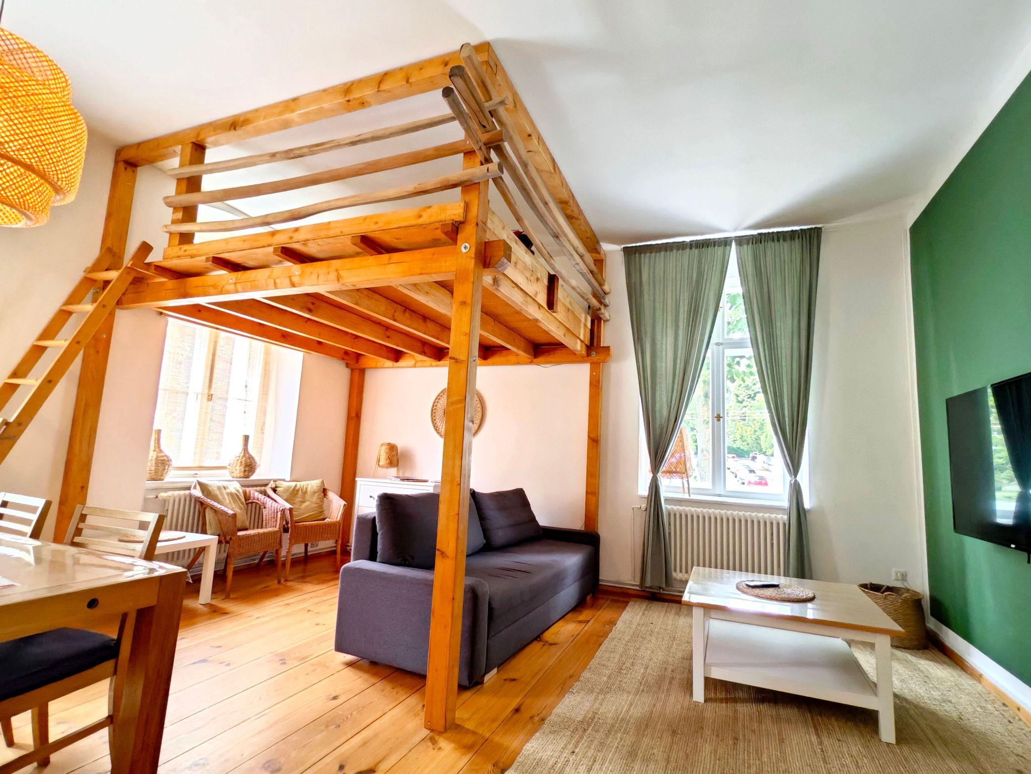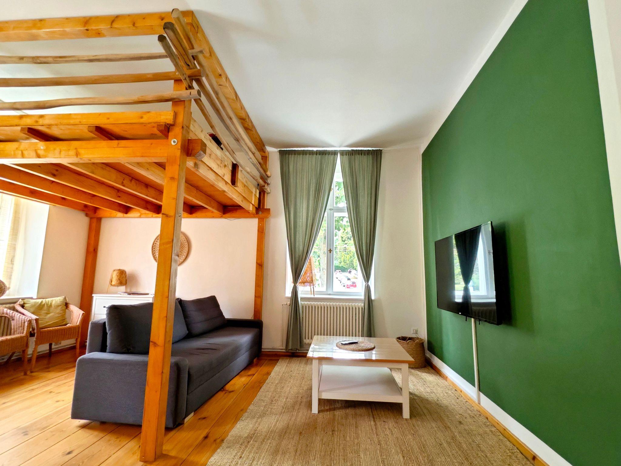 Wohnbereich mit Schlafsofa, Kinderhochbett, Kommode, Flachbild TV, Kabelkanäle, Radio, Internet