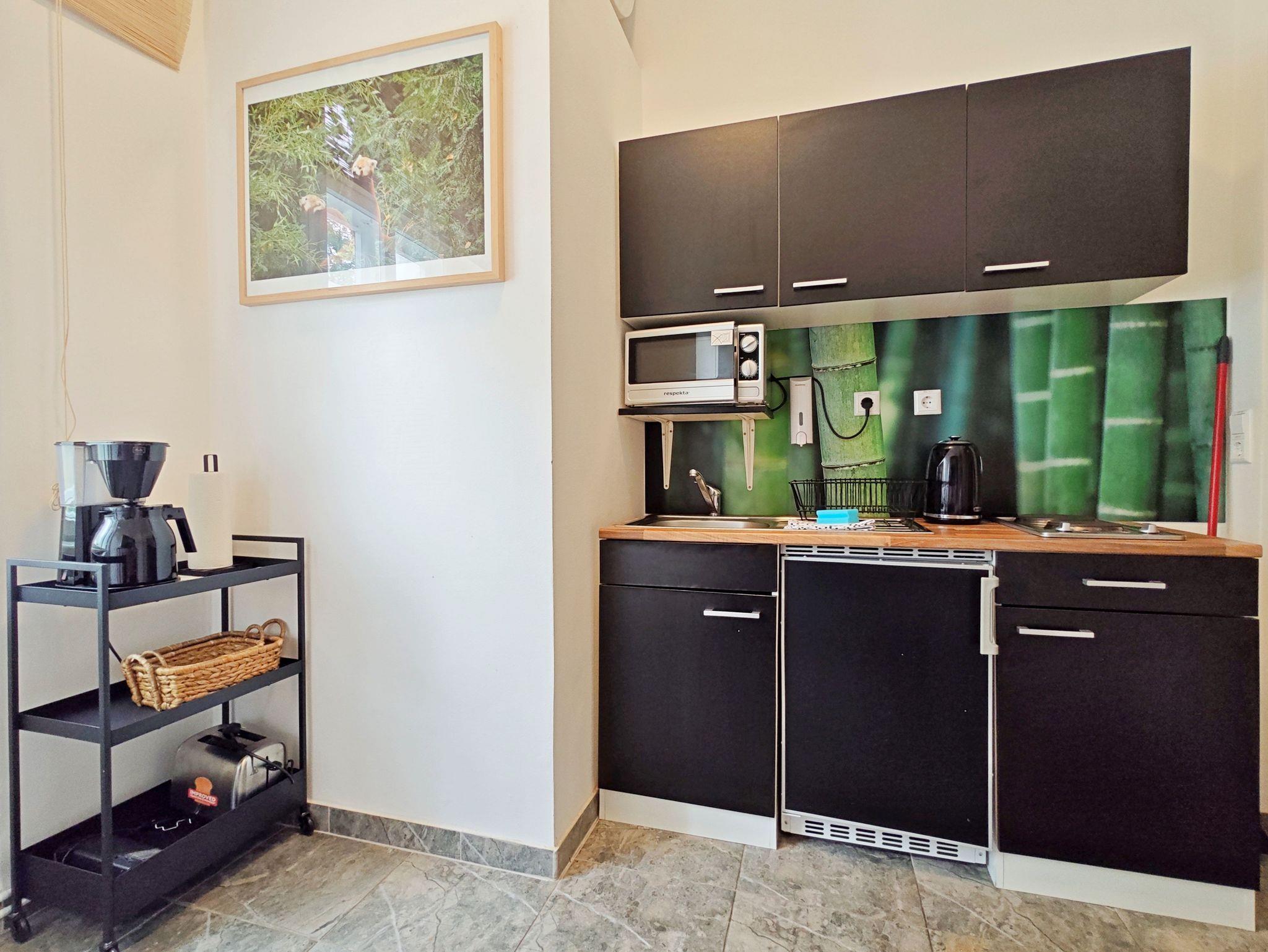 Küche mit Kaffeemaschine, Wasserkocher, Kühlschrank, Mikrowelle, Herd, Kindergeschirr und -besteck