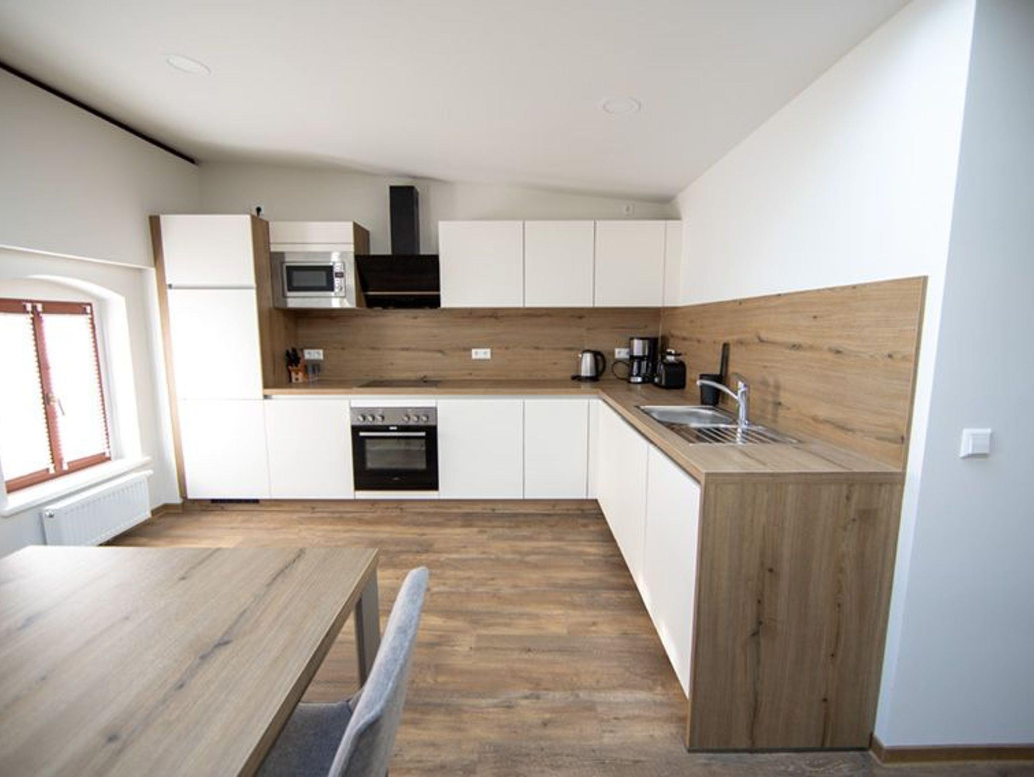 Das helle und geräumige Wohnzimmer kombiniert eine offene Küche mit einem großen Esstisch für bis zu sechs Personen. Ein bequemes Ecksofa lädt zum Entspannen ein, während eine Büroecke mit Schreibtisch einen idealen Arbeitsplatz bietet. Das Schlafzimmer sorgt für erholsamen Schlaf, und das Badezimmer ist mit einer modernen Dusche ausgestattet.