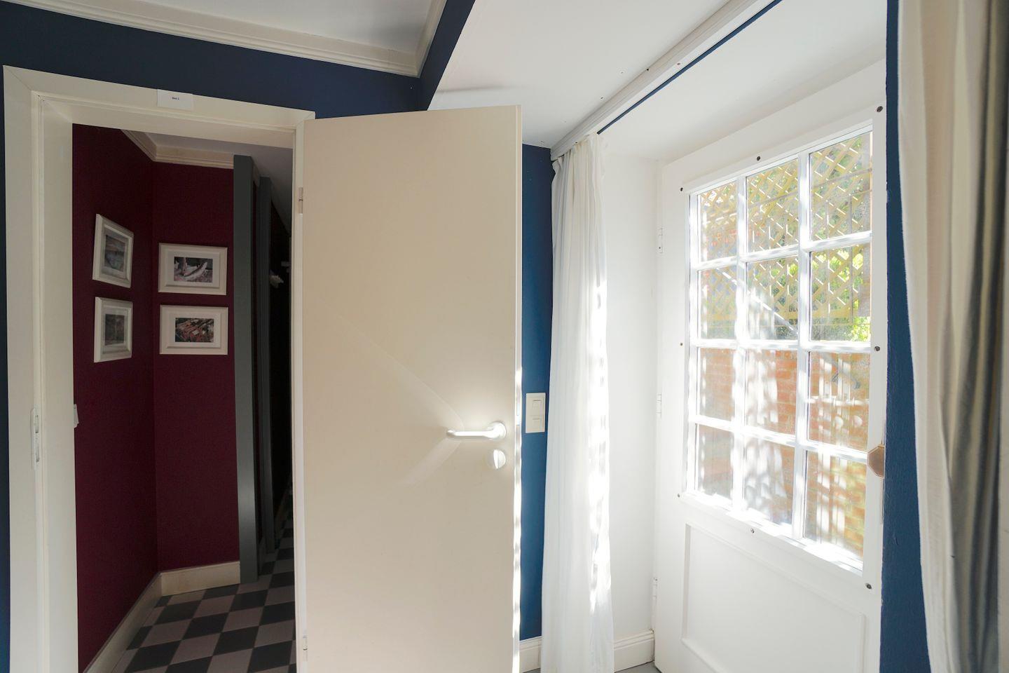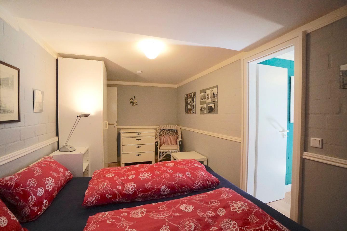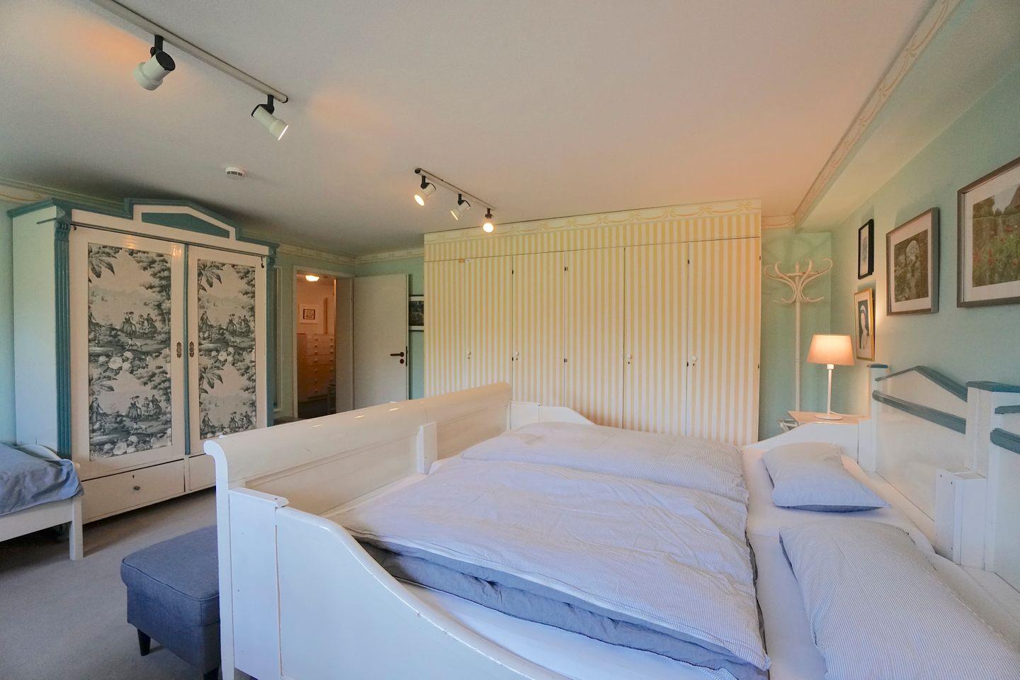 Das „Rote Zimmer“ hat ein Doppelbett (s. o.), kleinen Schreibtisch, Kleiderschrank, Kommode, Sessel und Bücherregal.