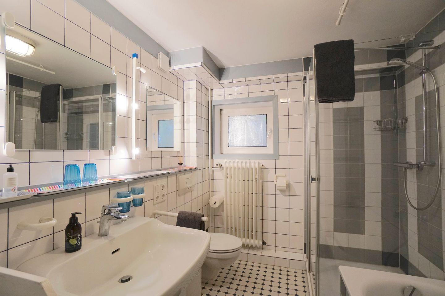 Das Bad 1 (Dusche, Waschbecken, WC) ist klein, aber mit allem Komfort ausgestattet inklusive Wickeltisch bzw. großer Ablage.