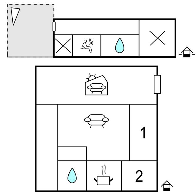 Es gibt zwei separate Schlafzimmer, im Wohnbereich befindet sich eine weitere Schlafmöglichkeit.