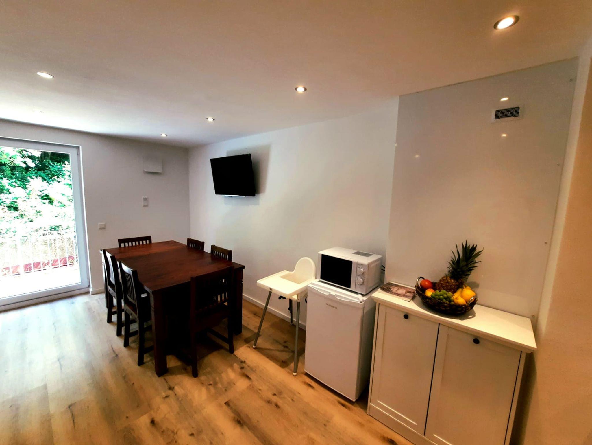 Unsere kernsanierte Ferienwohnung mit 70 m² Wohnfläche bietet Platz für 1-6 Personen. Das gemütliche Wohn-Esszimmer mit Zugang zum Balkon, Esstisch mit 6 Stühlen, Schlafsofa und Sat TV (Smartfernseher mit allen gängigen Streamingapps wie Netflix, YouTube...) lädt zum Verweilen ein. Die offene und komplett ausgestattete Küche mit Geschirrspüler, Kühlschrank inclusive kleinem Gefrierfach, Herd, Backofen, Mikrowelle, Wasserkocher, Kaffeepadmaschine, Toaster und Stabmixer lässt keine Wünsche offen. Die Ferienwohnung verfügt über 2 Schlafzimmer mit je 2 Einzelbetten (Betten zusammenschiebbar, in beiden Schlafzimmern befindet sich ebenfalls ein Smart TV). Das geräumige Badezimmer mit modernem Doppelwaschbecken, großem Spiegel, großzügiger Dusche, Badewanne und sichtgeschütztem WC bietet viel Platz für die ganze Familie. Bitte beachten Sie, dass keine Haustiere erlaubt sind. Das WLAN und eine absperrbare Garage (nur nach vorheriger Anmeldung und Verfügbarkeit) vor dem Haus können Sie kostenfrei Nutzen.