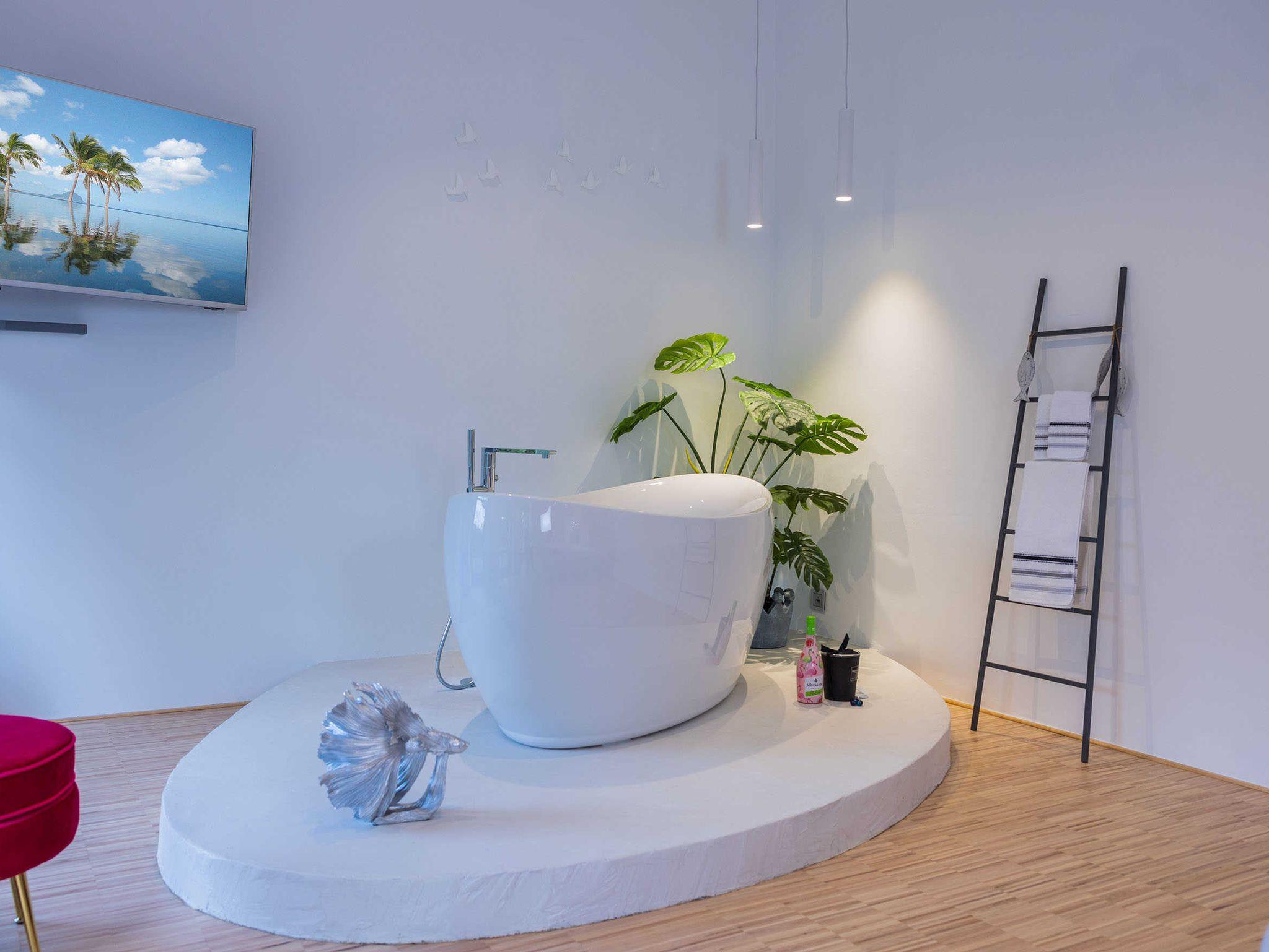 freistehende Badewanne im Schlafraum. Die Wohnung befindet sich in der