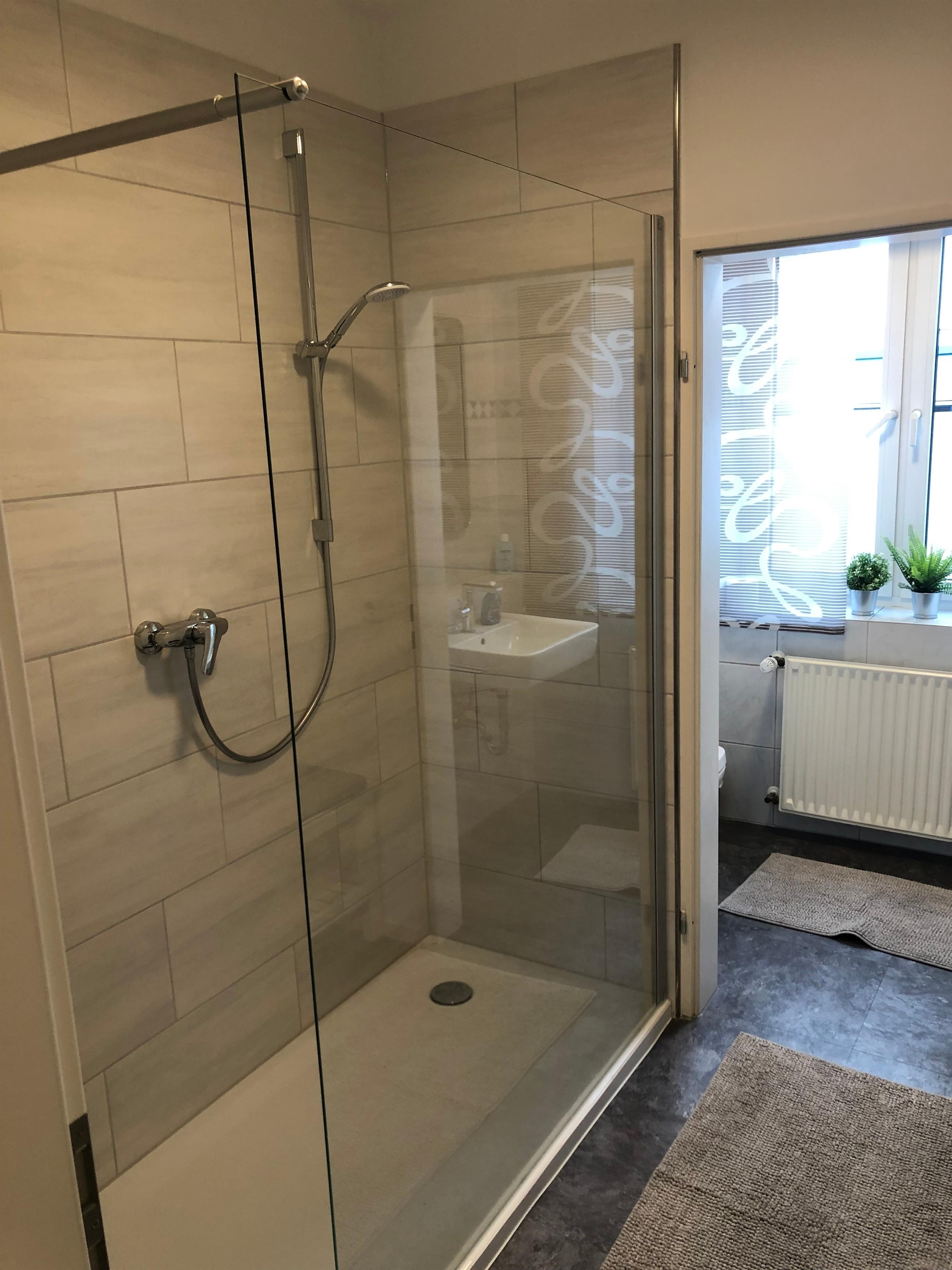 Bad: WC, Waschbecken und einer 1,4 m großen Dusche