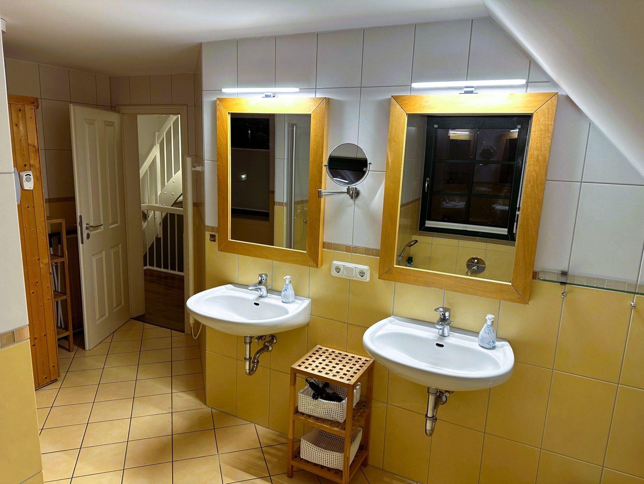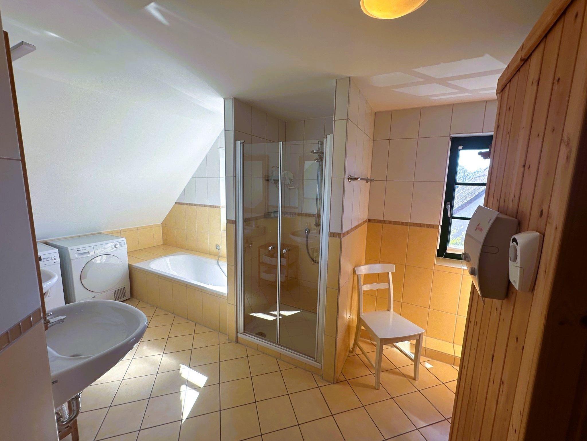 Im Obergeschoss erwarten Sie zwei Schlafzimmer mit Doppelbett sowie ein geräumiges Bad mit Badewanne, Dusche, zwei Waschbecken und einem separaten WC. Eine Waschmaschine und ein Trockner stehen zur Nutzung bereit. Im oberen Bad befindet sich auch die geräumige Sauna, die jeden Aufenthalt zum Wellnessurlaub macht.