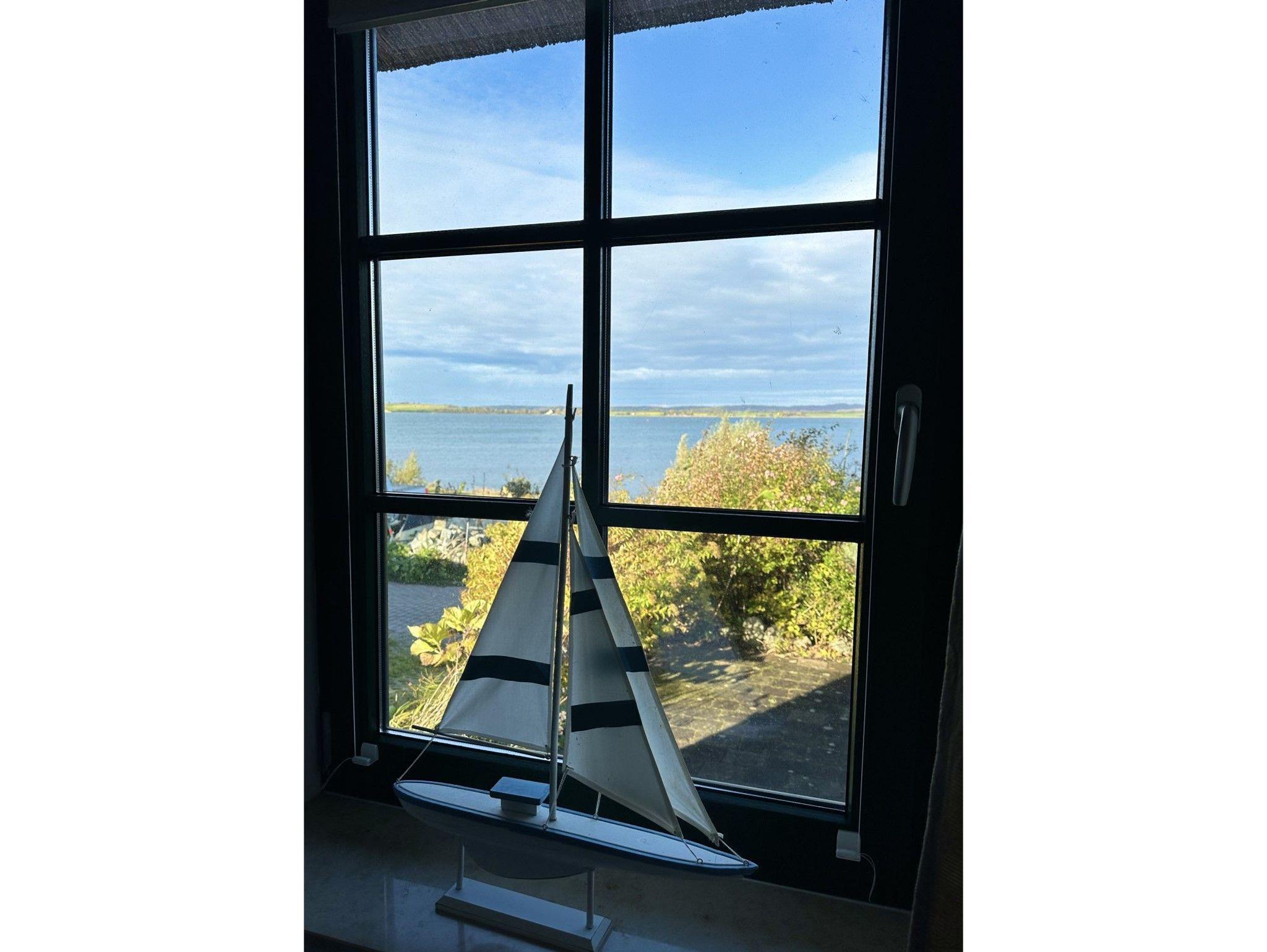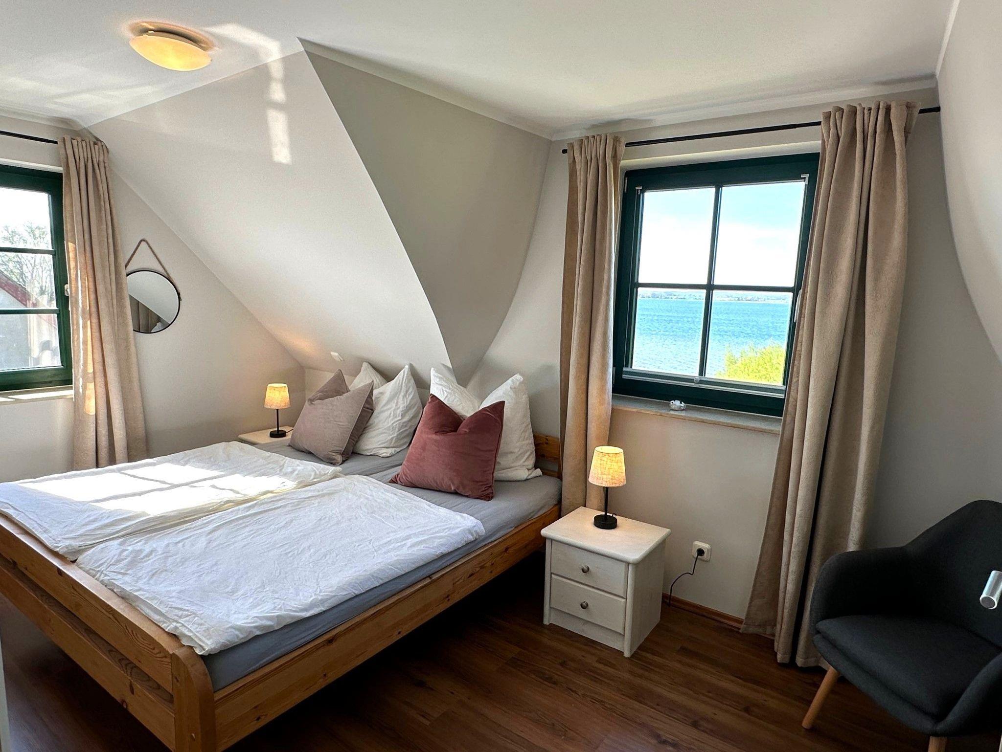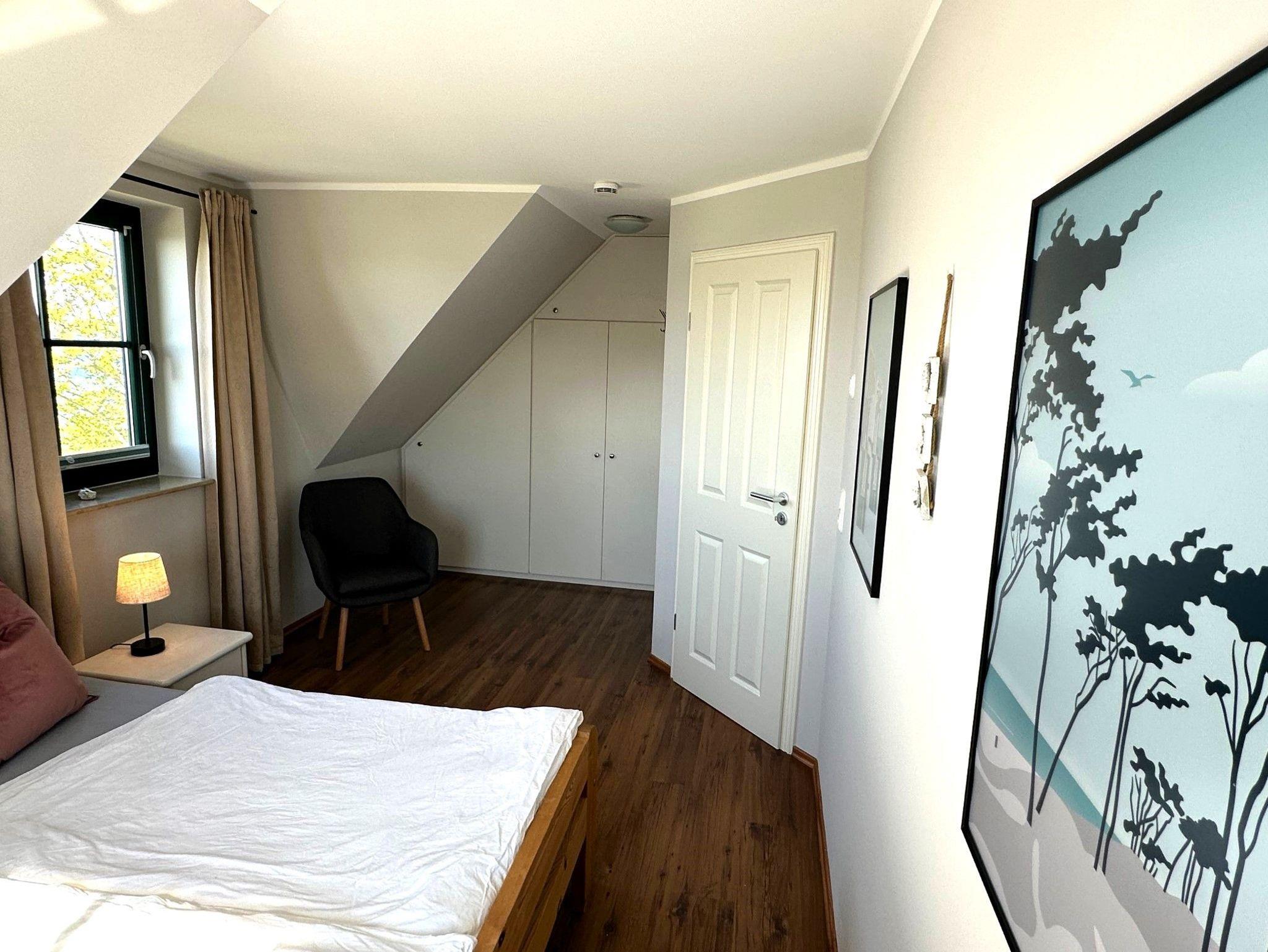 Ein großer, drehbarer Fernseher kann sowohl vom Essbereich und der Küche als auch direkt vom Sofa aus genutzt werden. Zusätzlich stehen ein DVD-Player, eine Stereoanlage, eine Auswahl an Büchern sowie Spiele zur Verfügung. Verbringen Sie gemeinsam Zeit am großen Esstisch oder kochen Sie in der voll ausgestatteten offenen Küche mit Kühl-Gefrierkombination, Cerankochfeld, Dunstabzugshaube, Geschirrspüler, Toaster, Mikrowelle, Wasserkocher und Filterkaffeemaschine. Das Schlafzimmer mit Blick auf den Bodden verfügt über zwei Einzelbetten und einen Fernseher. Das separate Duschbad befindet sich gegenüber dem Schlafzimmer. Unter der Treppe befindet sich ein kleiner Abstellraum.
