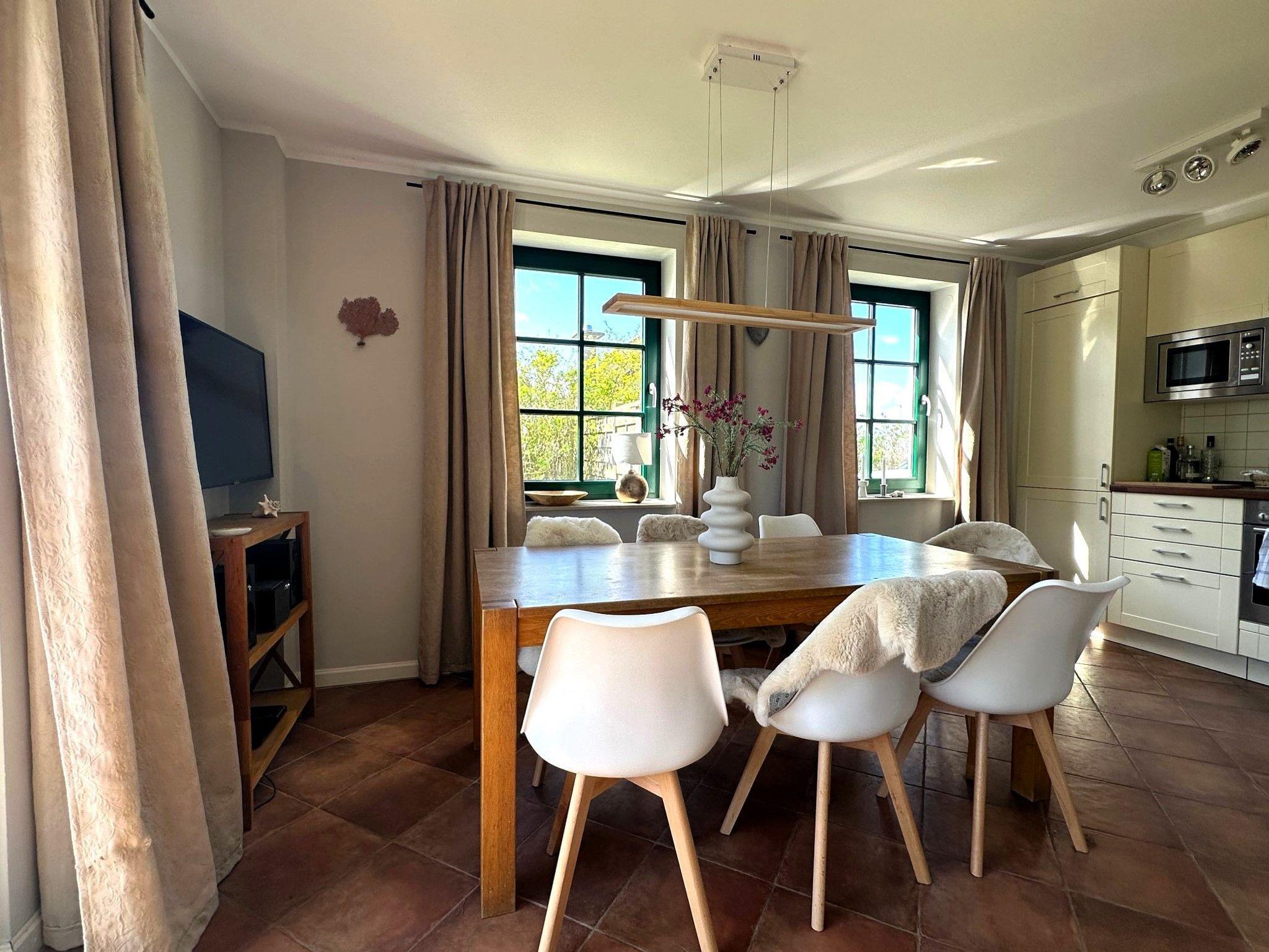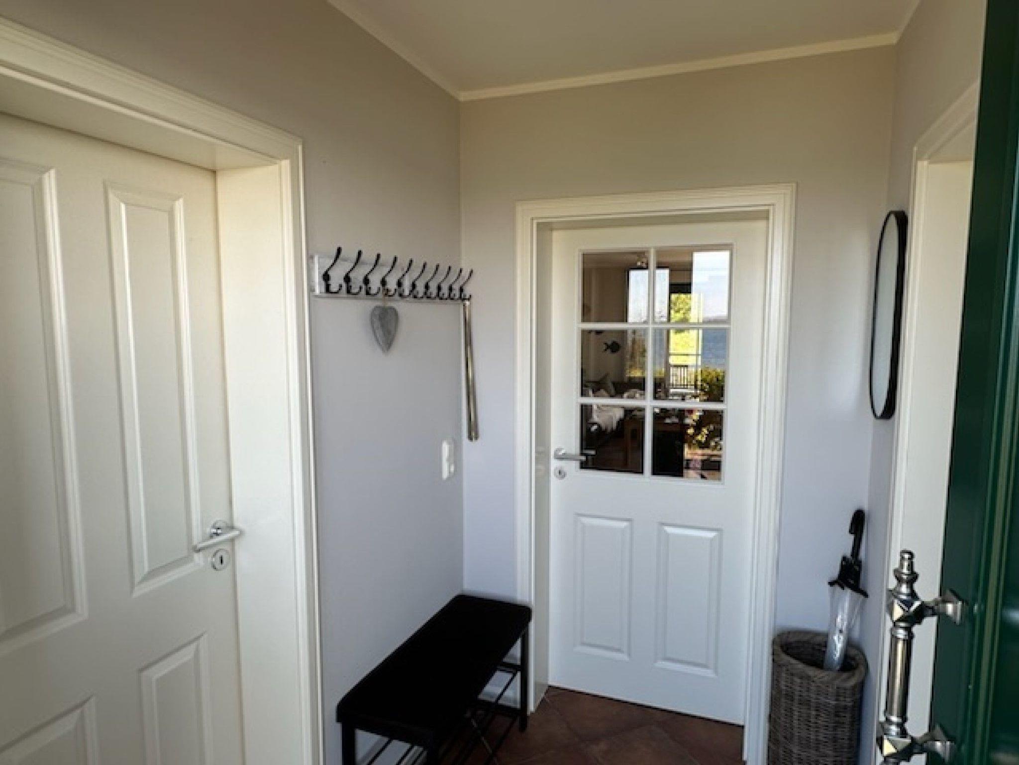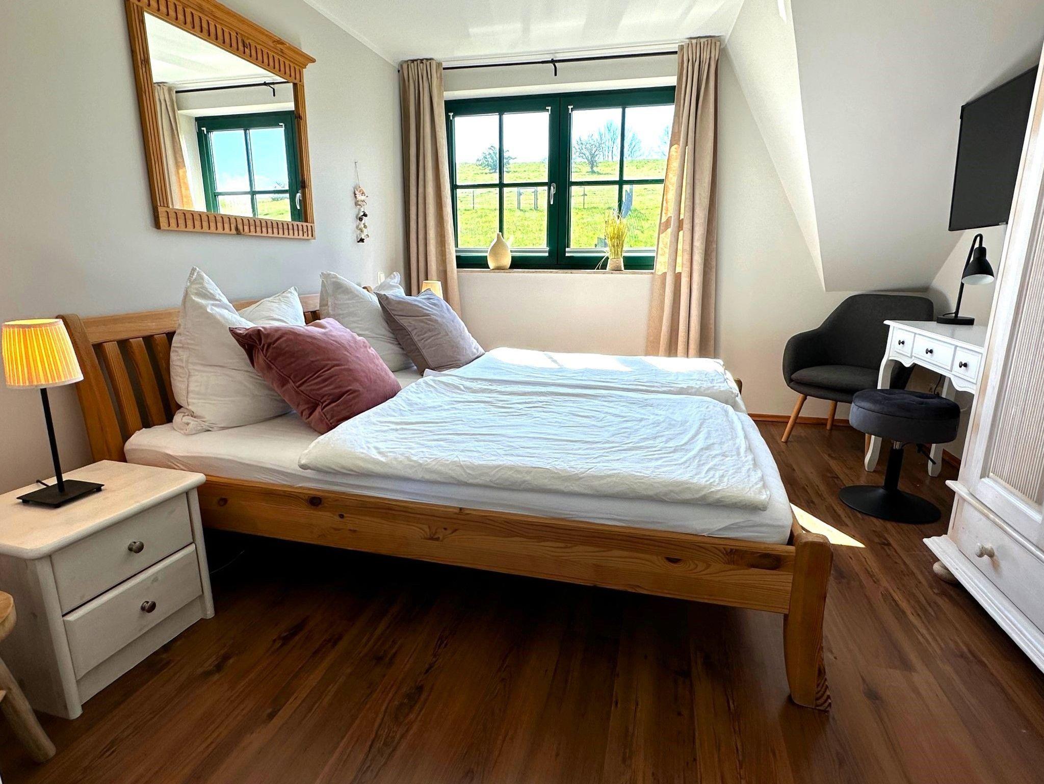 Ein großer, drehbarer Fernseher kann sowohl vom Essbereich und der Küche als auch direkt vom Sofa aus genutzt werden. Zusätzlich stehen ein DVD-Player, eine Stereoanlage, eine Auswahl an Büchern sowie Spiele zur Verfügung. Verbringen Sie gemeinsam Zeit am großen Esstisch oder kochen Sie in der voll ausgestatteten offenen Küche mit Kühl-Gefrierkombination, Cerankochfeld, Dunstabzugshaube, Geschirrspüler, Toaster, Mikrowelle, Wasserkocher und Filterkaffeemaschine. Das Schlafzimmer mit Blick auf den Bodden verfügt über zwei Einzelbetten und einen Fernseher. Das separate Duschbad befindet sich gegenüber dem Schlafzimmer. Unter der Treppe befindet sich ein kleiner Abstellraum.