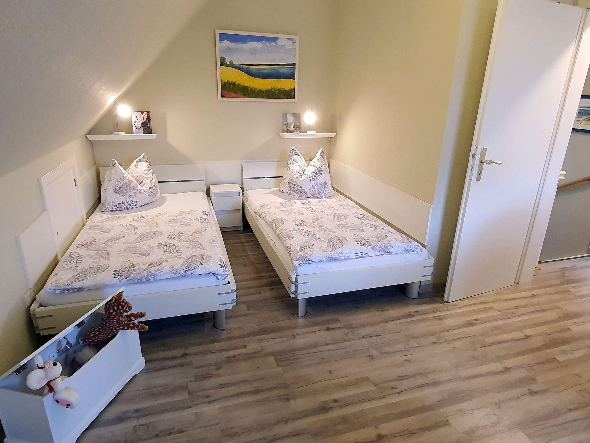 Das zweite Schlafzimmer ist mit zwei gemütlichen Einzelbetten und einer stylischen Sitzgruppe möbliert. Auch hier finden Sie einen Flachbild-TV mit DVD-Player incl. einer Auswahl an DVDs, dazu eine Spielkiste für die kleinen Gäste. Beide Schlafzimmer haben einen Insektenschutz. Ein Kinderreisebett, ein Kinderhochstuhl sowie Bügelutensilien stehen Ihnen während Ihres Aufenthaltes kostenfrei zur Verfügung. Falls benötigt, sind zusätzliche Decken und Kopfkissen ebenfalls vorhanden.