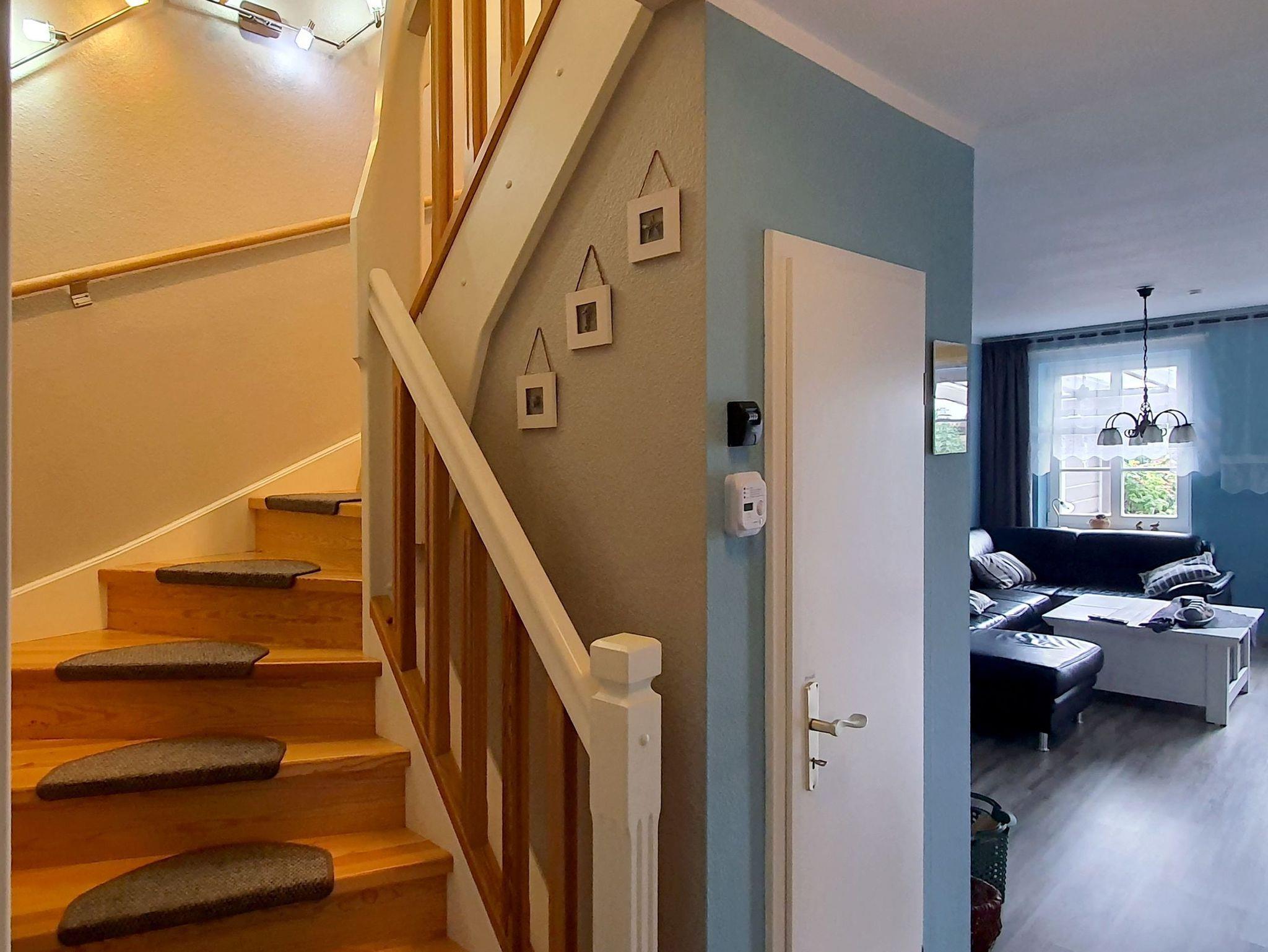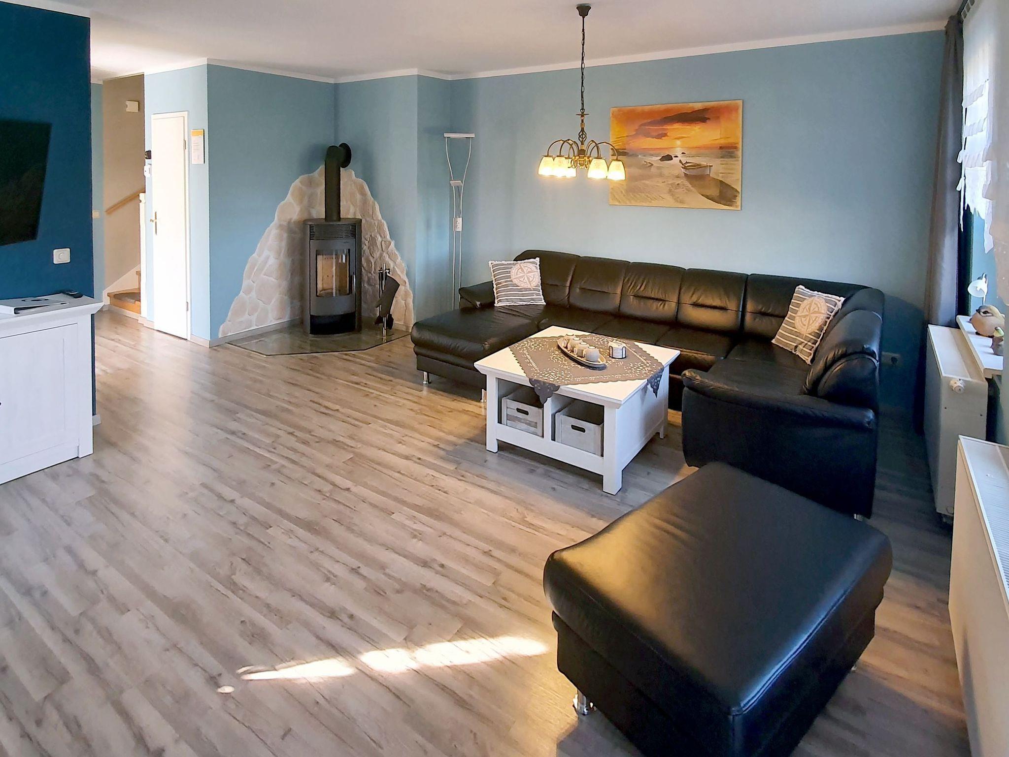 Im Erdgeschoss verfügt das angenehm helle Haus über ein großzügiges Wohnzimmer, das mit einem Couchtisch, einer gemütlichen Couchecke mit einem Kaminofen, einem großformatigen Flachbild-TV sowie einer Stereoanlage mit CD-Player ausgestattet ist. W-LAN ist im gesamten Haus verfügbar. Kaminholz befindet sich im Schuppen (Kasse des Vertrauens) bzw. kann im örtlichen Einzelhandel erworben werden.