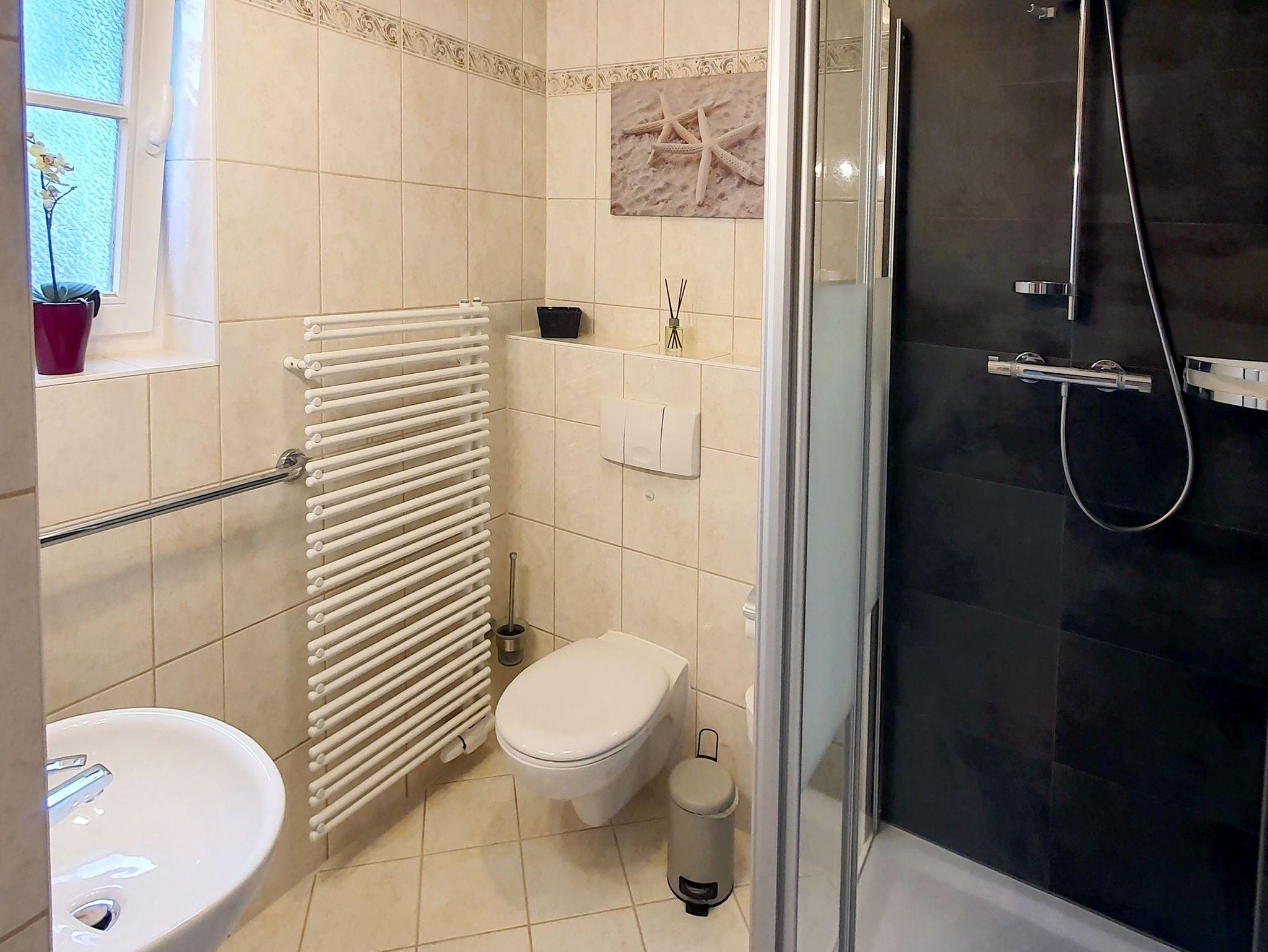 Ein direkt über den Flur zugängliches Bad mit Dusche/WC sowie Fön befindet sich ebenfalls im EG.
