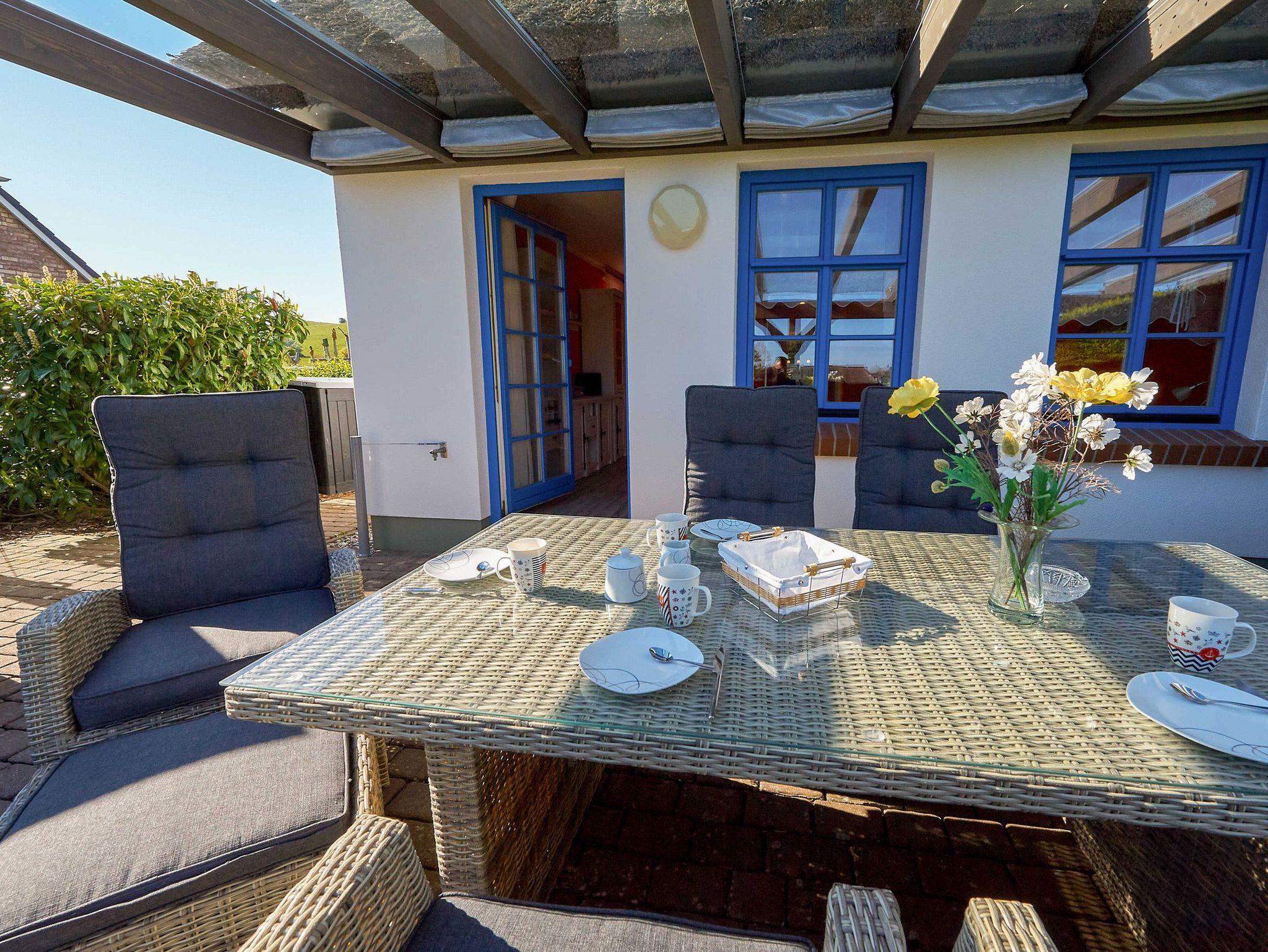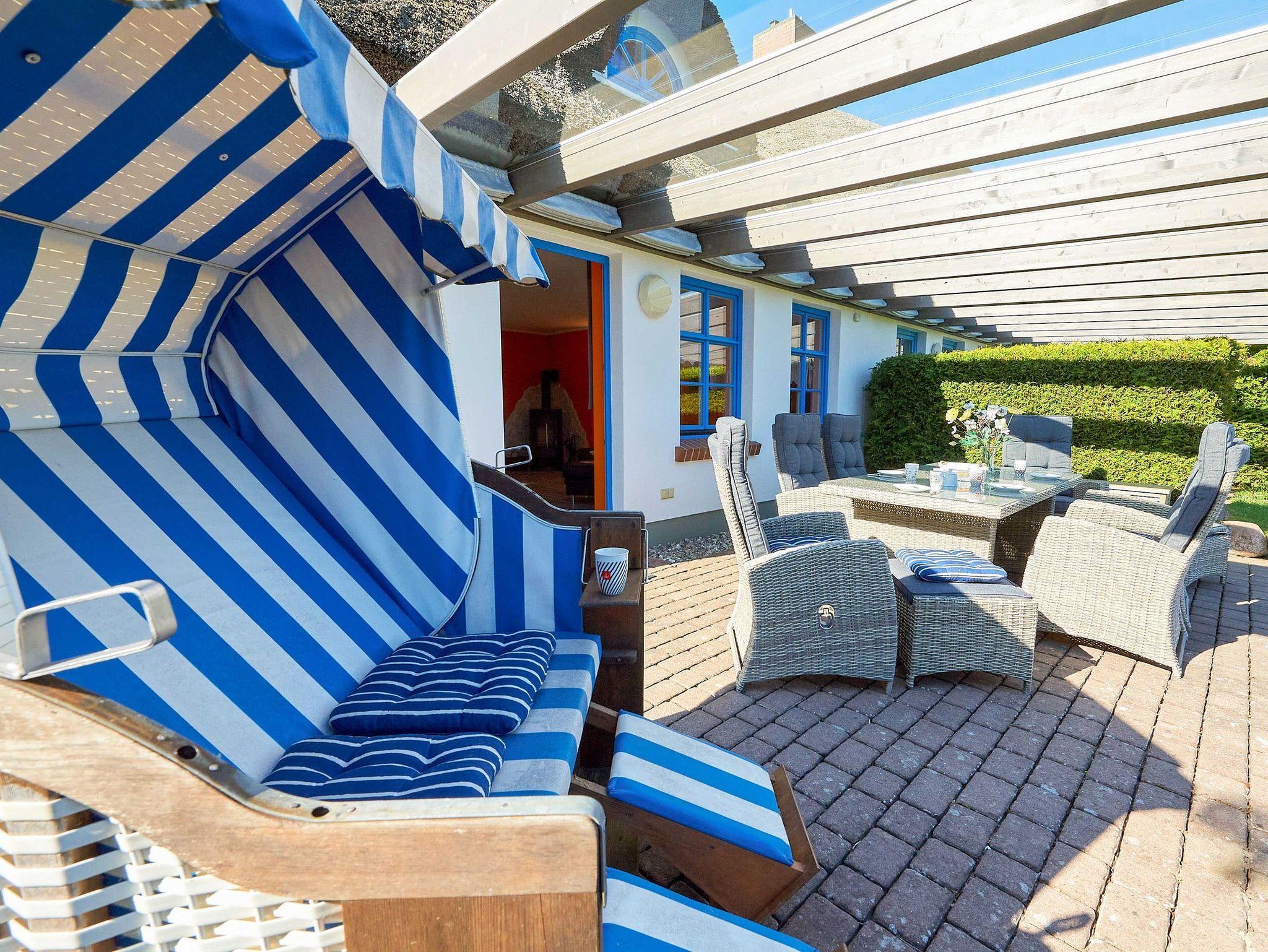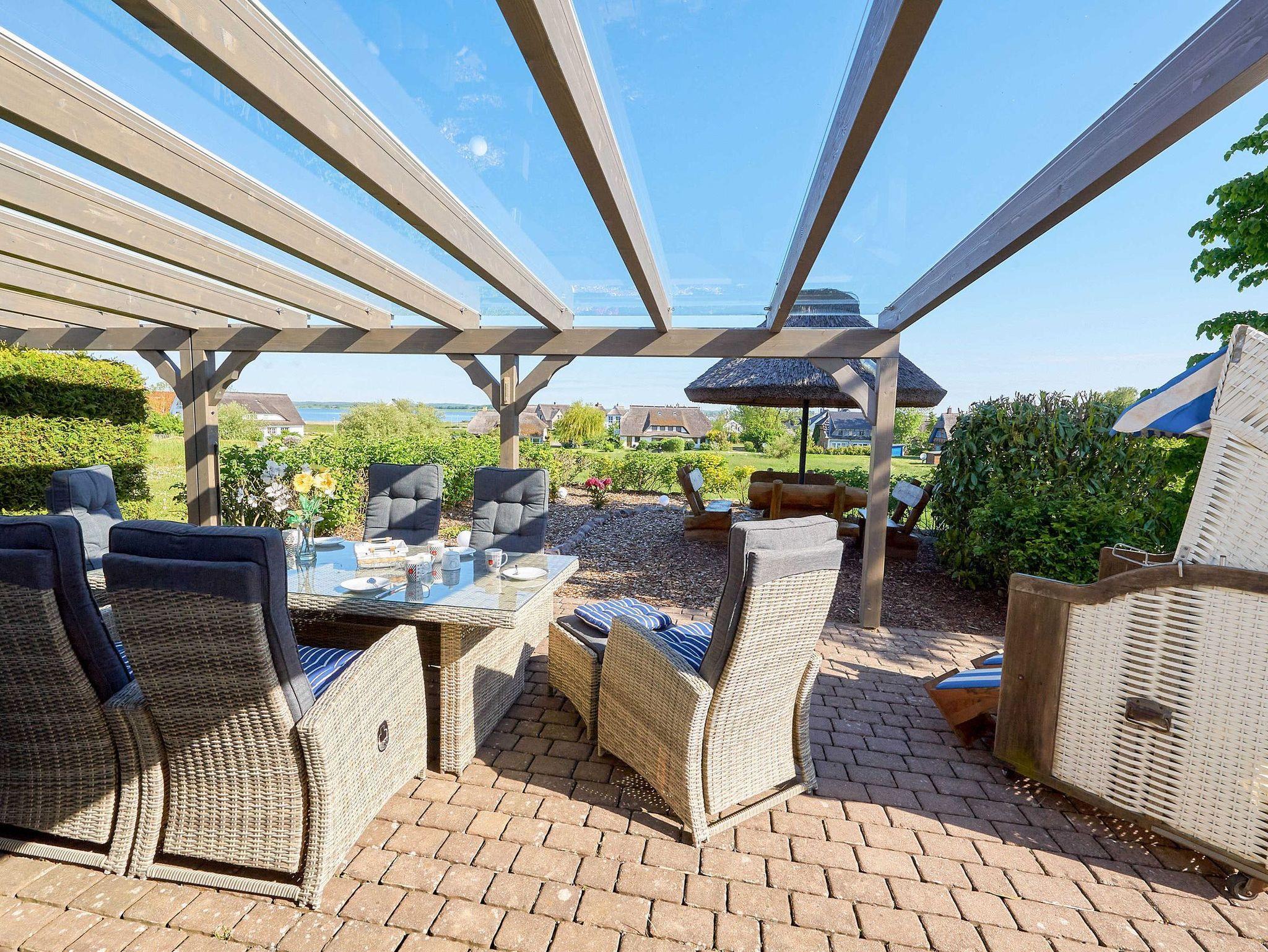 Zu den besonderen Highlights Ihres Urlaubsdomizils zählt ganz sicher die gemütliche möblierte, ca. 37 m² große und teilweise überdachte Terrasse zur Nord-West-Seite. Hier auf der Terrasse, im kuscheligen Strandkorb oder auf dem angrenzenden rustikalen Freisitz unterm Reetschirm lässt es sich wunderbar entspannen und den herrlichen Blick auf den nahen Bodden genießen.