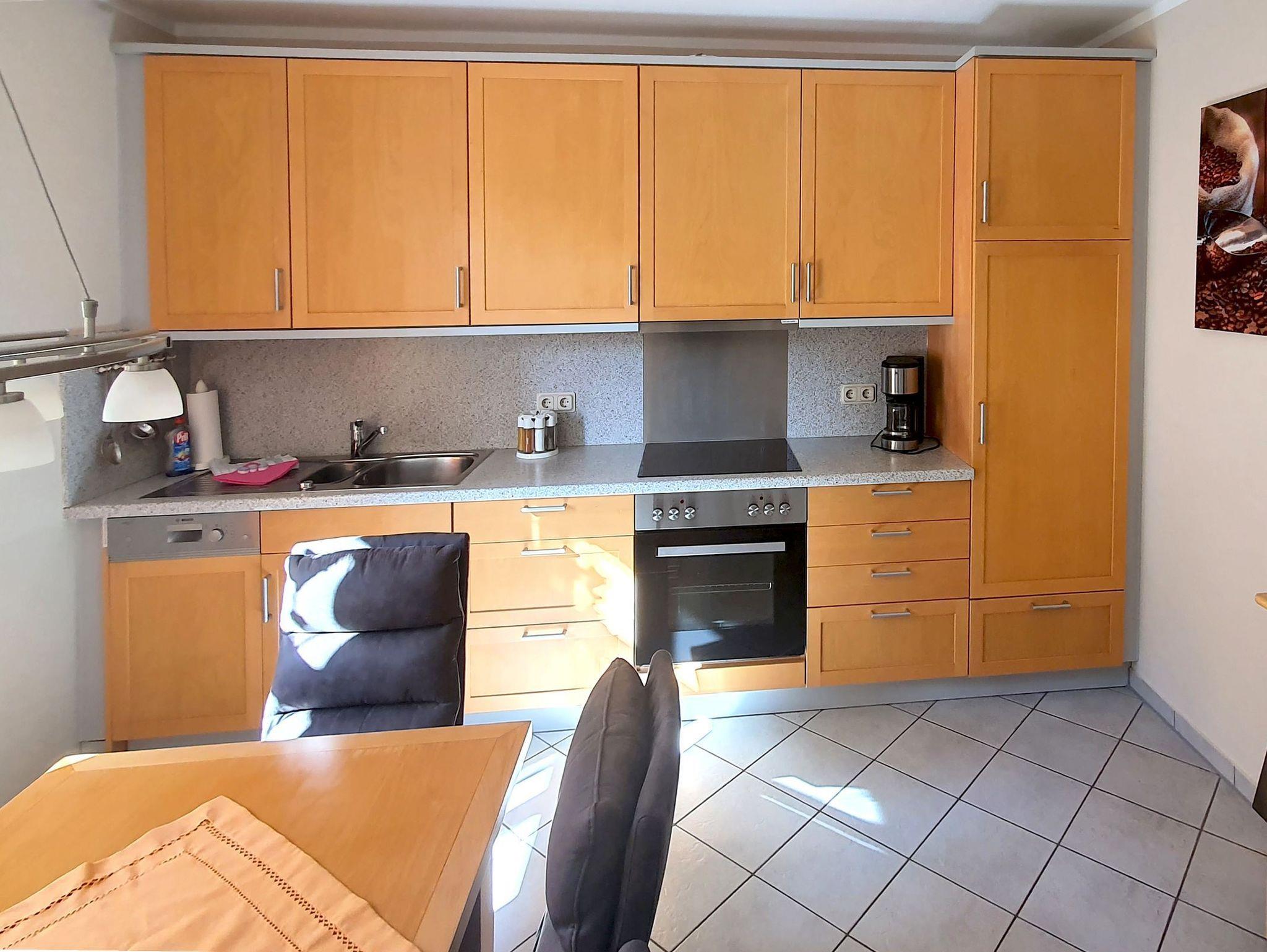 Die separate Küche mit Esstisch ist komplett mit einer modernen Küchenzeile ausgestattet. Sie enthält unter anderem einen Kühlschrank, Tiefkühlschrank, ein 4-Platten-Cerankochfeld, Backofen, Geschirrspüler, Kaffeemaschine, Toaster, Wasserkocher, Mikrowelle und jede Menge Kleininventar. Neben der Küche befindet sich ein Hauswirtschaftsraum mit Waschmaschine und Trockner zur kostenfreien Nutzung.