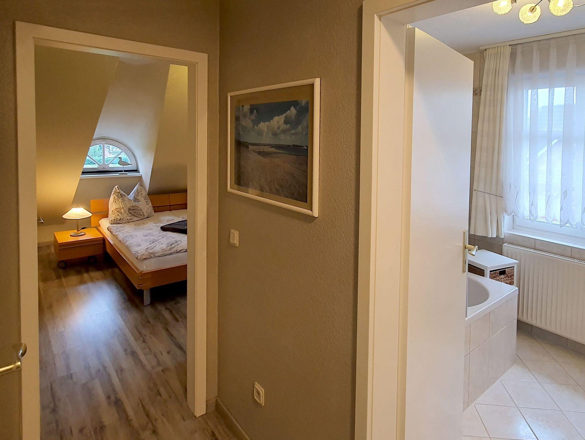 Im Obergeschoss finden Sie ein zweites Badezimmer, ausgestattet mit einer Bade-/Duschwanne, WC, Doppelwaschbecken und Haartrockner sowie zwei Schlafzimmer. Eines der Schlafzimmer unter gemütlichen Dachschrägen gewährt Ihnen einen direkten Blick auf den Bodden und ist mit einem komfortablen Doppelbett, einem Flachbild-TV mit DVD-Player incl. einer Auswahl an DVDs sowie einem großzügigen begehbaren Kleiderschrank nebst Safe für Ihre Wersachen ausgestattet.