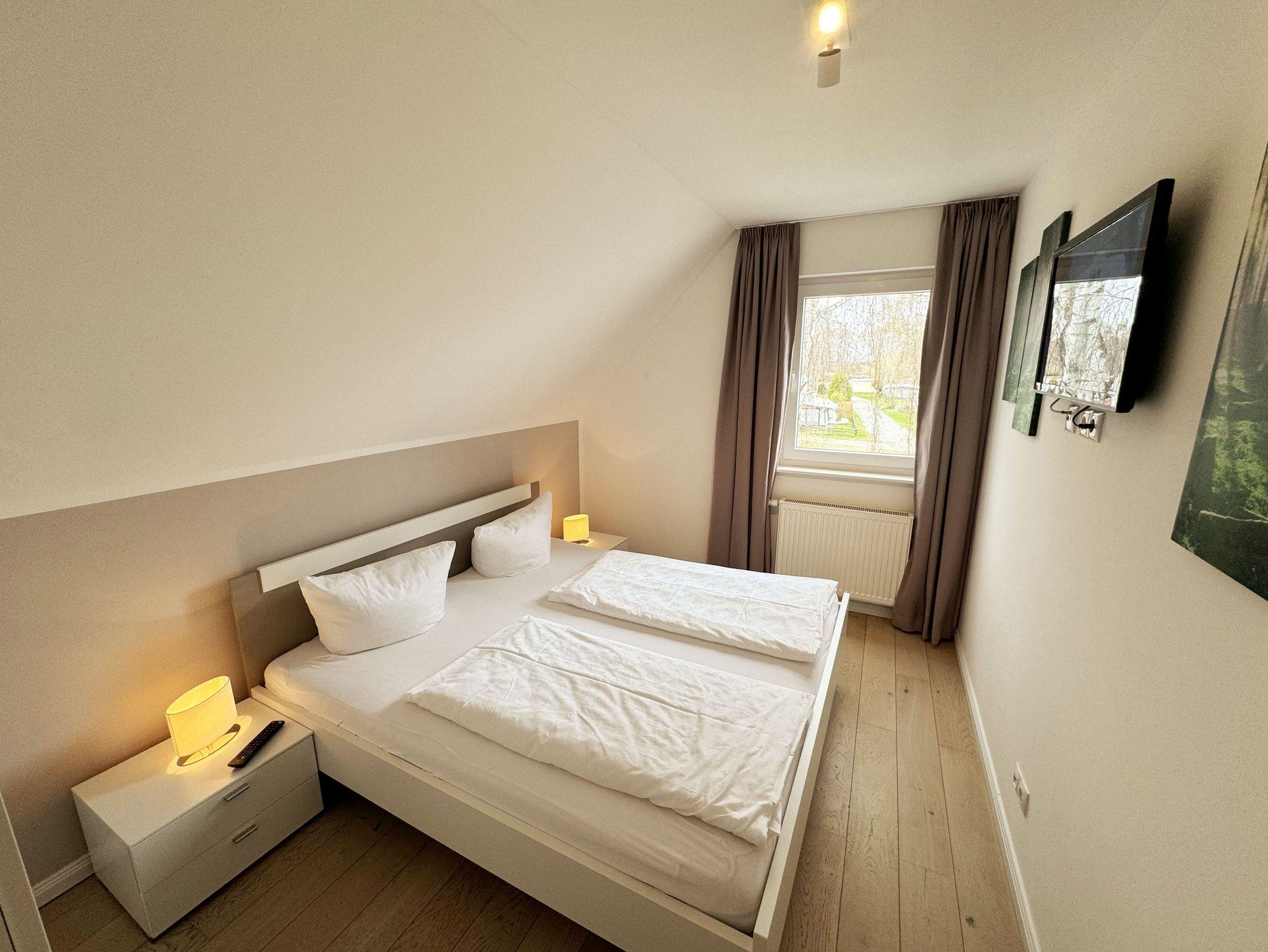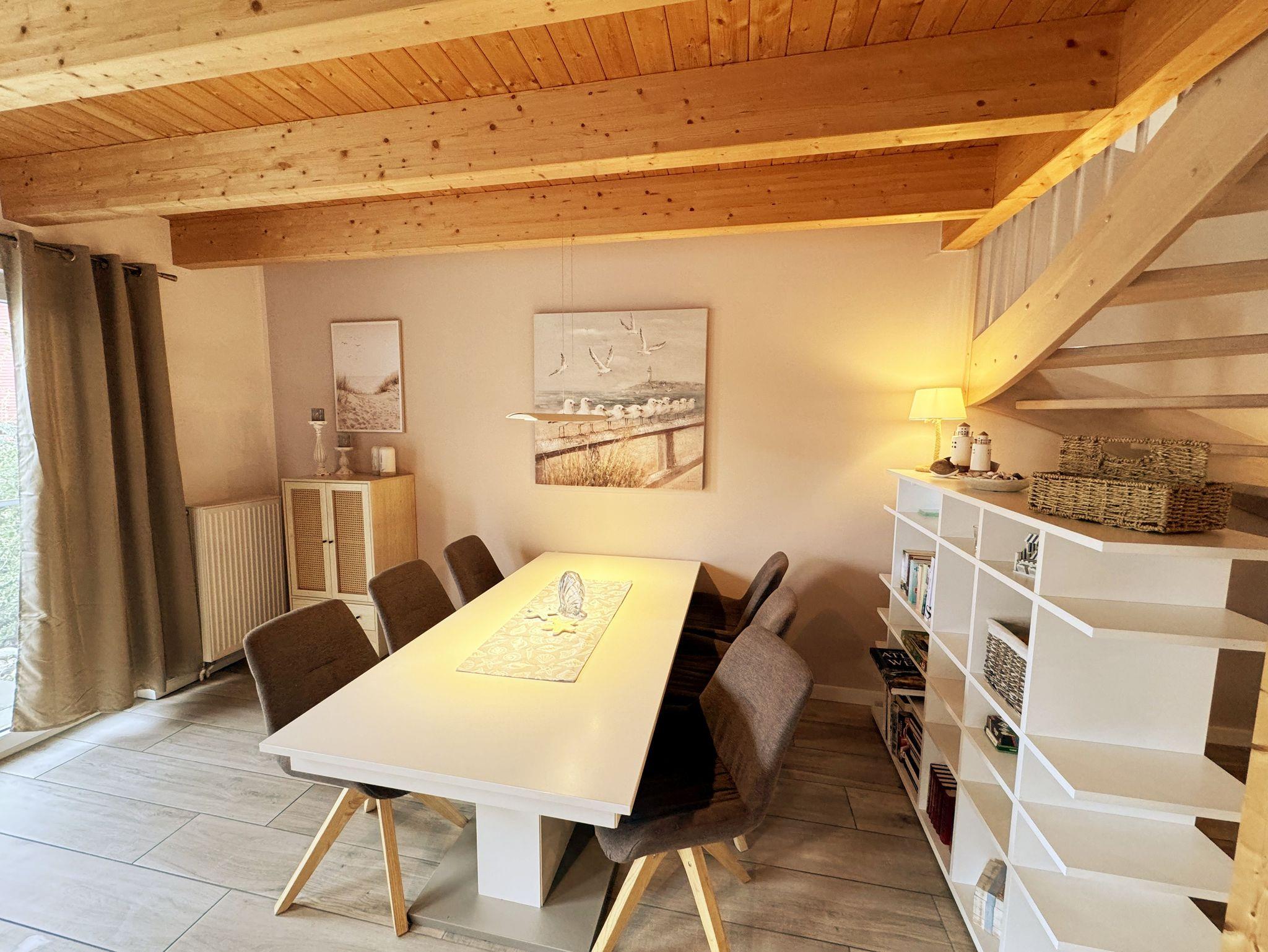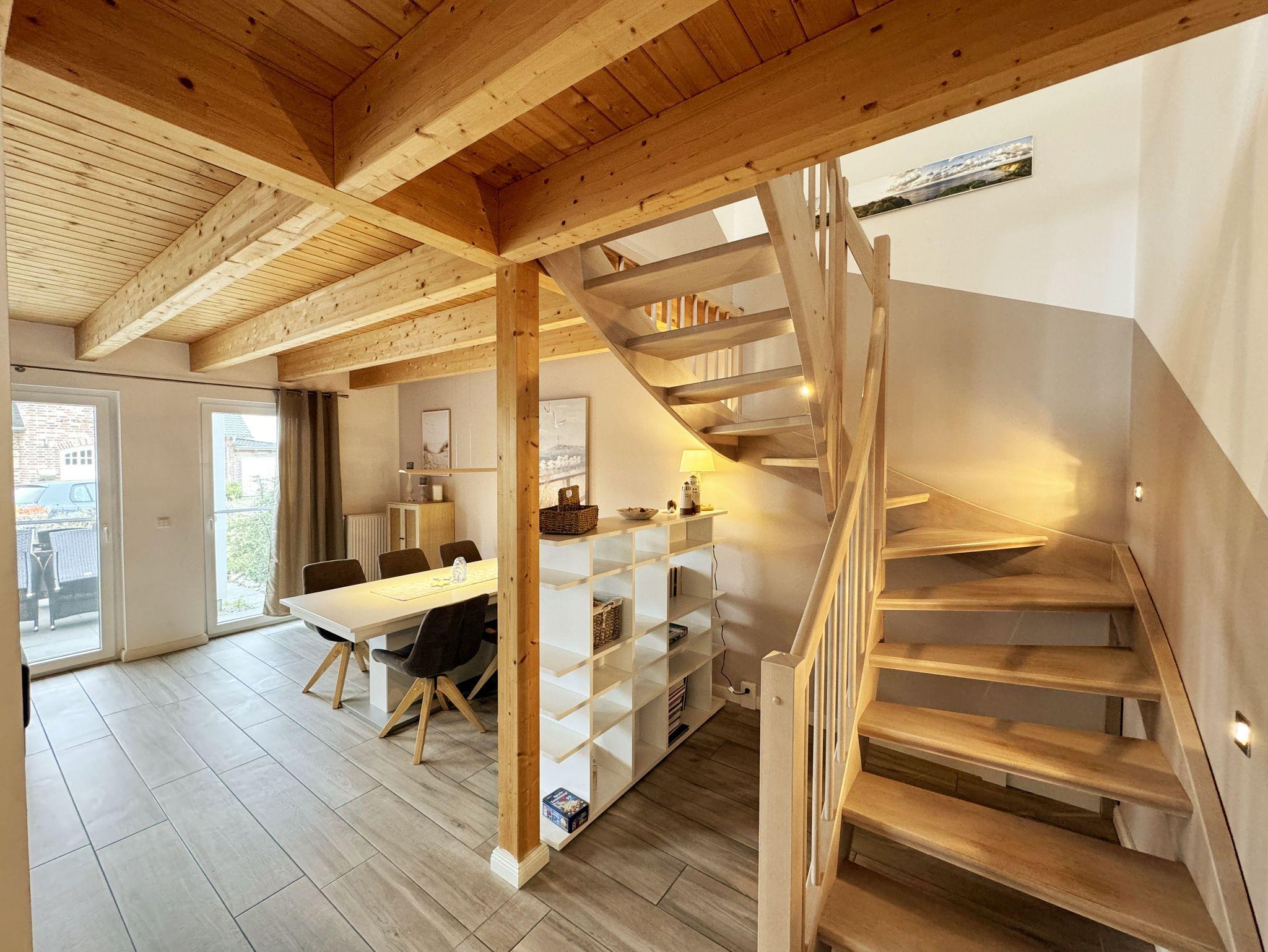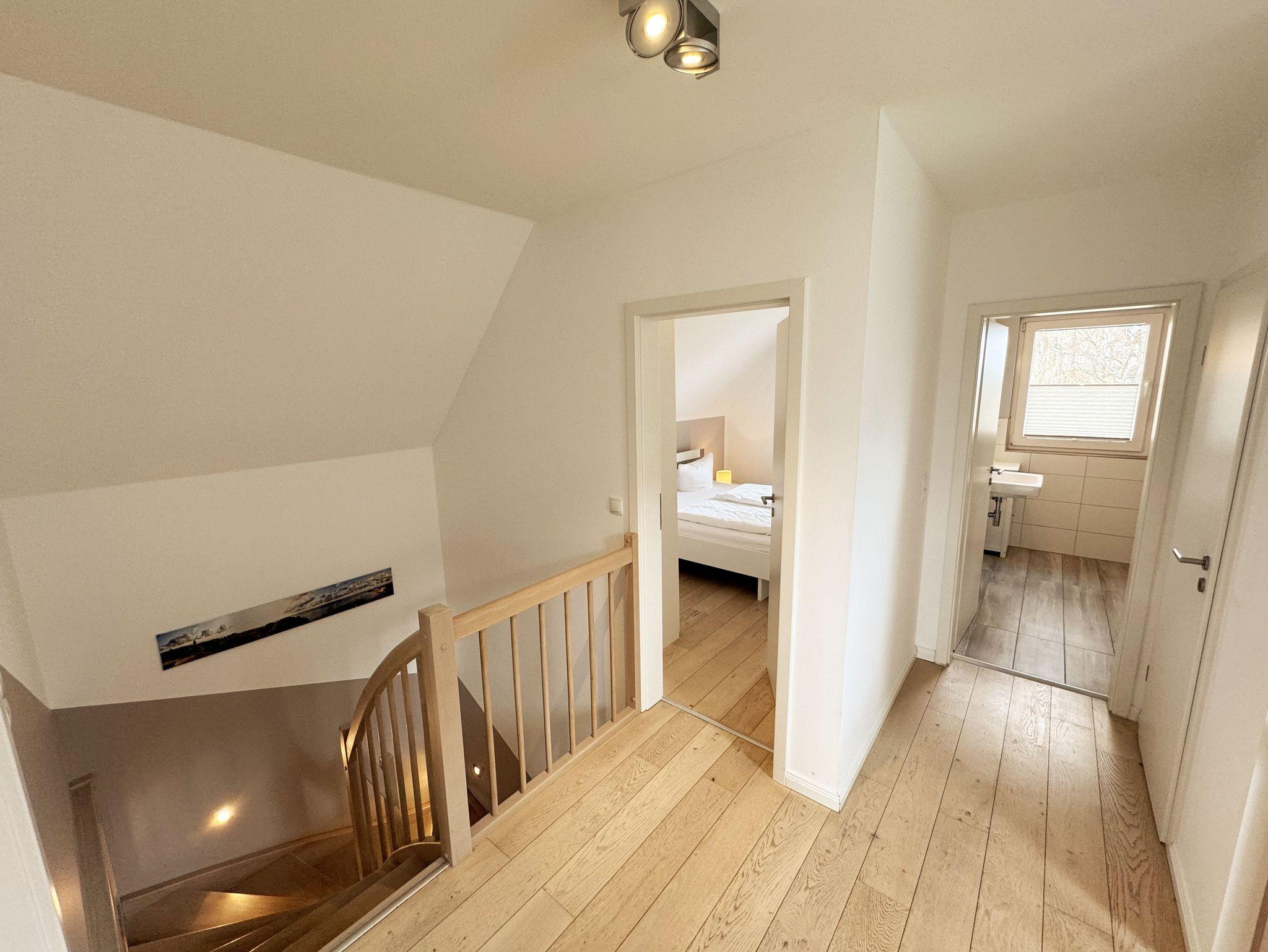 Das Haus Ilsebill im skandinavischen Stil bietet Ihnen auf zwei Etagen mit ca. 100m² Wohnfläche Platz für bis zu 6 Erwachsene und einem Kleinkind bis 3 Jahre im Kinderreisebett. Im hell und offen gestalteten Eingangsbereich bietet Ihnen eine Garderobe sowie ein Schuhschrank den ersten Stauraum. Im sich anschließenden gemütlich nordischen Wohn- und Essbereich, welcher durch bodentiefe Fenster den Blick auf den Vorgarten gewährt, bietet Ihnen eine gemütliche Couch mit Couchtisch und TV-Board die Möglichkeit, sich mit einem Buch zurückzuziehen. Oder Sie schauen auf dem Smart-TV Ihren Lieblingsfilm oder -Serie. Durch den Breitbandanschluss (WLAN) auch über Ihren gewohnten Streamingdienst. Für Musikliebhaber ist eine Stereoanlage mit Bluetooth und USB-Anschluss vorhanden. Um es sich in den kühleren Tagen gemütlich zu machen, steht ein holzbetriebener Schwedenofen bereit. Im Bücherregal finden Sie nicht nur Literatur über Rügen, sondern auch verschiedene Gesellschaftsspiele. Vom Wohnbereich geht es an der Diele und Treppe vorbei in Richtung Küchenzeile. Diese verfügt über ein Cerankochfeld, eine Spülmaschine, eine Mikrowelle, ein Kühlschrank mit Gefrierfunktion sowie einem Backofen, welcher sich auf einer angenehmen Arbeitshöhe befindet. Neben der gewohnten Küchenausstattung gehören zur weiteren Ausstattung ein Wasserkocher, eine Senseo-Kaffeemaschine, eine Filterkaffeemaschine, ein Mixer, ein Pürierstab, einen Eierkocher und ein Toaster. Ihre Mahlzeiten nehmen Sie im Essbereich am Esstisch mit modernen Drehstühlen ein. Ein Hochschrank mit Wein- und Wassergläsern sorgt für die Abrundung des leiblichen Wohls, so dass Sie bei einem entspannten Glas Wein den Tag Revue passieren lassen können. Über die Terrassentür geht es in den Vorgarten mit Sonnenausrichtung. Auf der Terrasse (Ost) lädt ein Holztisch, Rattan Stühle, ein Sonnenschirm sowie ein fest installierter Grill zu entspannten Abenden ein. Im Rasenbereich ist genug Platz für gemeinsame Spiele mit den Kindern oder dem Aufstellen des Wäscheständers. Das untere Tageslicht-Bad verfügt über eine Dusche, eine Badewanne, einen Waschplatz, ein WC, ein Fön, ein Badschrank und eine Sauna für 2-3 Personen und rundet damit die kleine Wellness-Landschaft ab. Die beleuchtete Wendeltreppe führt auf die Galerie im ersten Obergeschoss. Hiervon gehen 3 Schlafzimmer ab. Diese verfügen alle über jeweils ein Doppelbett (1,80m x 2,00m), mit einer Nachttischablage und Beleuchtung, einem Hochschrank, einer Kommode und einem Smart-TV. Von zwei Schlafzimmern kommen Sie auf den zur Sonnenseite ausgerichteten Holzbalkon (Ost), von dem Sie bereits einen Blick auf den Bodden und den malerischen Hafen haben. Alle Schlafzimmer und Räumlichkeiten verfügen zudem über bodentiefe Vorhänge und Insektenschutzgitter. Von der Galerie gelangen Sie in das zweite Tagelicht-Bad mit einer Dusche, einem WC, einem Waschplatz, einem Fön und einer Waschmaschine. Ein Abstellraum mit Reinigungsutensilien, ein Bügelbrett, ein Bügeleisen sowie Lagermöglichkeiten für Ihr Gepäck befindet sich im unteren sowie oberen Bereich. Für unsere kleinen Gäste steht ein Hochstuhl inklusive zur Verfügung. Ihre Vierbeiner sind gegen eine Gebühr herzlich willkommen. Der vorhandene Carport am Haus bietet Schutz für einen PKW. Ein weiterer Stellplatz ist zusätzlich für Sie inklusive. Ihre geliehenen oder auch mitgebrachten Fahrräder können Sie im Schuppen unterstellen. Die Erstausstattung eines Wäschepaketes (komplette Bettwäsche, 1 Duschhandtuch, 1 kleines Handtuch) können Sie bis 14 Tage vor Anreise gegen einen Aufpreis dazu buchen oder durch eigene Ergänzen. Ab 2 gebuchten Paketen erhalten Sie einmalig 1 Geschirrhandtuch und 1 Duschvorleger hinzu.