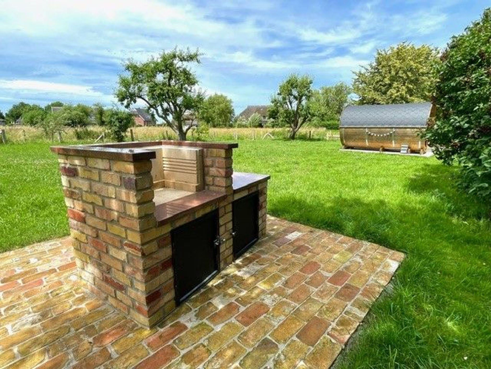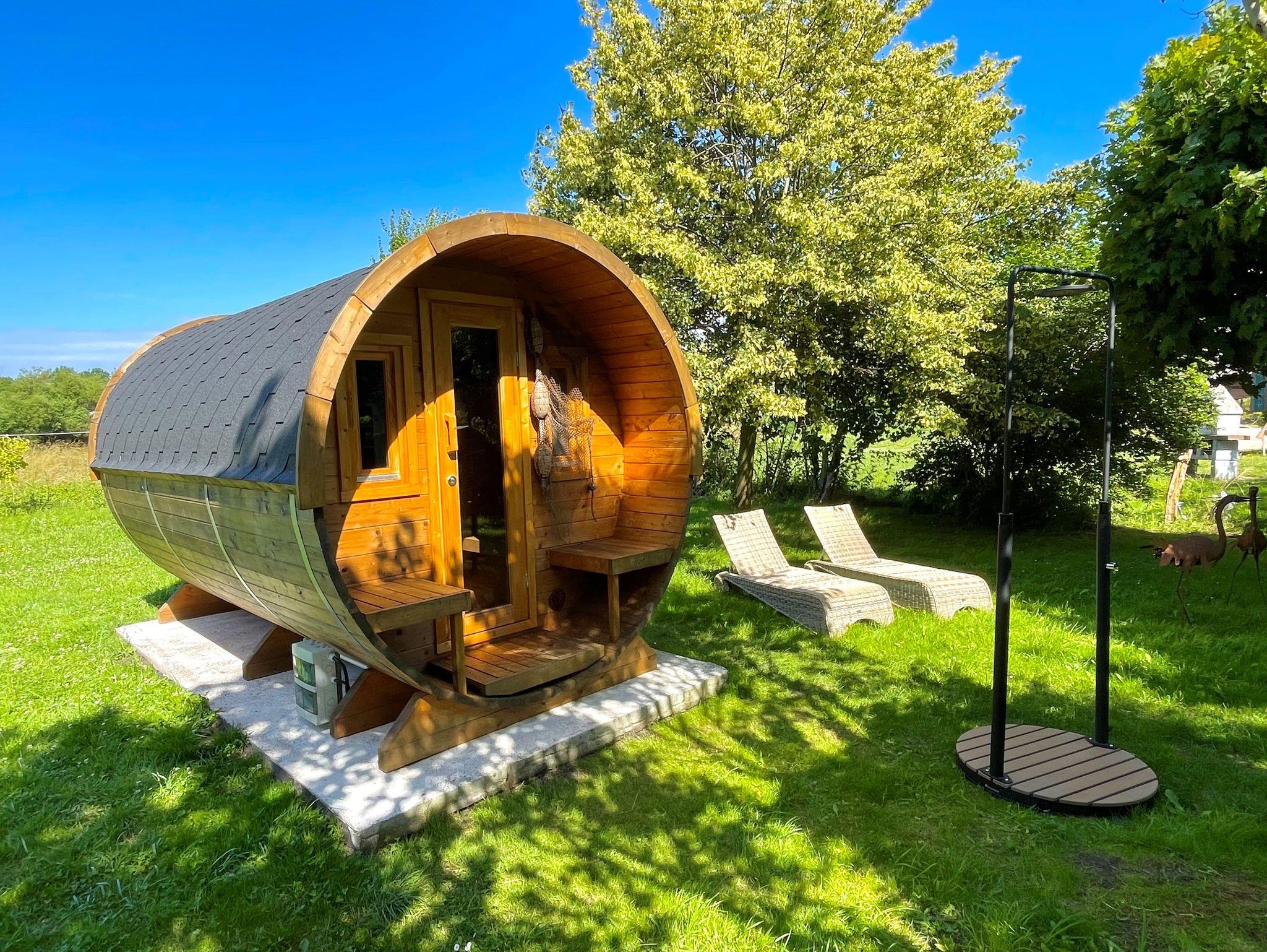 Im Garten befindet sich unsere Finn Art Fass-Sauna aus nordischem Fichtenholz. Die Fasssauna verfügt über ein Belüftungssystem, welches auf einer traditionellen, finnischen Bauweise beruht. Durch ihre runde Bauweise heizt sich die Sauna schnell auf und die Temperatur bleibt stabil. Über den elektrischen Saunaofen kann die Temperatur bis zu 100 Grad Celsius selbst reguliert werden. Die Sauna bietet Platz für bis zu 4 Personen und entsprechende Aufguss-Essenz wird für die Gäste bereitgestellt.