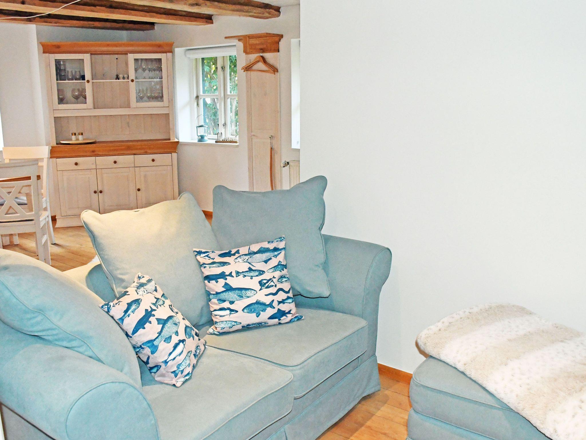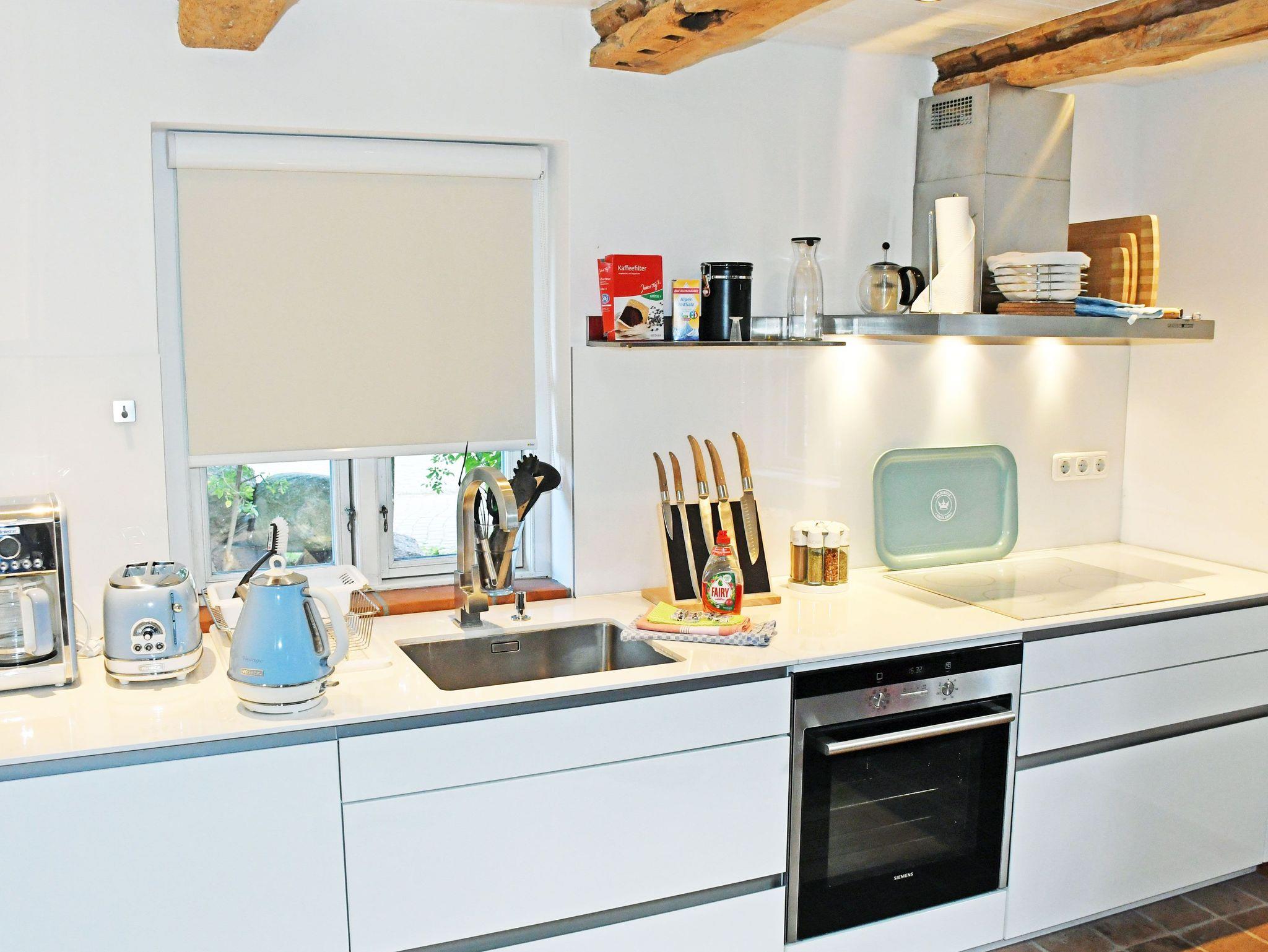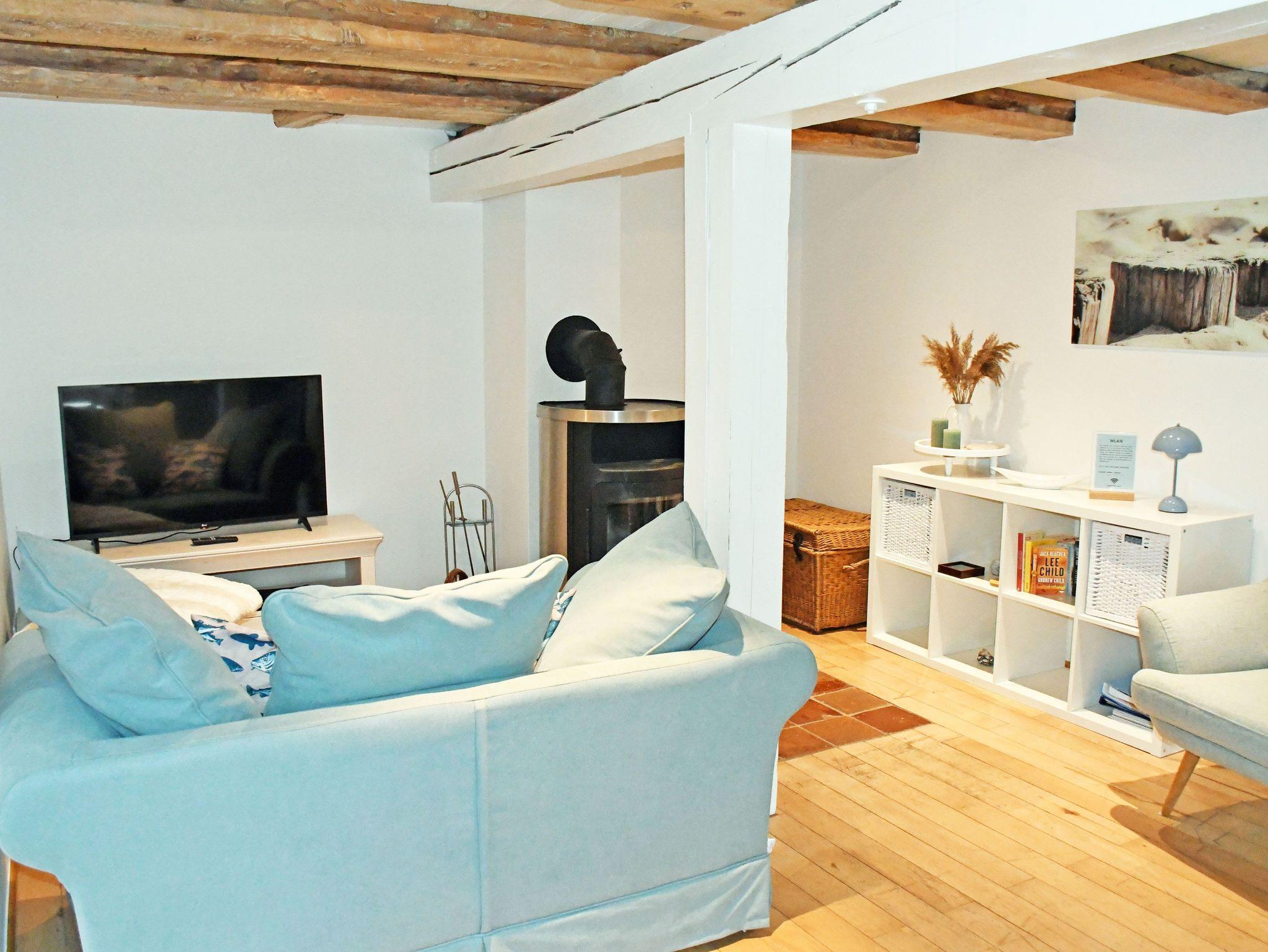 Der Wohnraum ist mit einem bequemen Sofa mit Tisch und einem modernen Smart-TV-Gerät ausgestattet. Ein Kaminofen sorgt vor allem in der kälteren Jahreszeit für zusätzliche Behaglichkeit. (Kaminholz ist nicht vorhanden) Die offene Küchenzeile ist mit einem Backofen, Ceranfeld-Herd, Geschirrspüler, Wasserkocher, Kaffeemaschine, Toaster und Kühlschrank ausgestattet. Eine kleine Essecke lädt zum gemeinsamen Verweilen ein. Über das Wohnzimmer erreichen Sie die anliegende Terrasse mit Gartenmöbeln und Strandkorb, von der Sie den Ausblick in den Garten oder in die Zicker Berge genießen können.