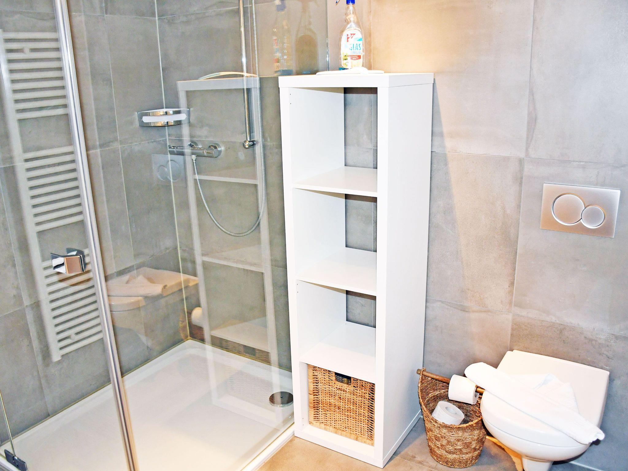 Das barrierefreie Badezimmer im Erdgeschoss ist mit Dusche, WC und Waschbecken ausgestattet. Im Obergeschoss befindet sich zudem ein kleines Gäste-WC.