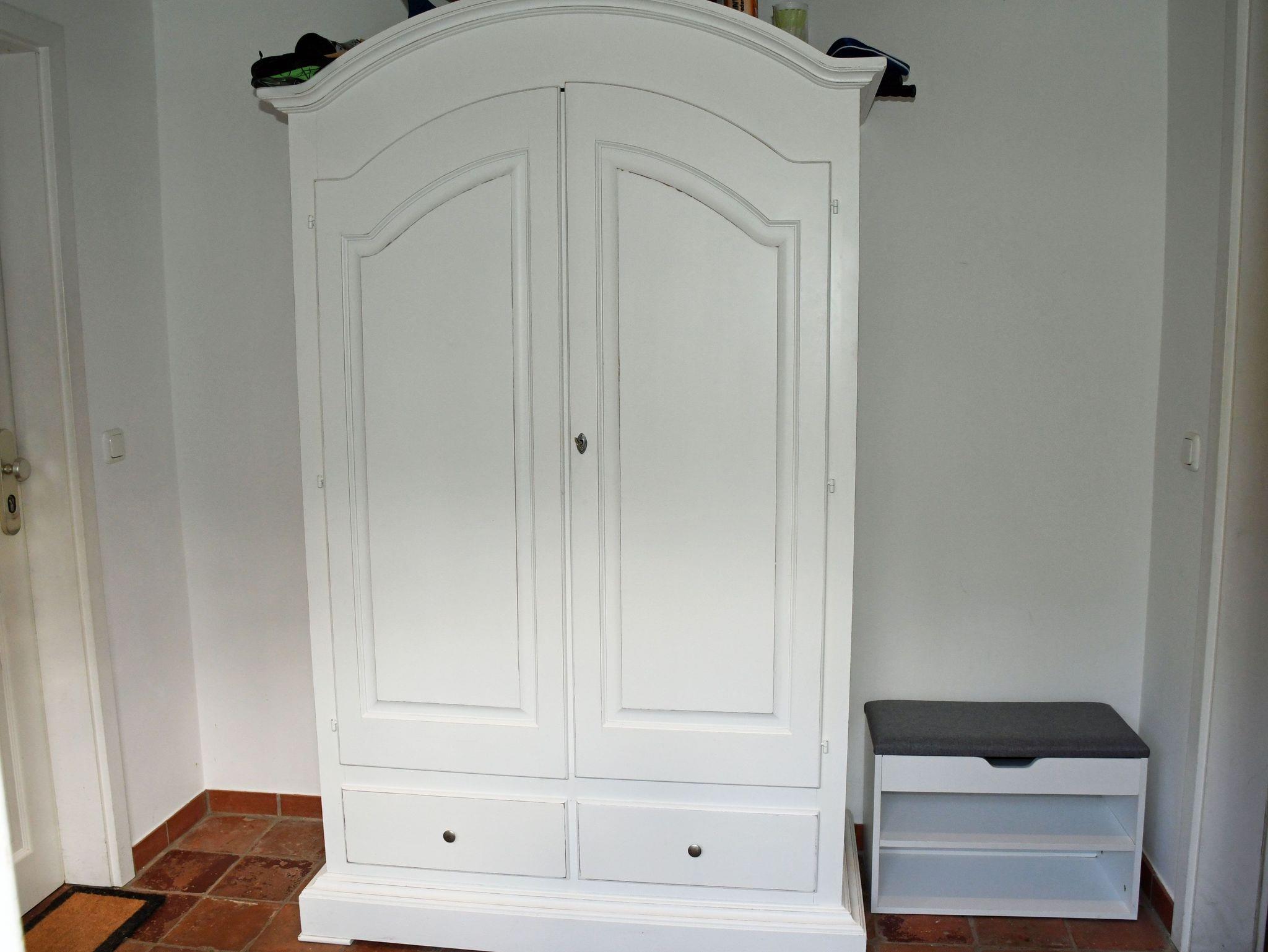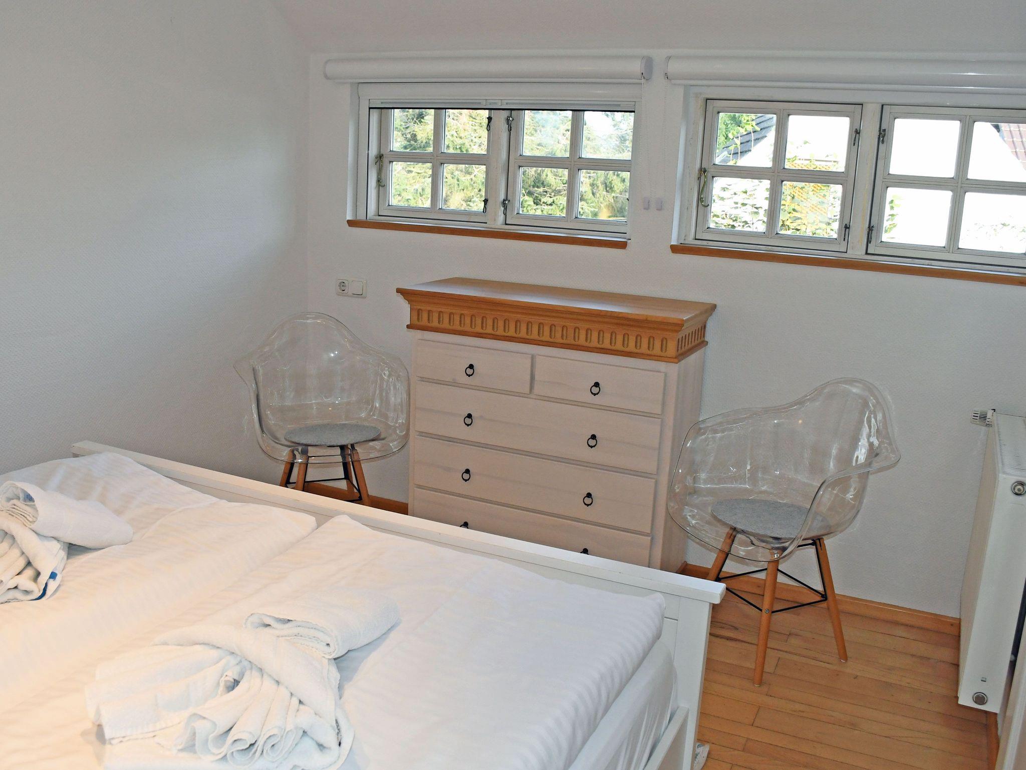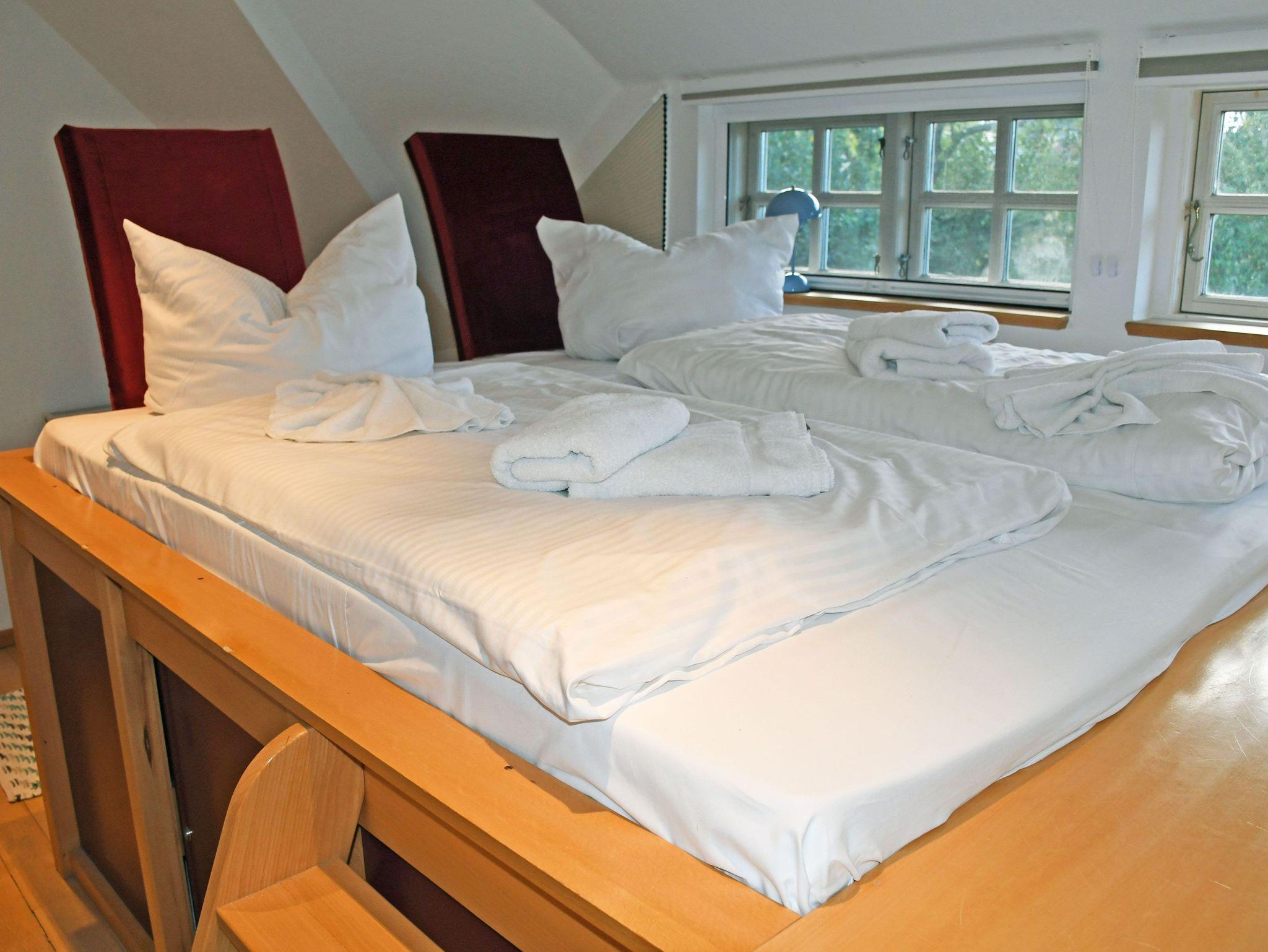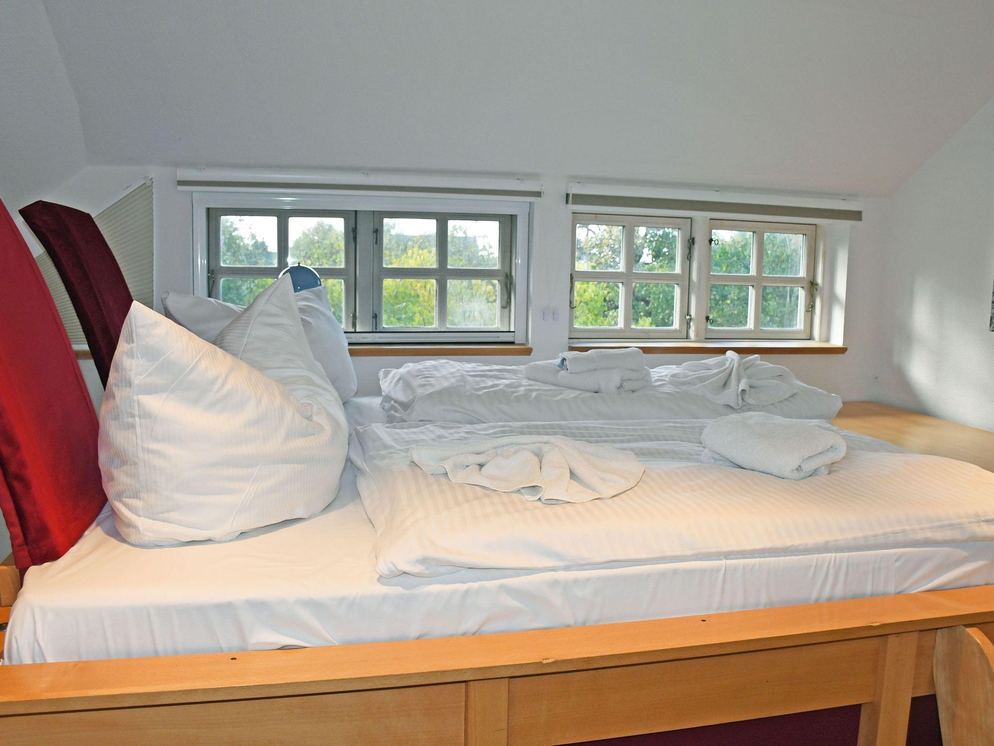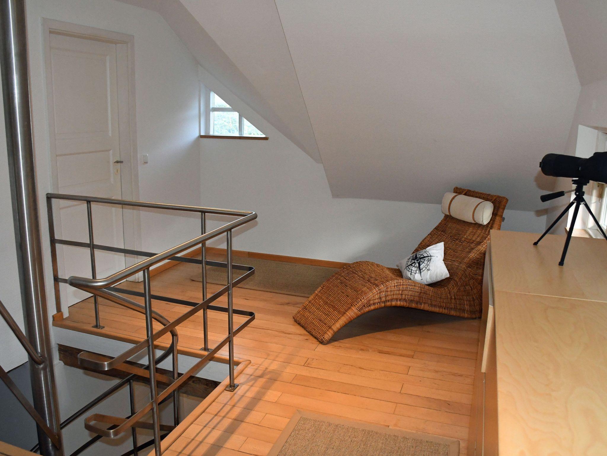Die zwei Schlafzimmer im Obergeschoss erreichen Sie über eine Wendeltreppe. Sie verfügen über je ein Doppelbett, Nachtische und Kleiderschränke. Ein besonderes Highlight stellt unser Hochbett dar, welches bei gutem Wetter einen Blick auf den Rügenschen Bodden und den hauseigenen Garten ermöglicht.
