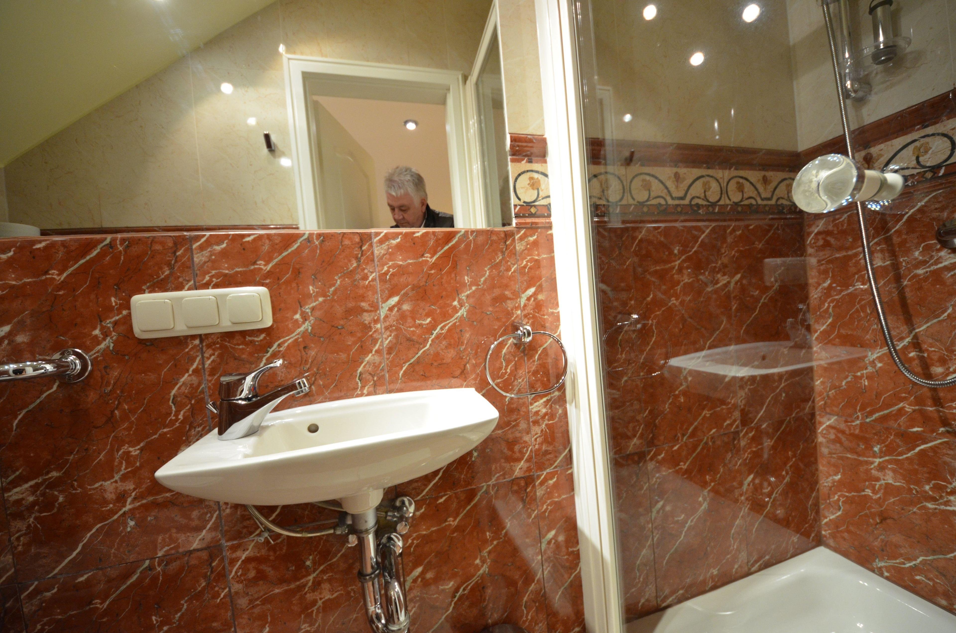 Fußbodenheizung, Naturstein - Abdeckungen, große Spiegel, schöne
