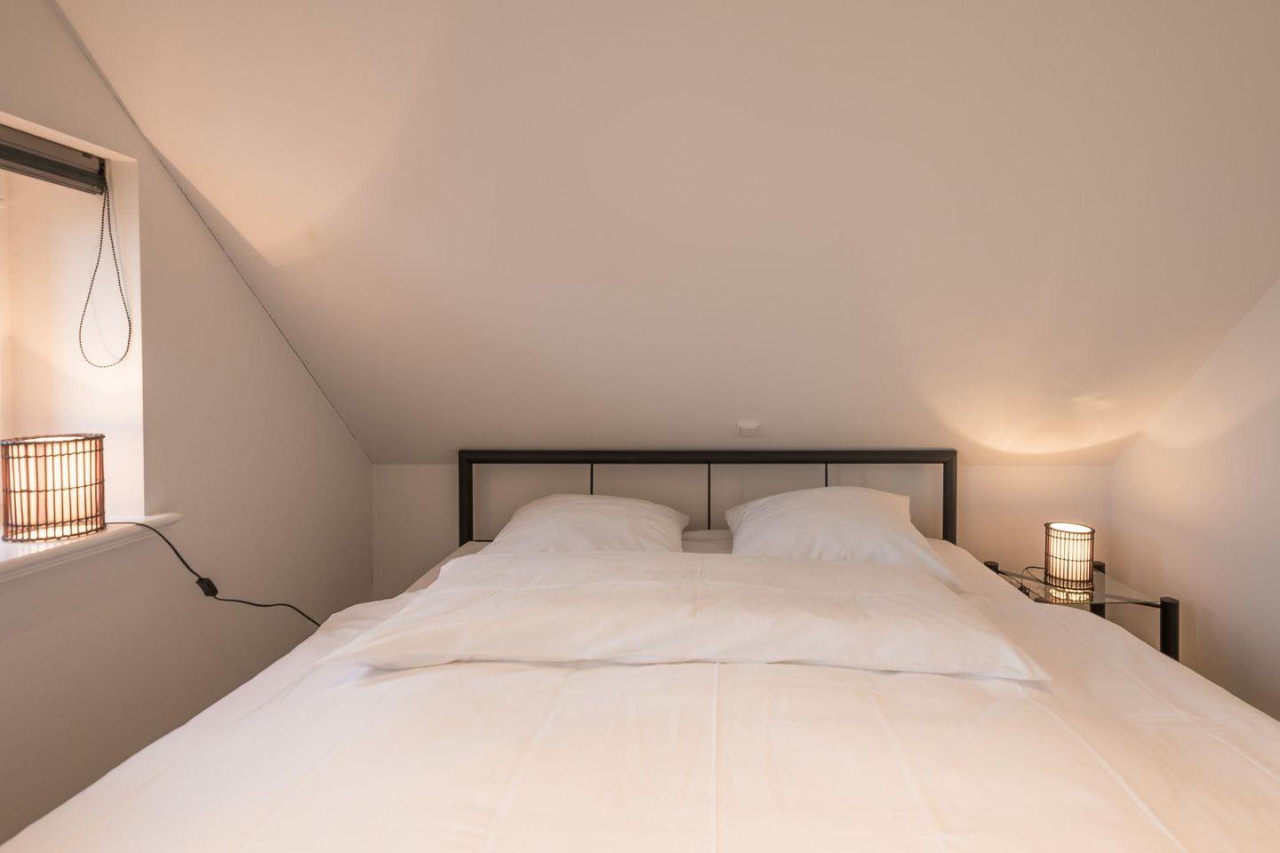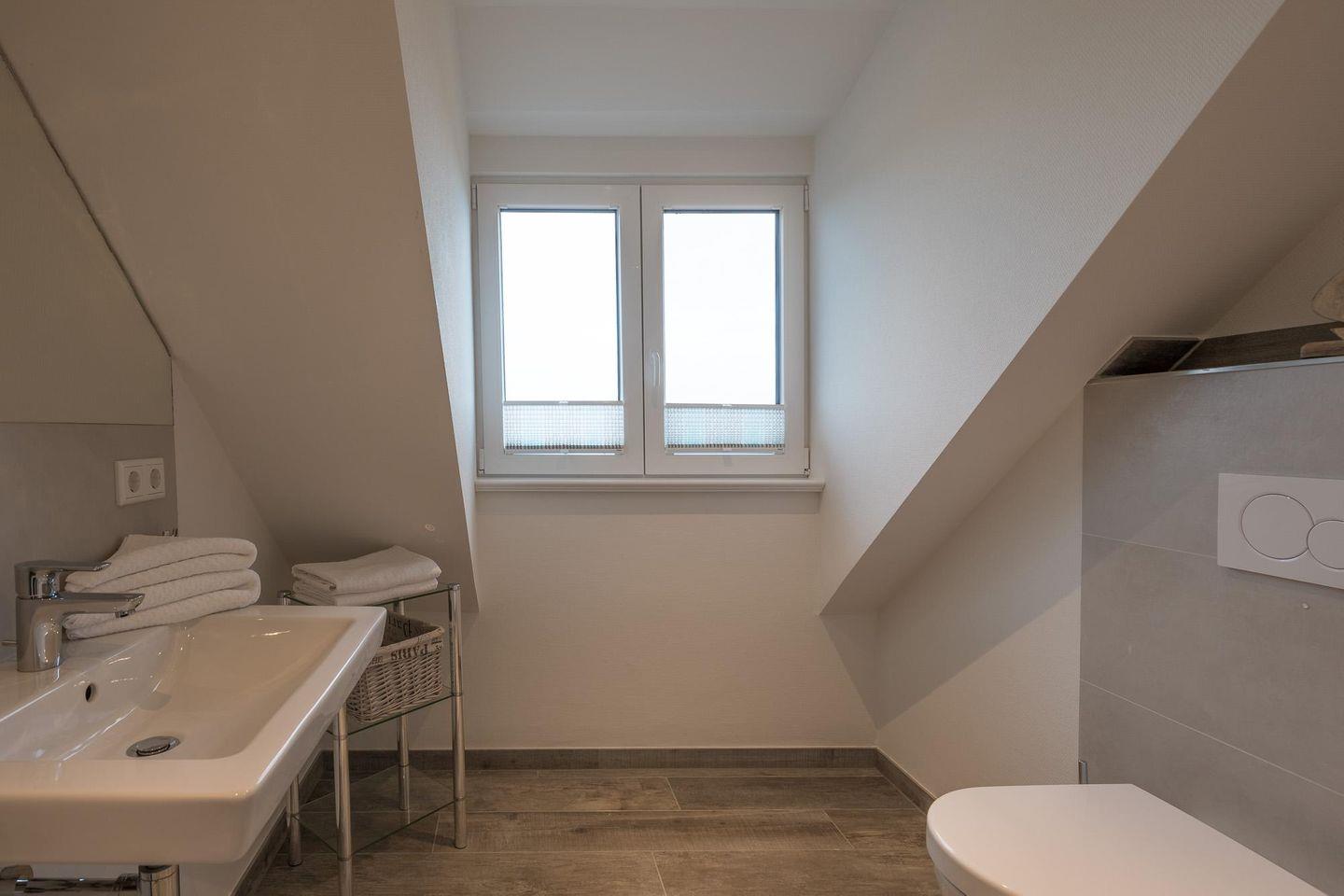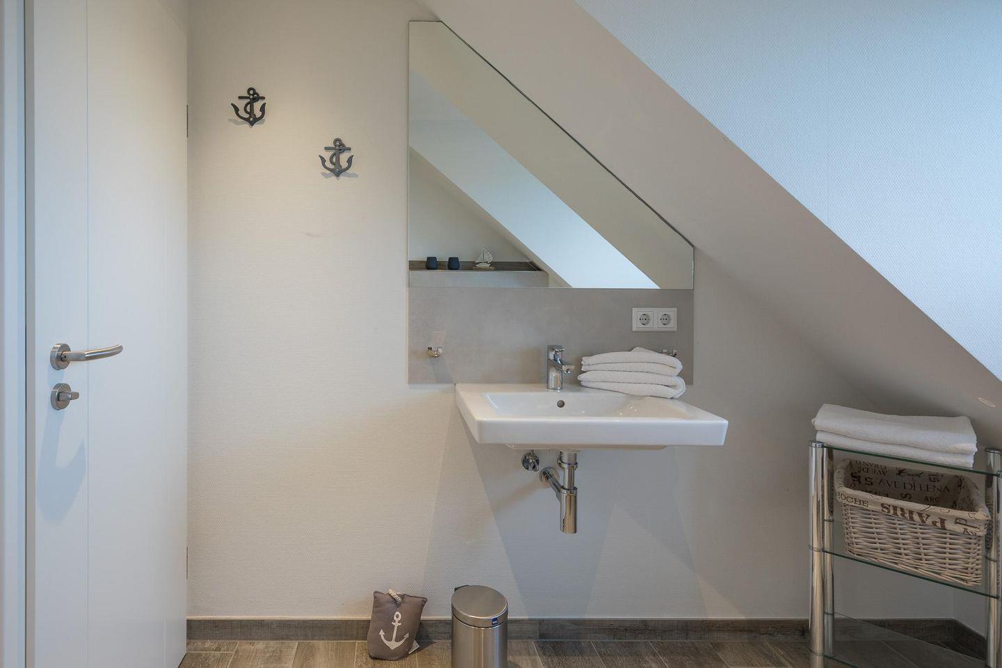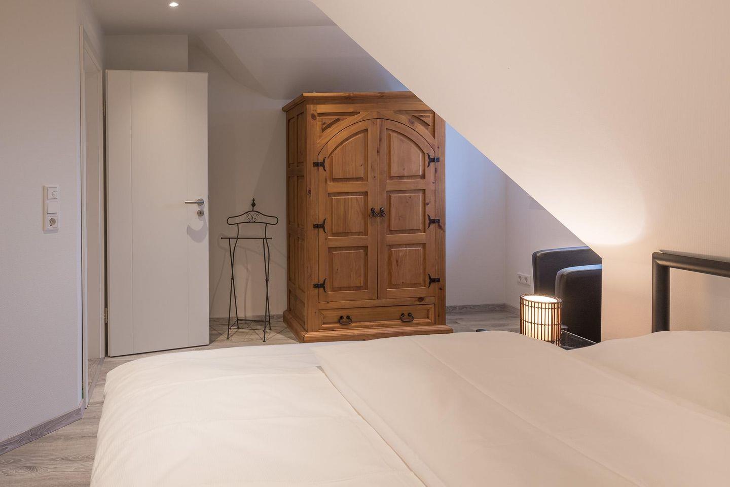 Über eine Holztreppe erreichen die drei Schlafräume: Die beiden größeren Schlafzimmer sind mit einem Doppelbett (180 × 200), eines davon mit TV und das kleine Schlafzimmer mit einem Einzelbett (90 × 200) ausgestattet. Ebenfalls im 1. OG befindet sich das Duschbad mit WC.