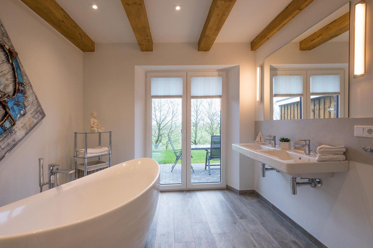 Ein Hauswirtschaftsraum mit Waschmaschine (kostenpflichtig) und Trockner und ein großzügiges Bad mit frei stehender Badewanne runden das Bild ab.