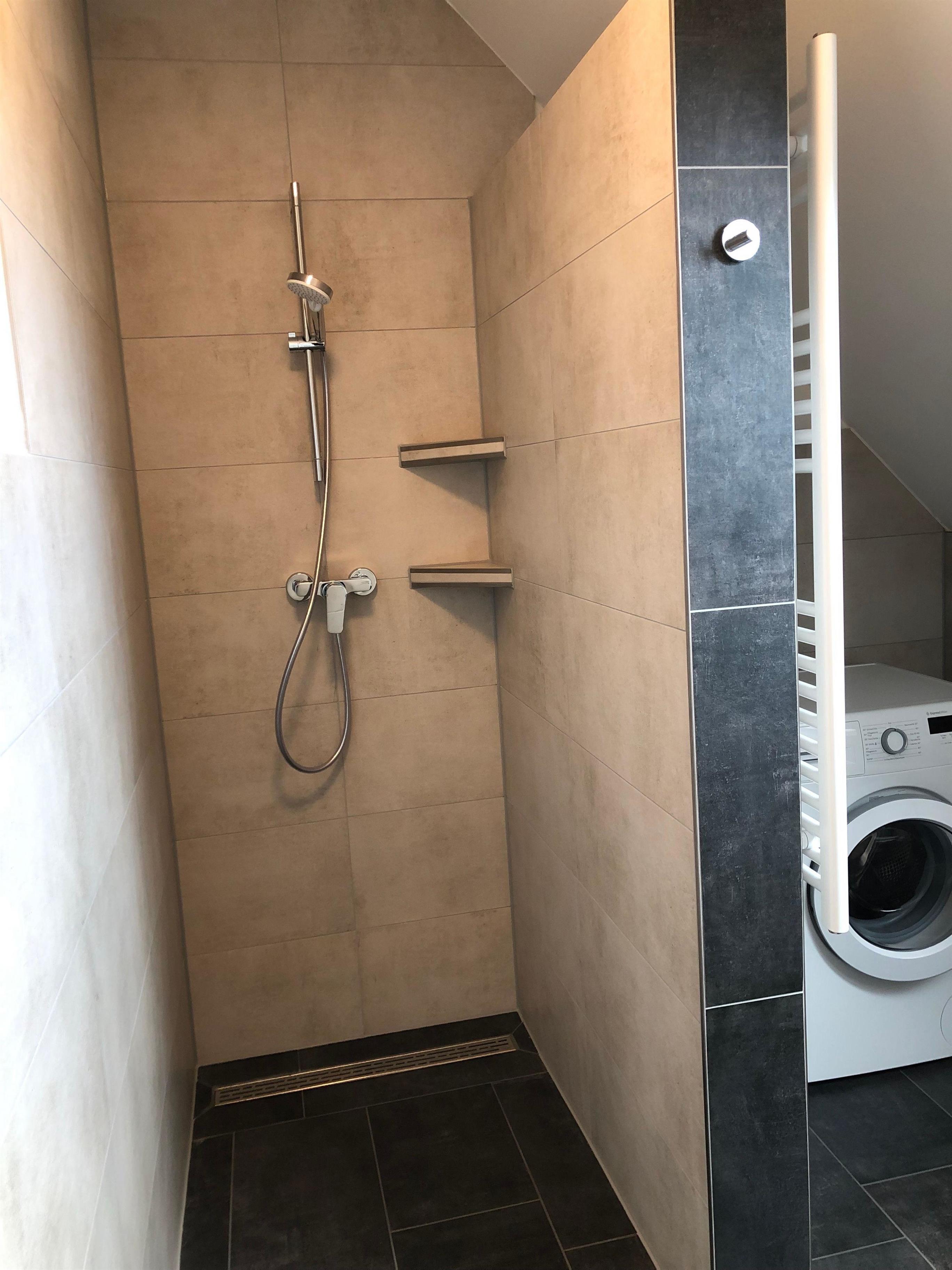 Alle Schlafräume und der Flur im Obergeschoss sind mit Echtholz-Fußboden ausgestattet. Wohn- und Essbereich, sowie Flur sind mit modernen, pflegeleichten Fliesen in Holzoptik ausgestattet. Das Bad besticht durch den anthrazit-farbigen Boden und die hellen Wände.