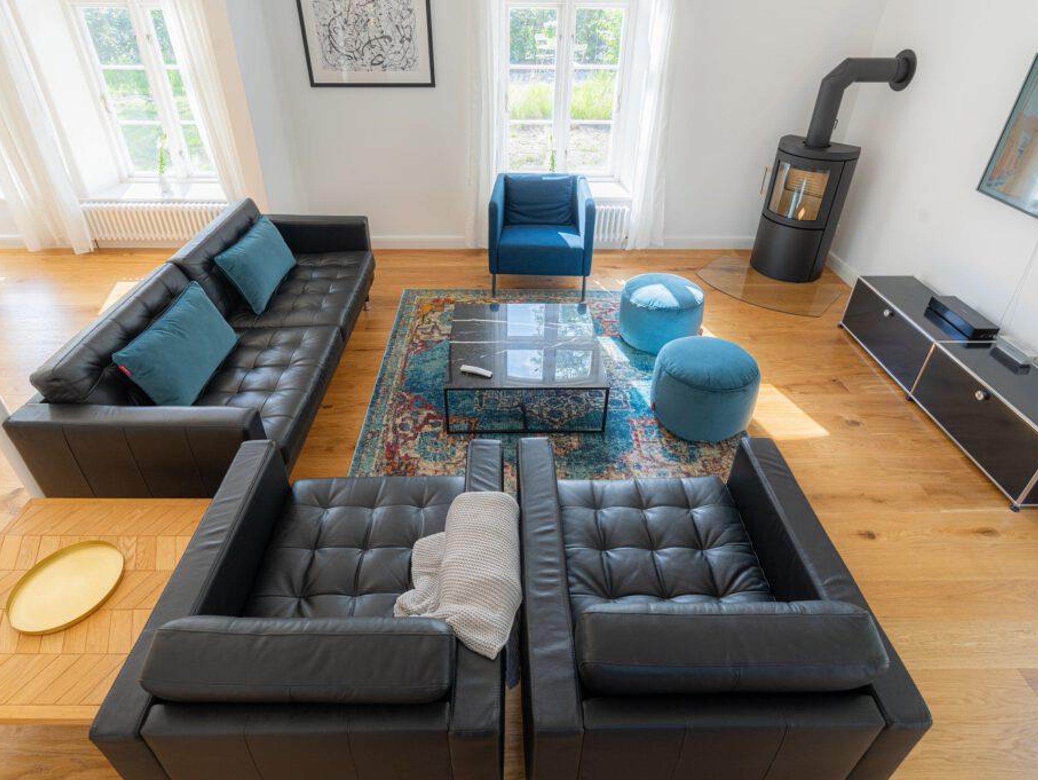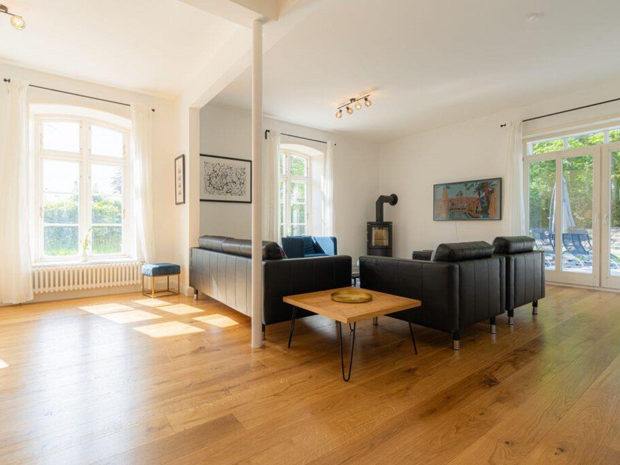 Großes Wohnzimmer (50 qm): Kaminofen, Smart-TV (inkl. Magenta-TV), Bose Bluetooth-Box, Leseecke.
