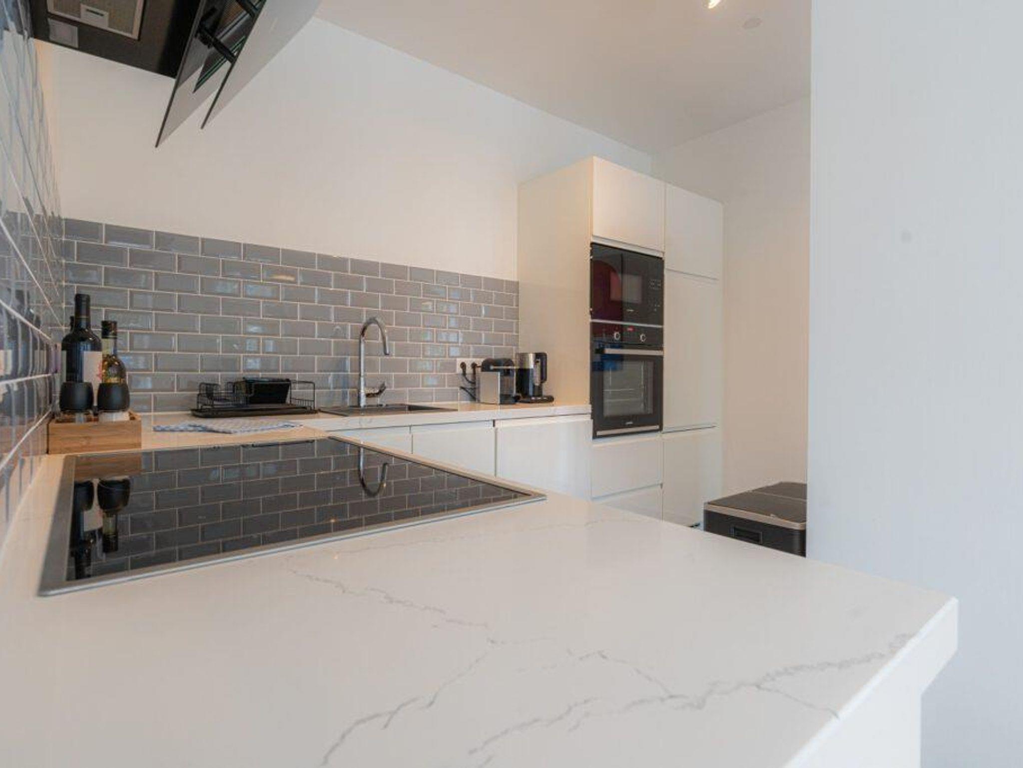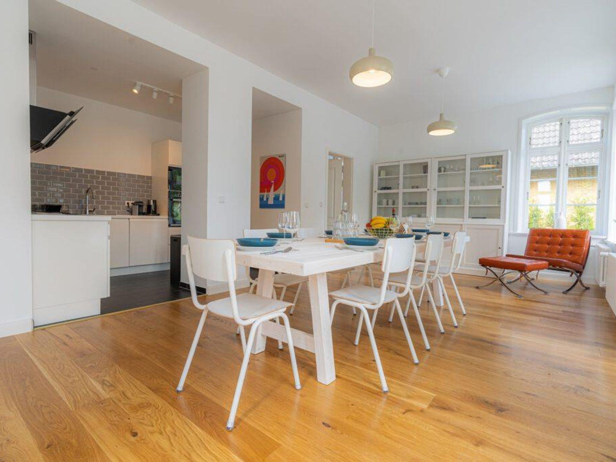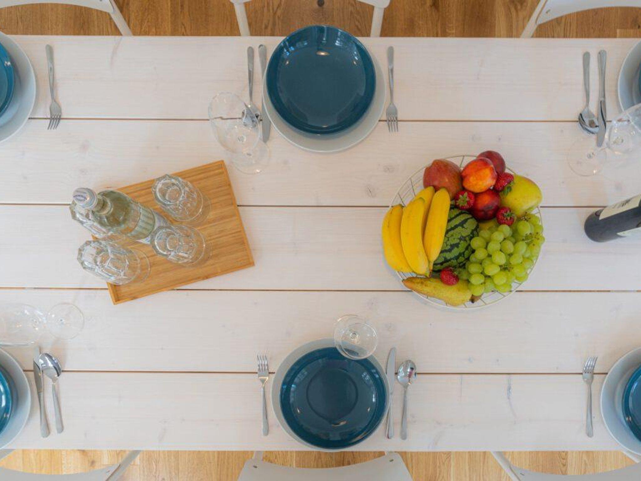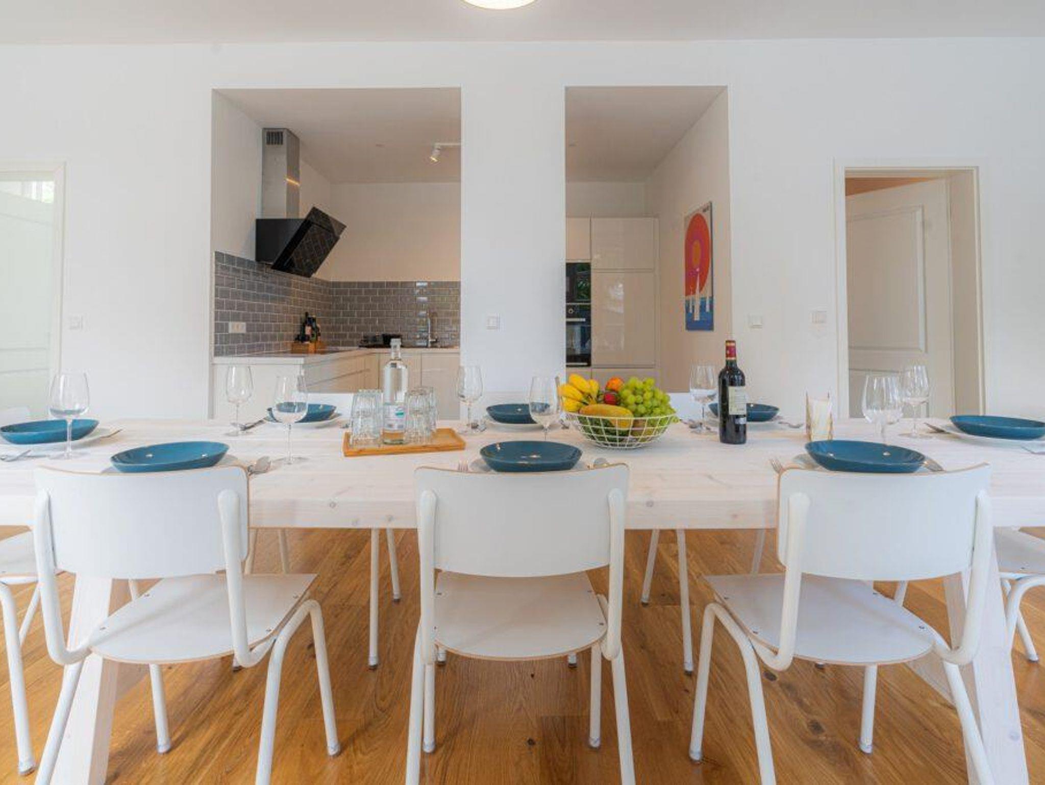 Große offene Essküche (40 qm): 3 m Esstisch, Küche mit Kühlgefrierkombi, Spülmaschine, Espressomaschine, Eiswürfelmaschine, Mikrowelle, Wasserkocher, Toaster und extra breitem Induktionskochfeld, Kindersitz.