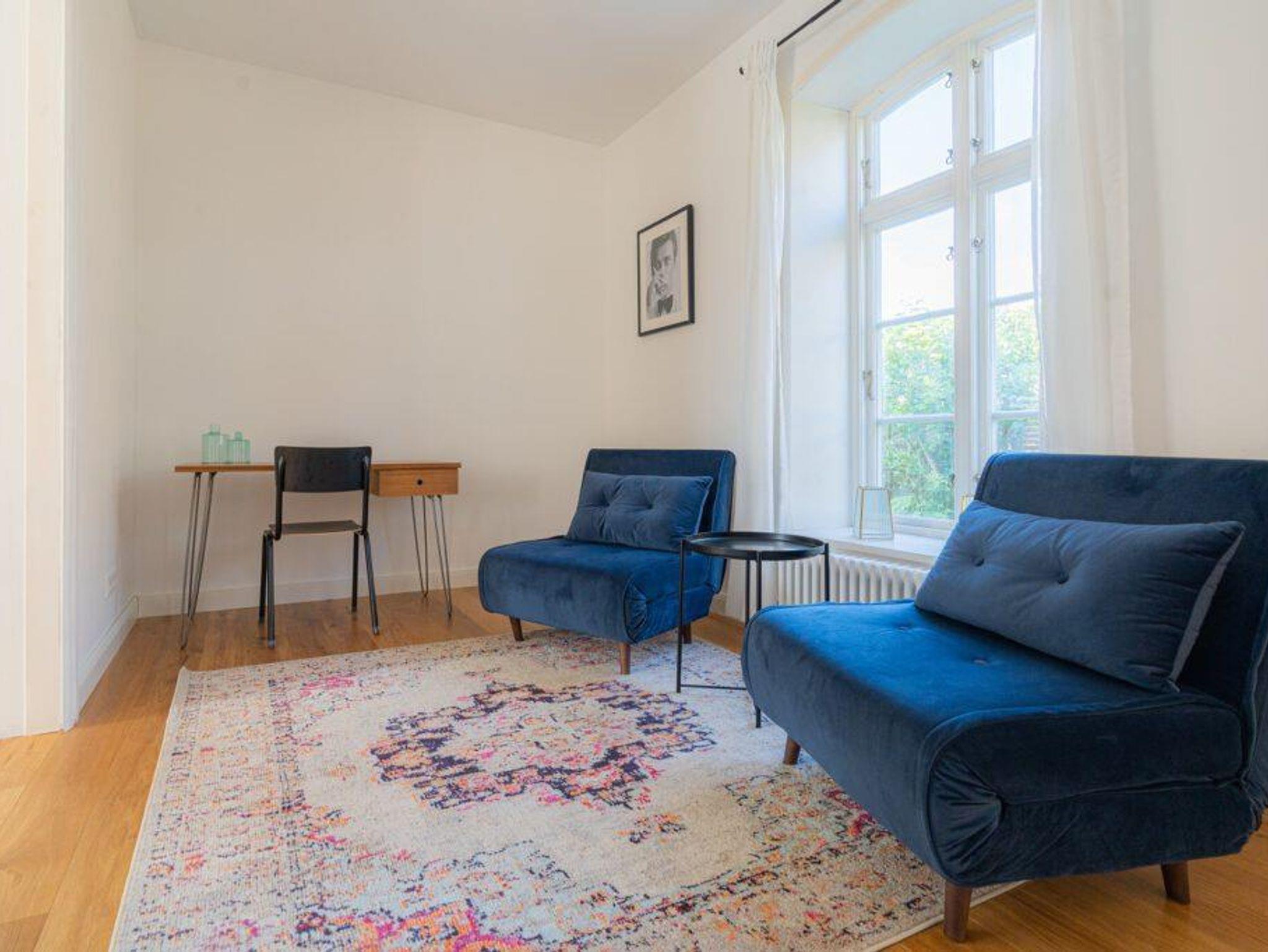Schlafzimmer /Arbeitszimmer (13 qm, Verbindungstür zum Wohnzimmer): Zwei Schlafsessel, je 0,90 x 2,00 (12 qm), Schreibtisch.
