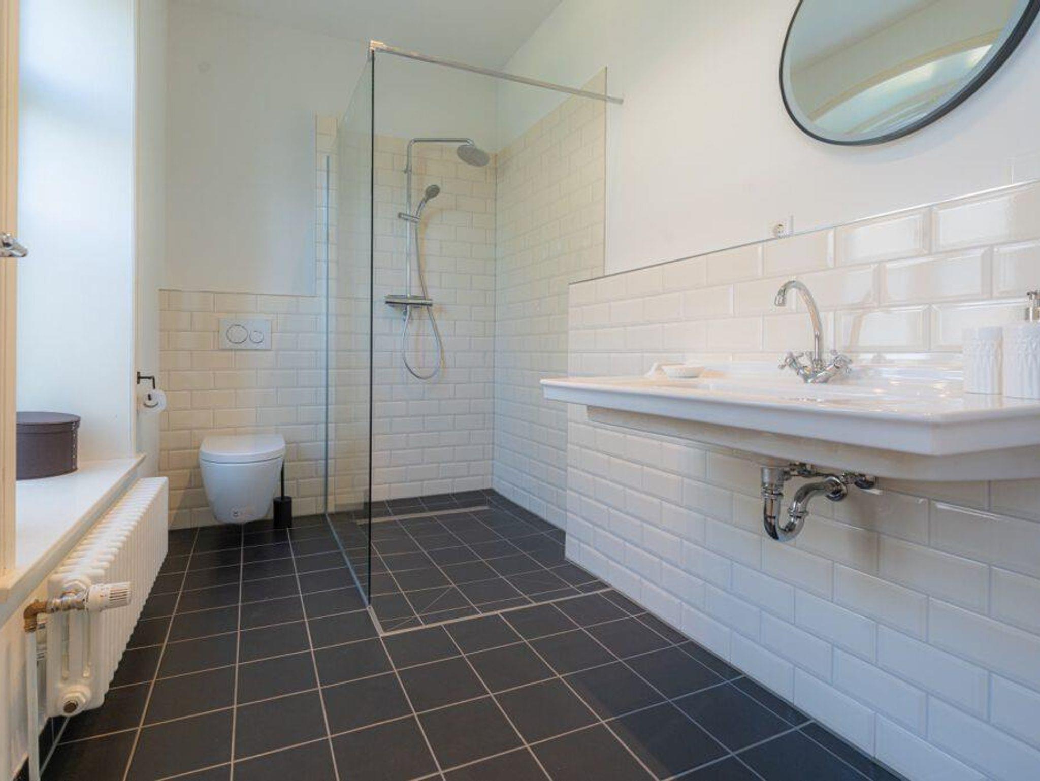 Großes Duschbad mit ebenerdiger Dusche, WC, Fön.