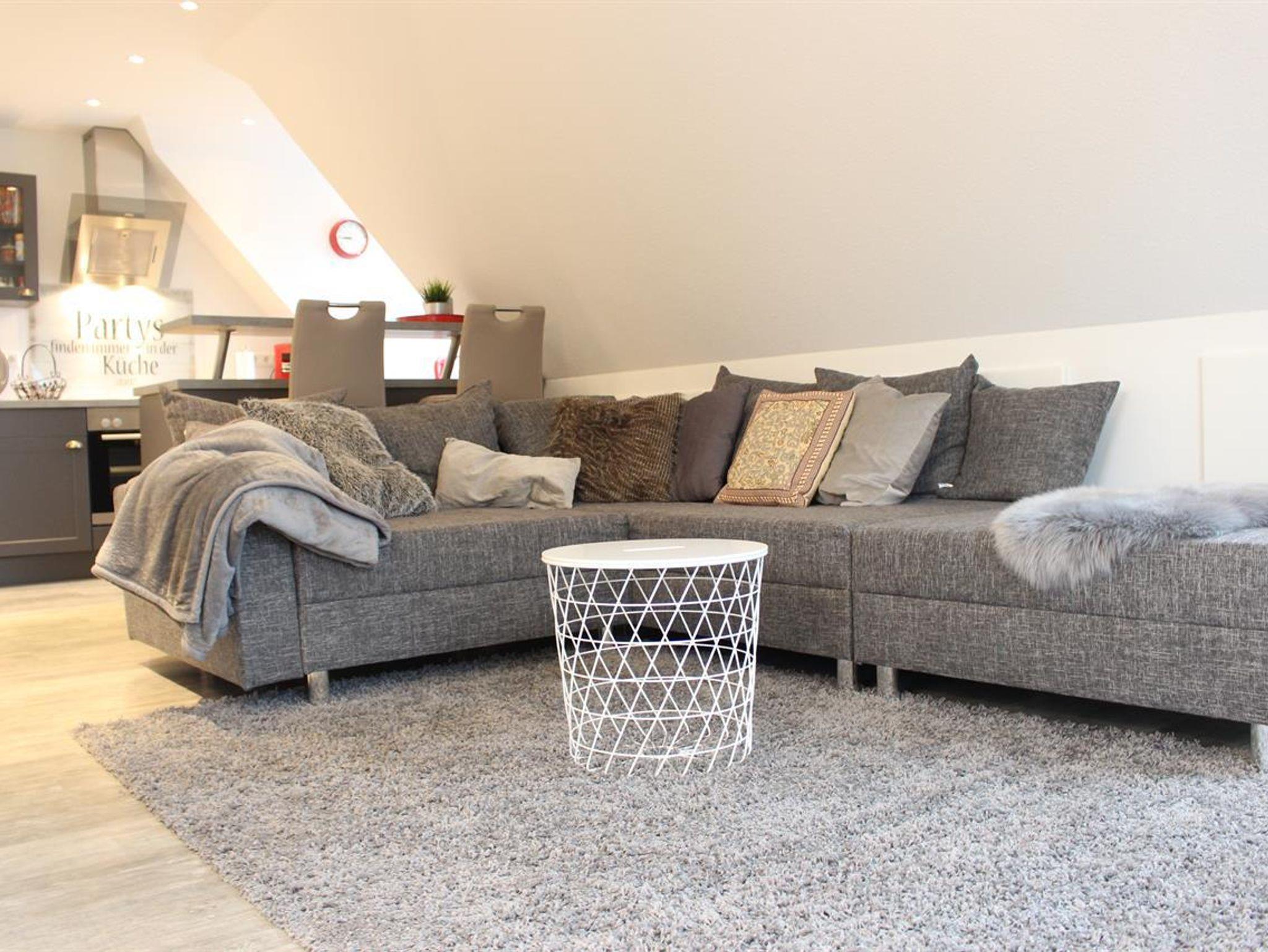 Gemütliches Wohnzimmer mit offener komplett eingerichteter Einbauküche ( u.a. Backofen, Geschirrspüler etc. ) und Essessecke. Grosszüge Dachterasse mit Gartenmöbeln Zwei Schlafzimmer mit je einem Doppelbett für 2 Personen. Großzügiges Duschbad mit WC und Fenster.