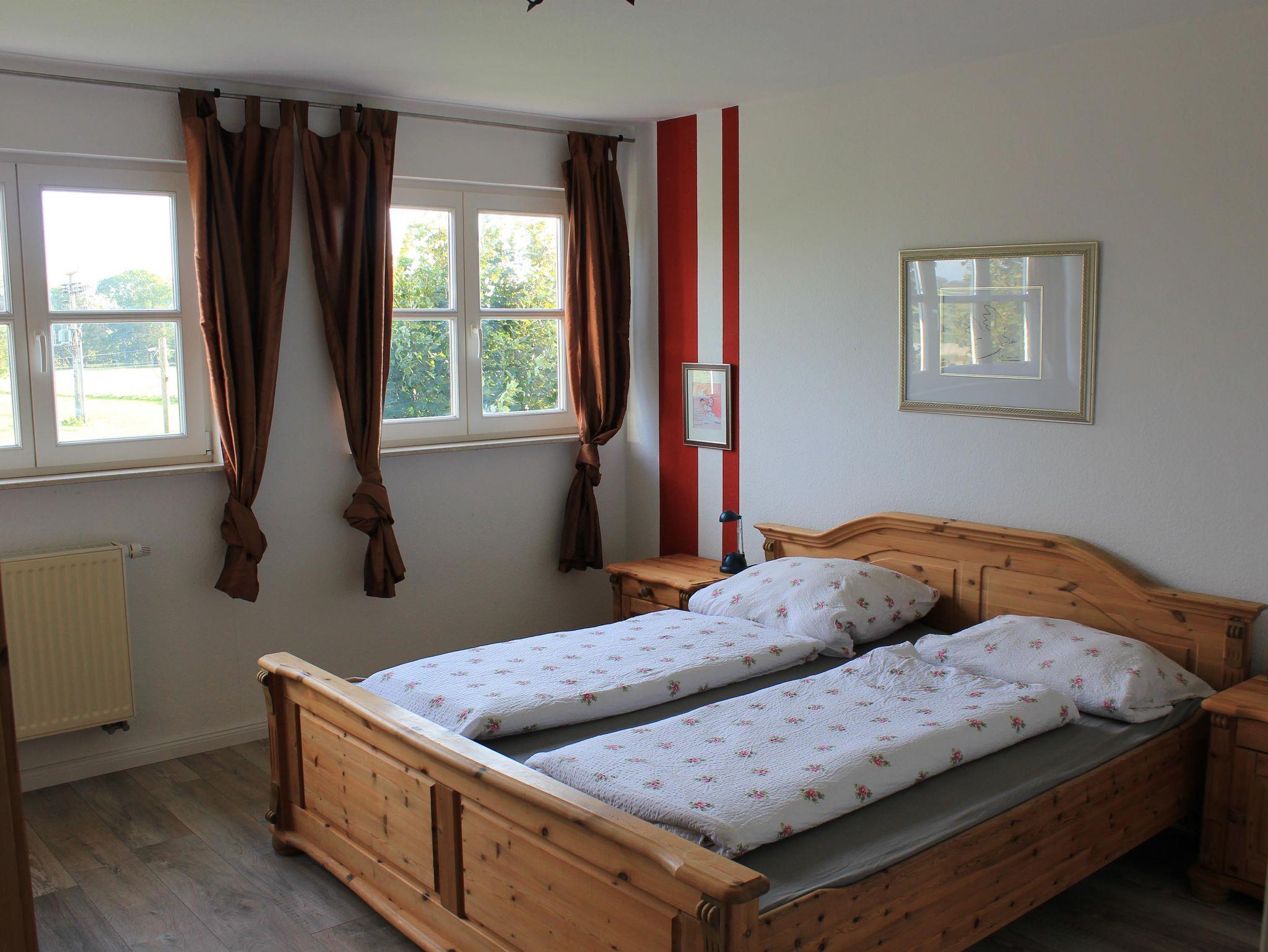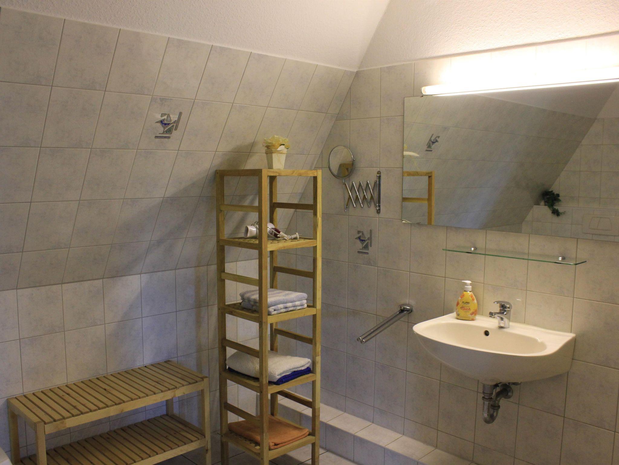 Über eine Holztreppe gelangt man in das Obergeschoss mit einem Schlafraum mit Doppelbett, einen Schlafraum mit 2 Einzelbetten, sowie einem geräumigem Duschbad.