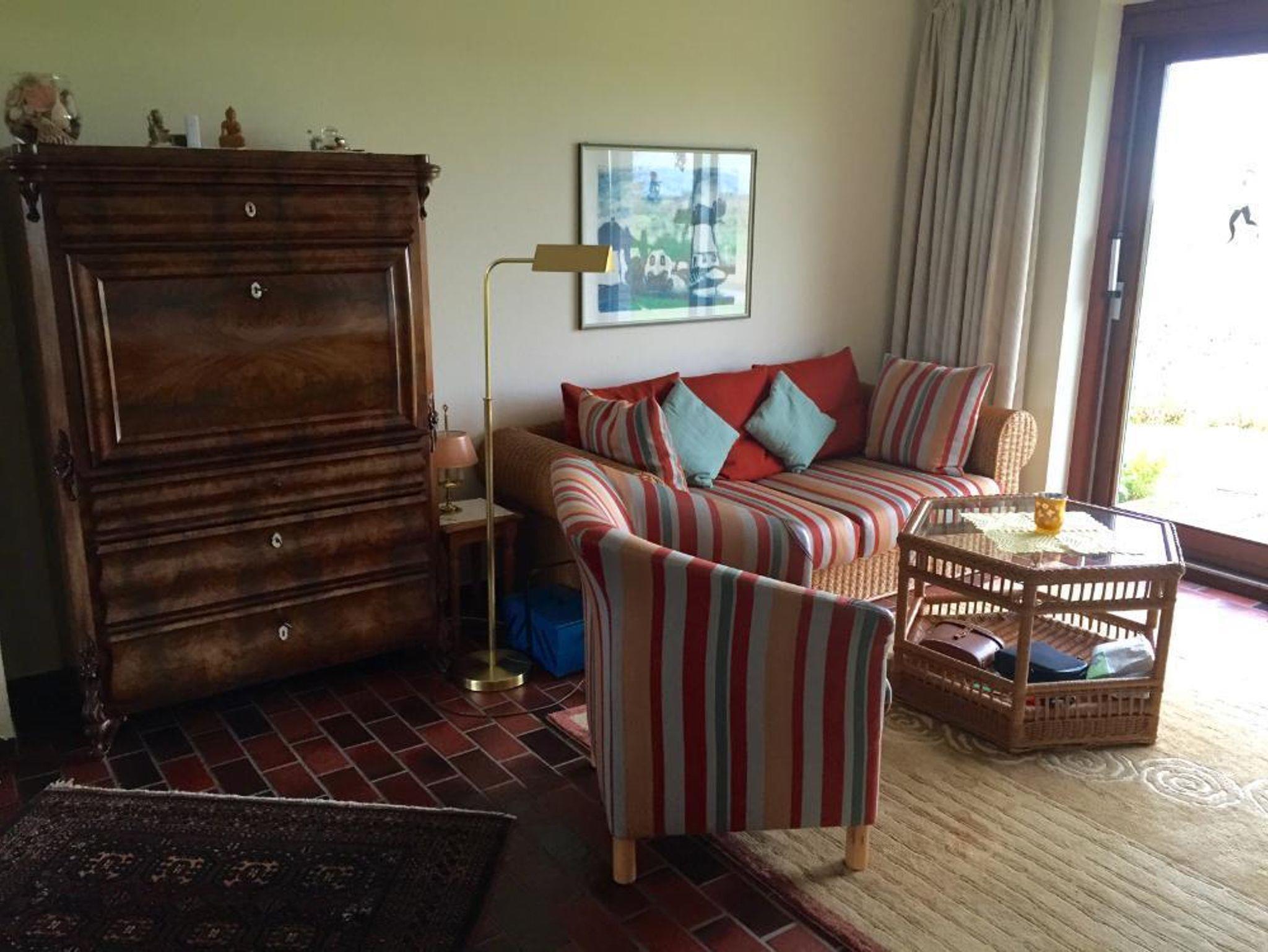 Komfortable, große Wohnung Weitblick (ca. 70 qm) für 2 Personen im Erdgeschoss. Vom 37qm großen Wohnzimmer hat man Zugang zu zwei eigenen Terrassen (Süd- und Westausrichtung) sowie zum Garten. Der Blick aus dem Wohnzimmer über die wunderschöne Eiderstedter Landschaft ist traumhaft! Die Küche ist für den Bedarf zum Kochen voll ausgestattet und hat eine Geschirrspülmaschine. Das Schlafzimmer ist hochwertig und neu eingerichtet. Im Badezimmer finden Sie eine Badewanne mit Duschvorrichtung und WC. WLAN und moderner Sat-TV ist selbstverständlich vorhanden.