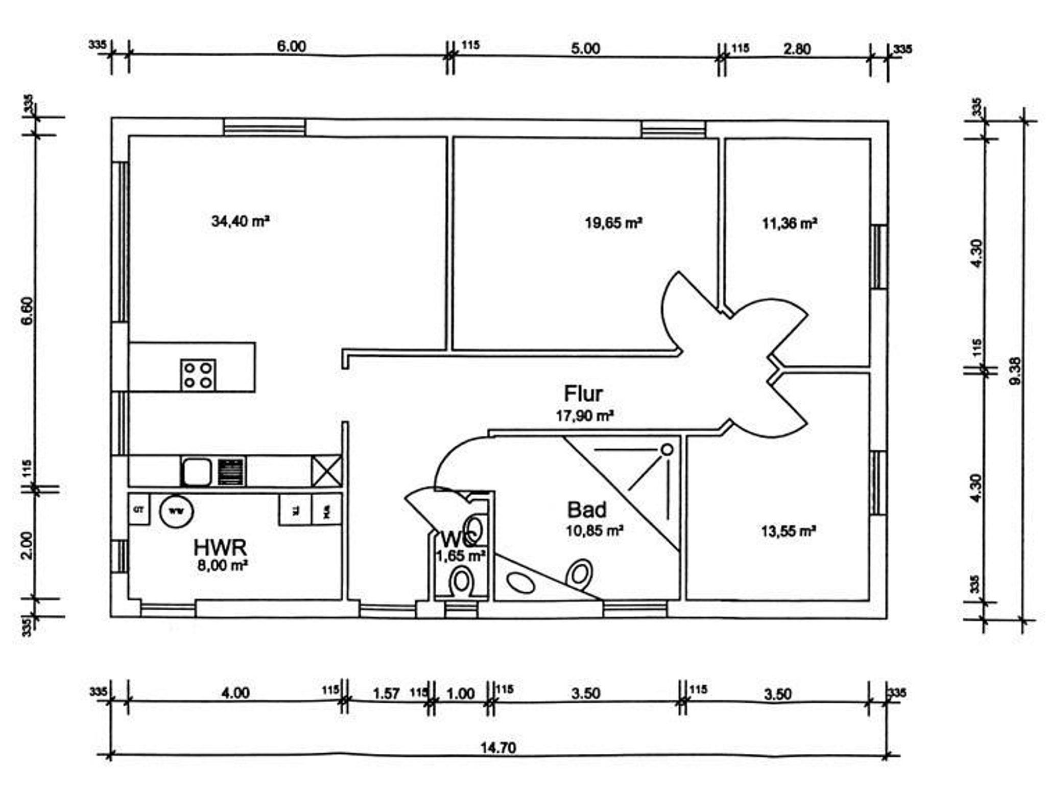 Es ist aufgeteilt in 3 Schlafzimmern, Wohnküche und einem Duschbad mit WC, sowie einem zweiten WC.
