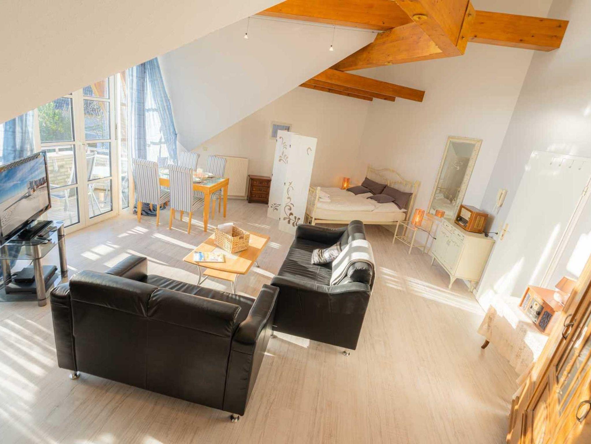 Wohn-/Schlafzimmer mit einem Doppelbett (2x 80x200cm, hinter einem Paravent), zwei Sofas (2er und 3er), großem SMART-TV (Sat), DVD-Player, Stereo-Kompaktanlage, Plattenspieler (Schallplatten bei der Vermieterin auszuleihen) und Esstisch mit 4 Stühlen. Direkter Zugang zum möblierten, überdachten Balkon nach Südwesten.