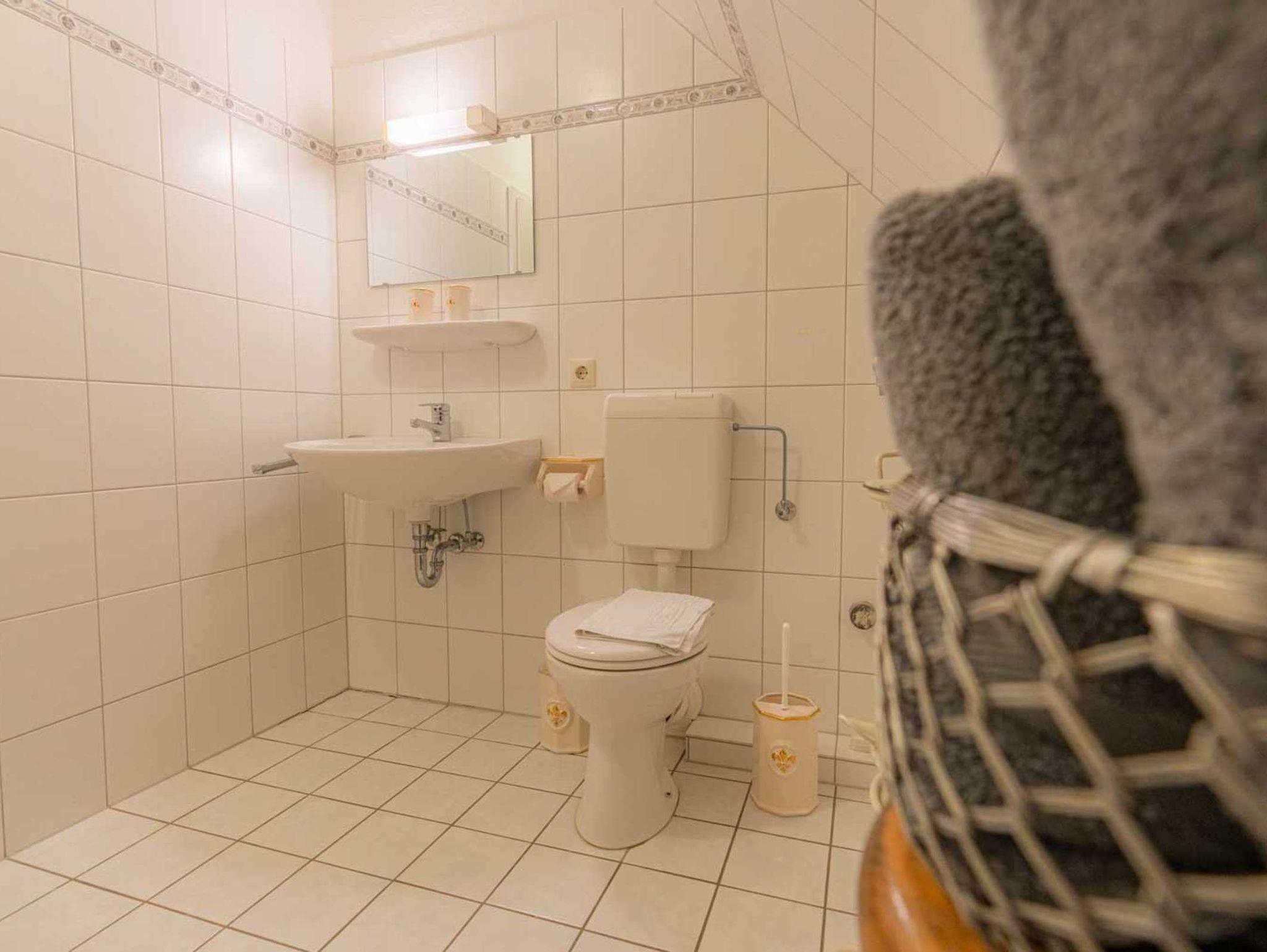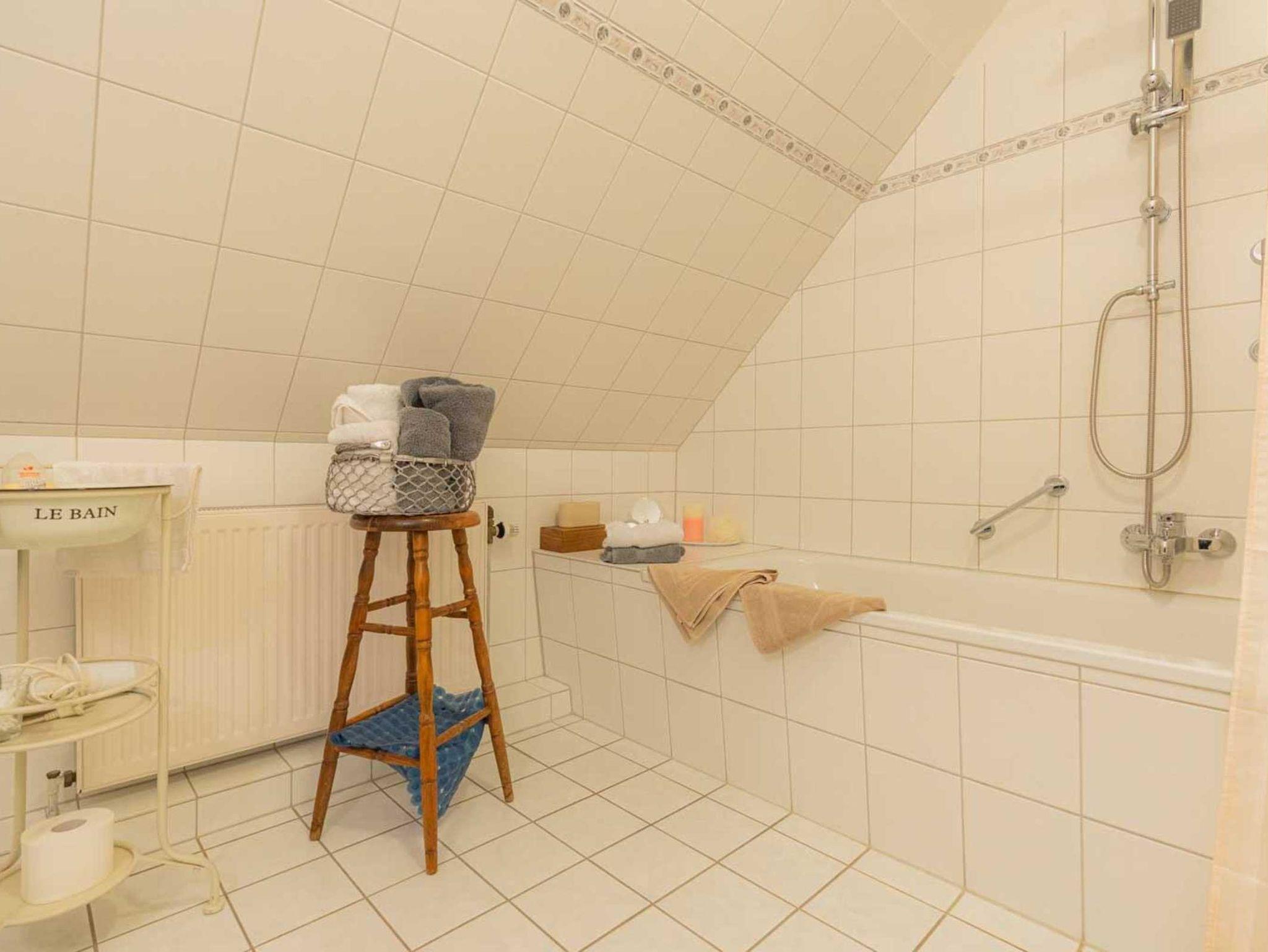 Badezimmer (Vollbad) mit Badewanne mit Regen-Duschhandstück, WC und Föhn.
