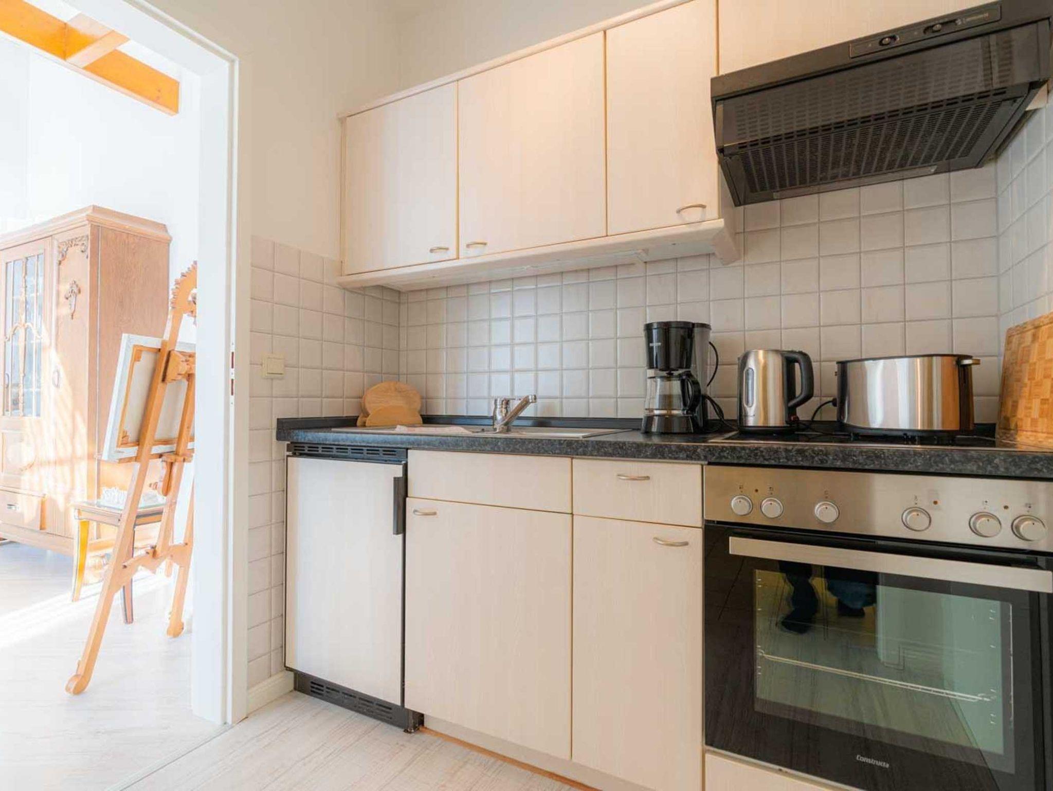 Separate kl. Küche mit Backofen und Kühlschrank mit Gefrierfach. Abstellkammer mit Garderobe und Staubsauger.
