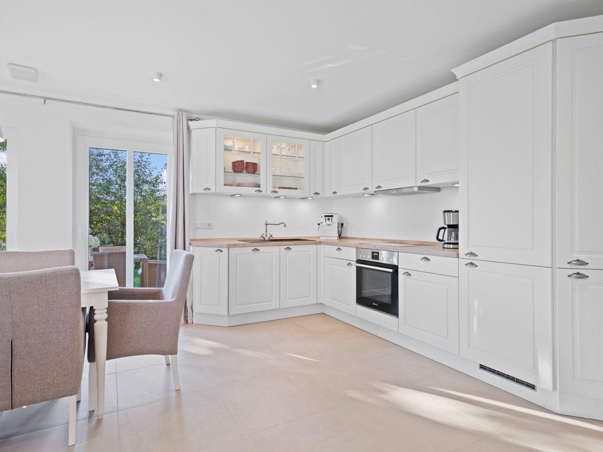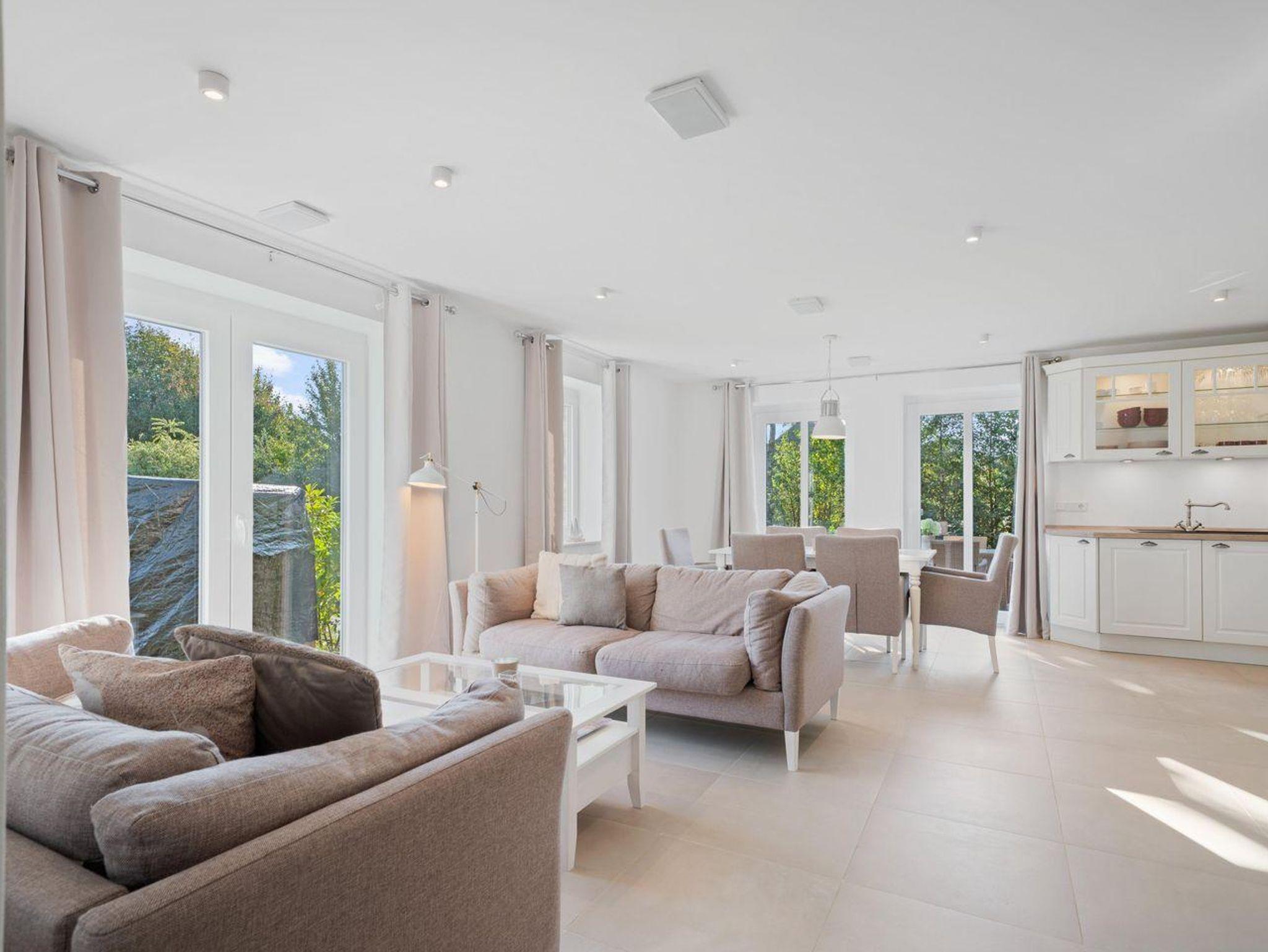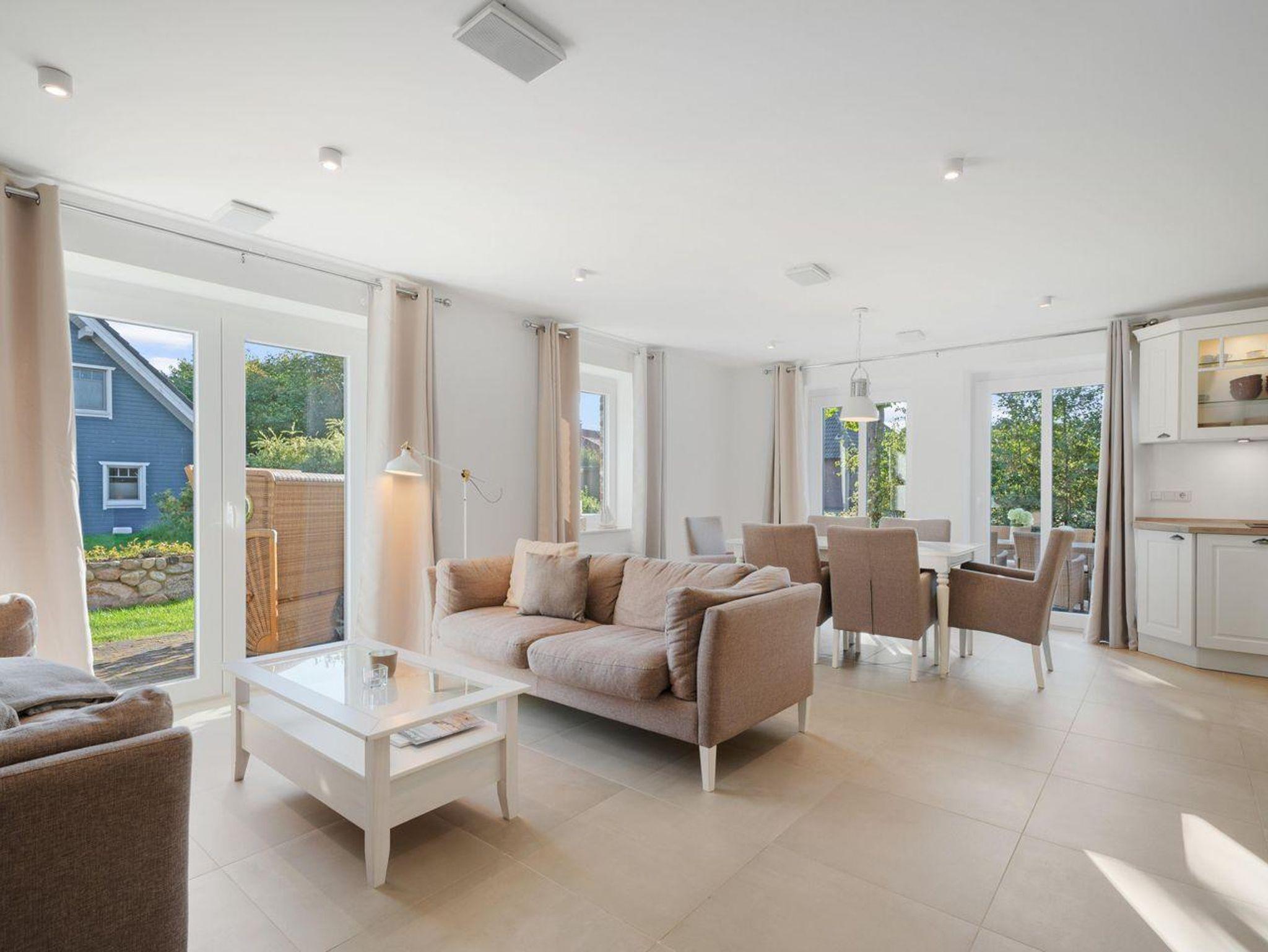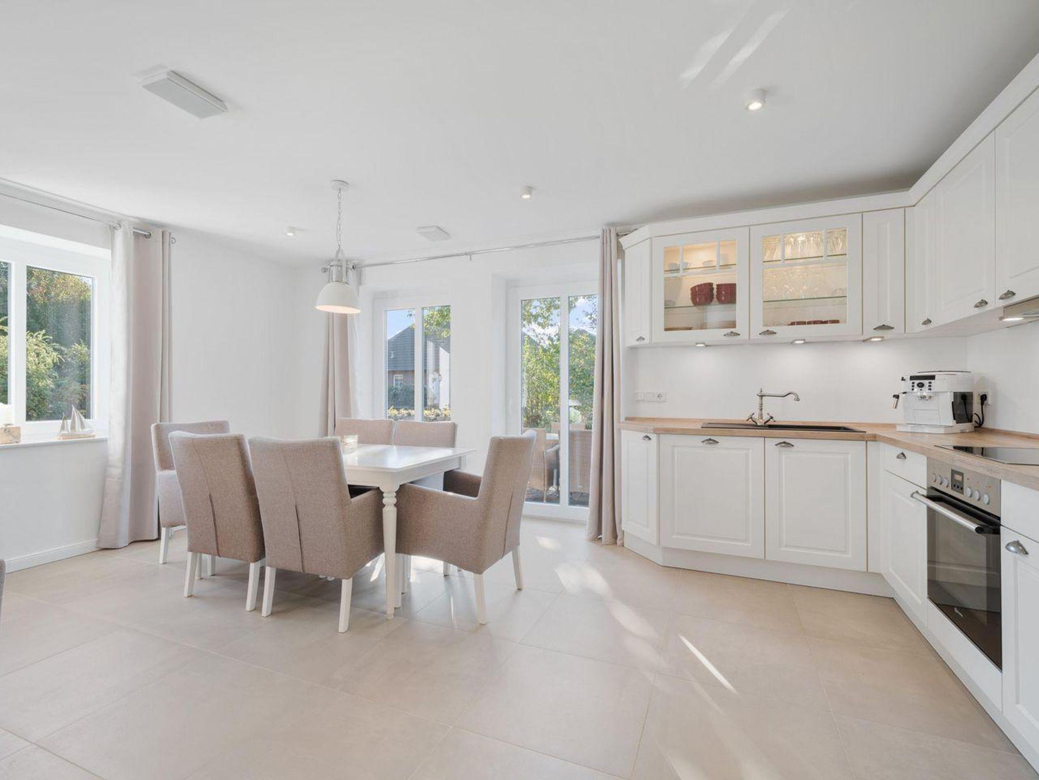 Der offene Wohn- und Essbereich im Erdgeschoss lädt mit einem gemütlichen Kamin, einer Sofaecke und großem Esstisch zu geselligen Abenden ein. Die voll ausgestattete Küche verfügt über Ceranherd, Backofen, Spülmaschine und eine umfassende Küchenausstattung, sodass Selbstversorger bestens ausgestattet sind. Fußbodenheizung in allen Räumen, kostenfreies WLAN, Digital-TV und eine HiFi-Anlage runden den Wohnkomfort ab. Waschmaschine, Trockner, Bügeleisen und Bügelbrett stehen ebenfalls zur Verfügung, was das Ferienhaus ideal auch für längere Aufenthalte macht.