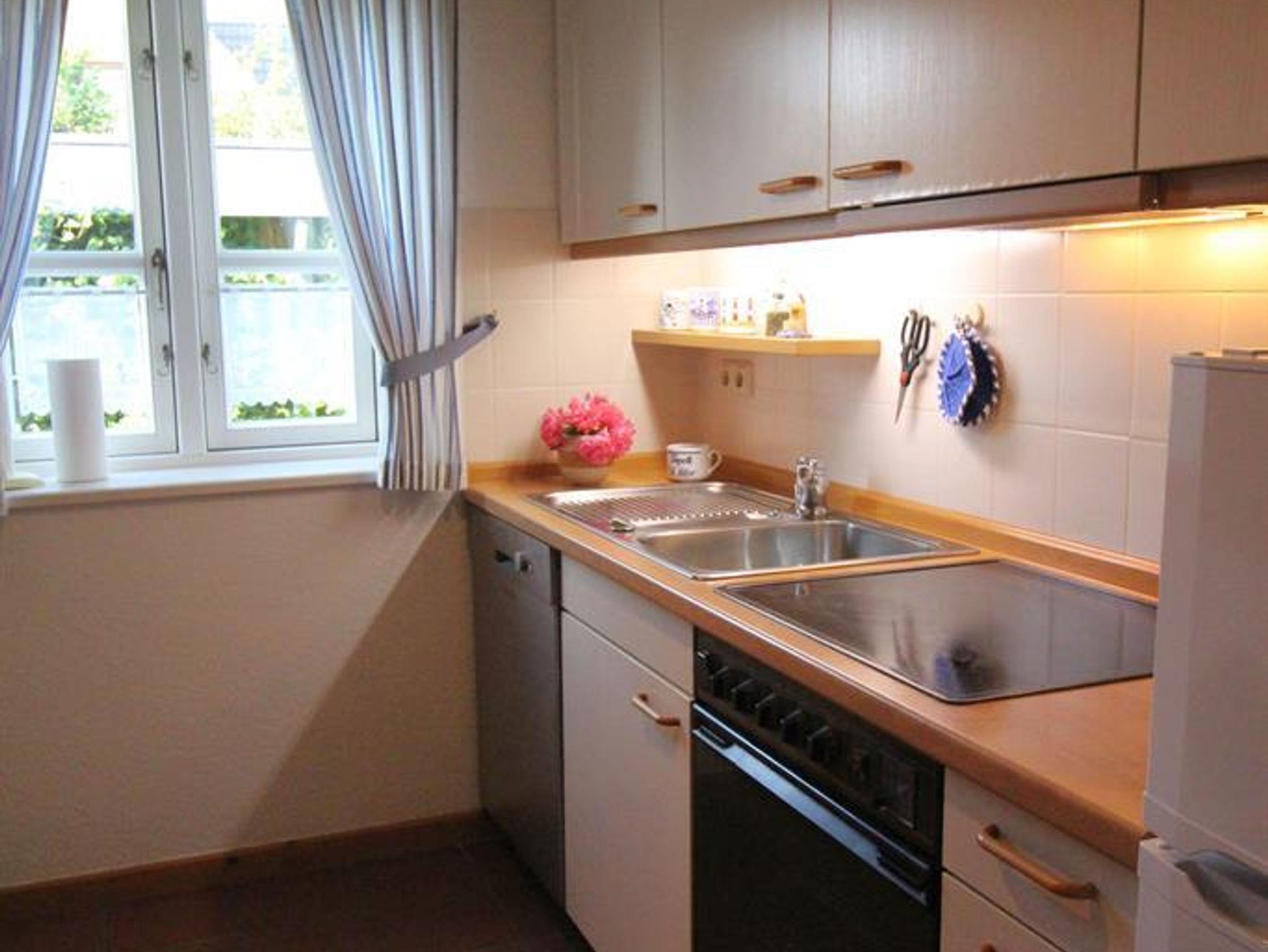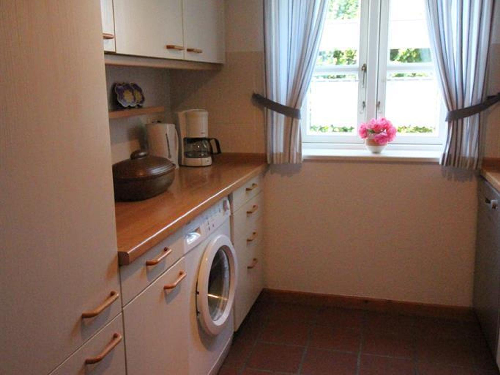 Die voll ausgestattete Küche lässt keine Wünsche offen: Kühl-Gefrierschrank, Geschirrspüler, Waschmaschine, ein praktisches Würzregal sowie reichlich Stauraum sind vorhanden.