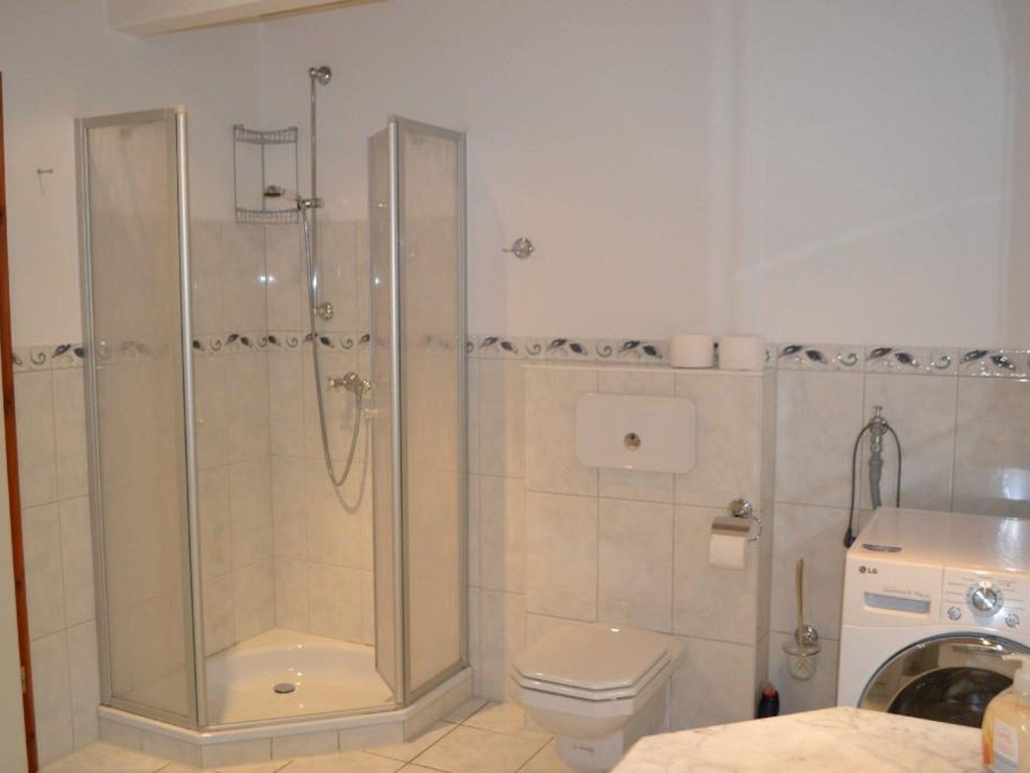 Badezimmer mit Dusche und Badewanne, Fön, Waschmaschine, Trockner, Wäscheständer
