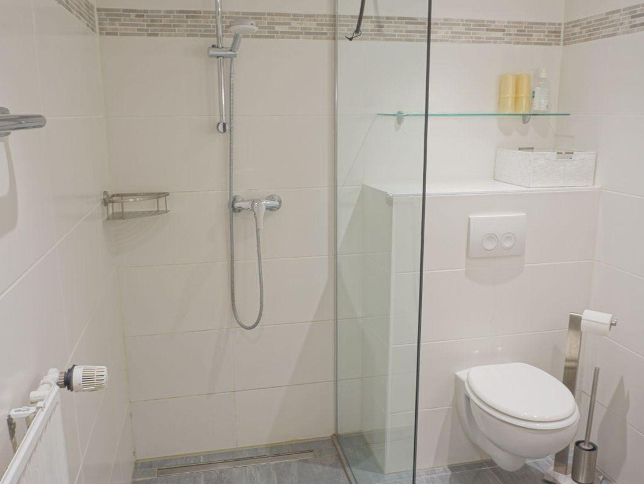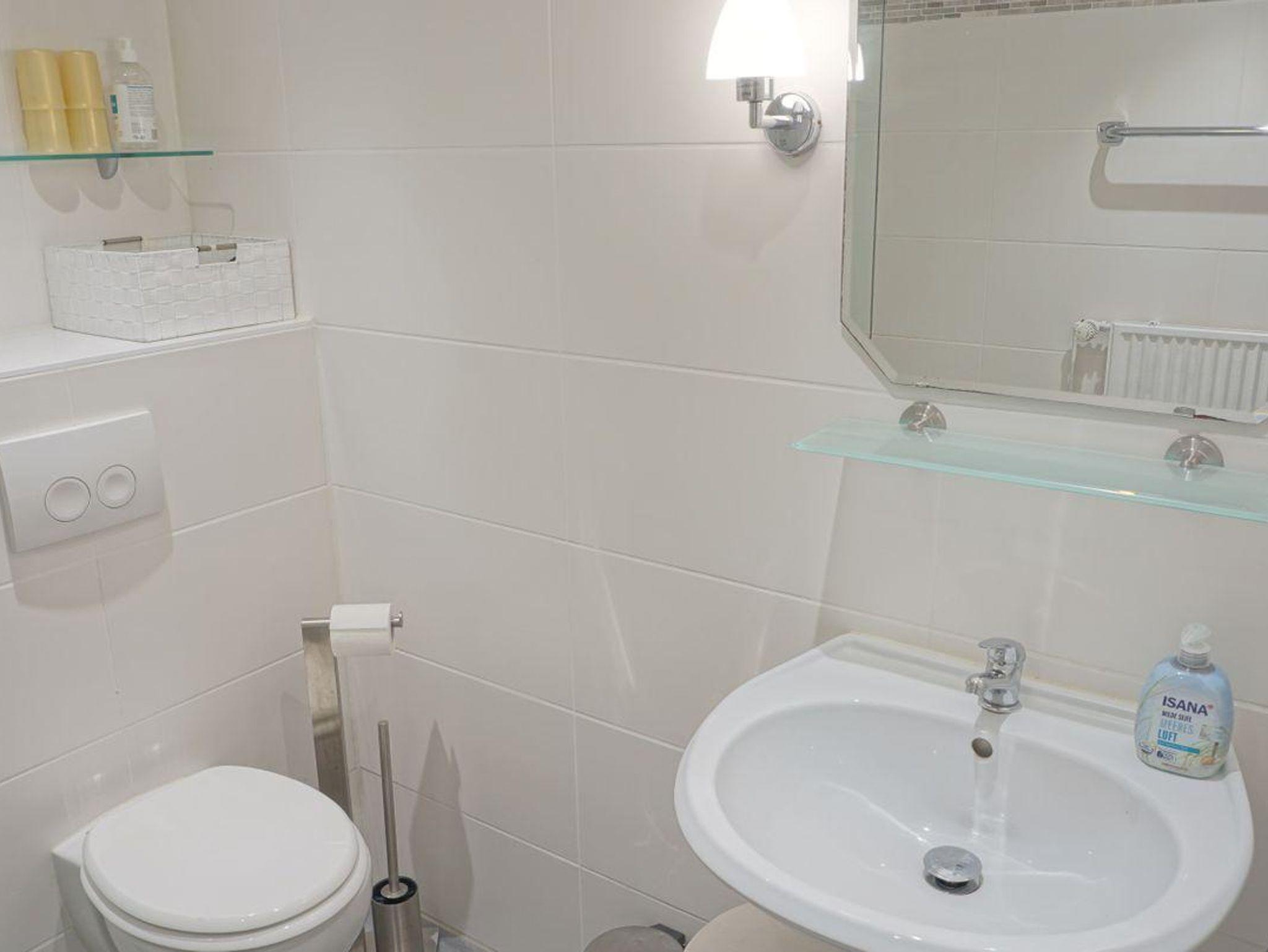 Die Wohnung ist als Nichtraucherunterkunft ausgewiesen und allergikergeeignet. Eine bodengleiche Dusche im Badezimmer, ein Haartrockner, Spiegel und Waschbecken ergänzen die Badezimmereinrichtung.