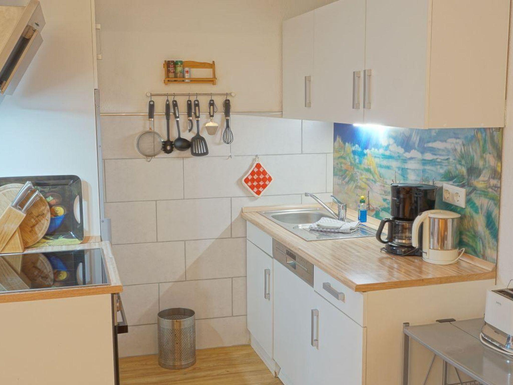 Die voll ausgestattete Küche lässt kaum Wünsche offen: Ceranfeld, Backofen mit Elektroanschluss, Mikrowelle, Spülmaschine, Kühlschrank mit Gefrierfach, Kaffeemaschine, Wasserkocher, Toaster sowie Geschirr und Besteck stehen Ihnen zusammen mit einer Erstausstattung an Küchenutensilien zur Verfügung. Im Essbereich finden Sie einen praktischen Esstisch mit gemütlicher Sitzgelegenheit. Die Gemeinschaftswaschmaschine, Bügeleisen sowie Bügelbrett und Wäscheständer erleichtern längere Aufenthalte.