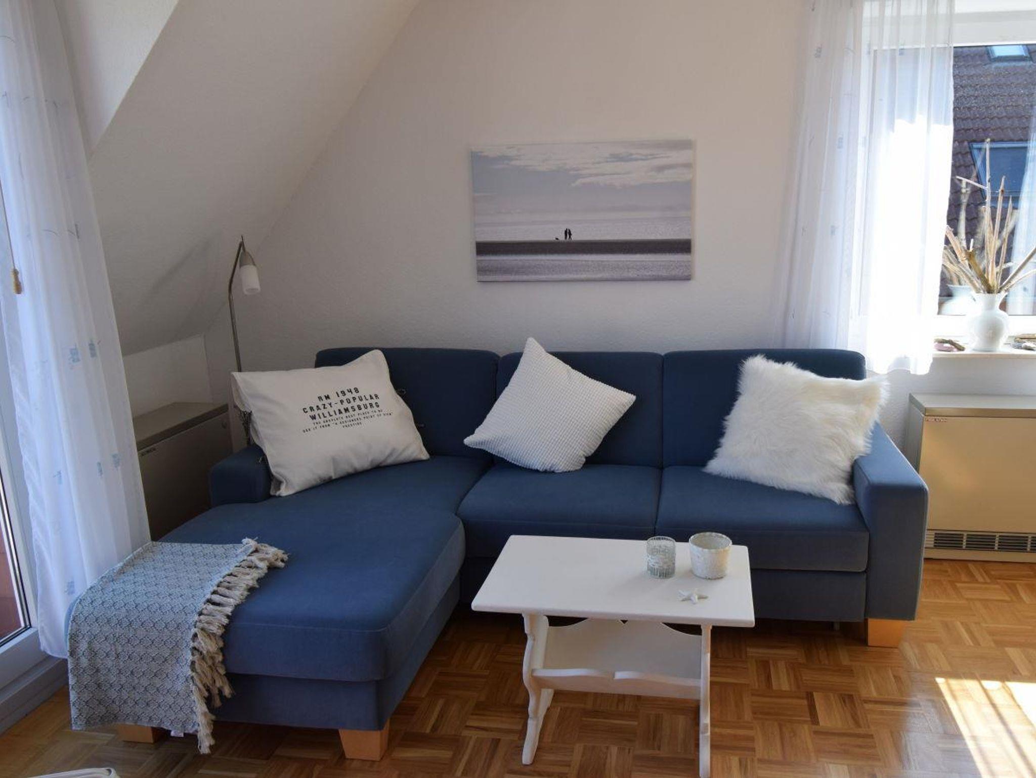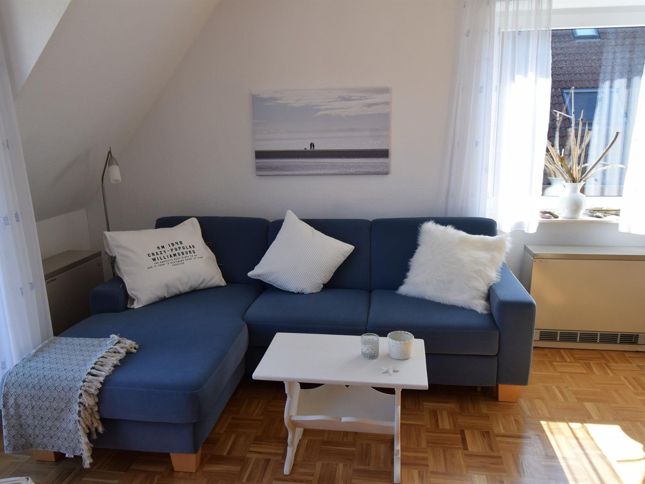 Das Schlafzimmer mit einem Doppelbett in der Größe 160x200 cm und der Wohnraum sind mit einem schönen Parkettboden ausgestattet. Das blaue Sofa im Wohnraum lädt ein zum gemütlichen Verweilen.