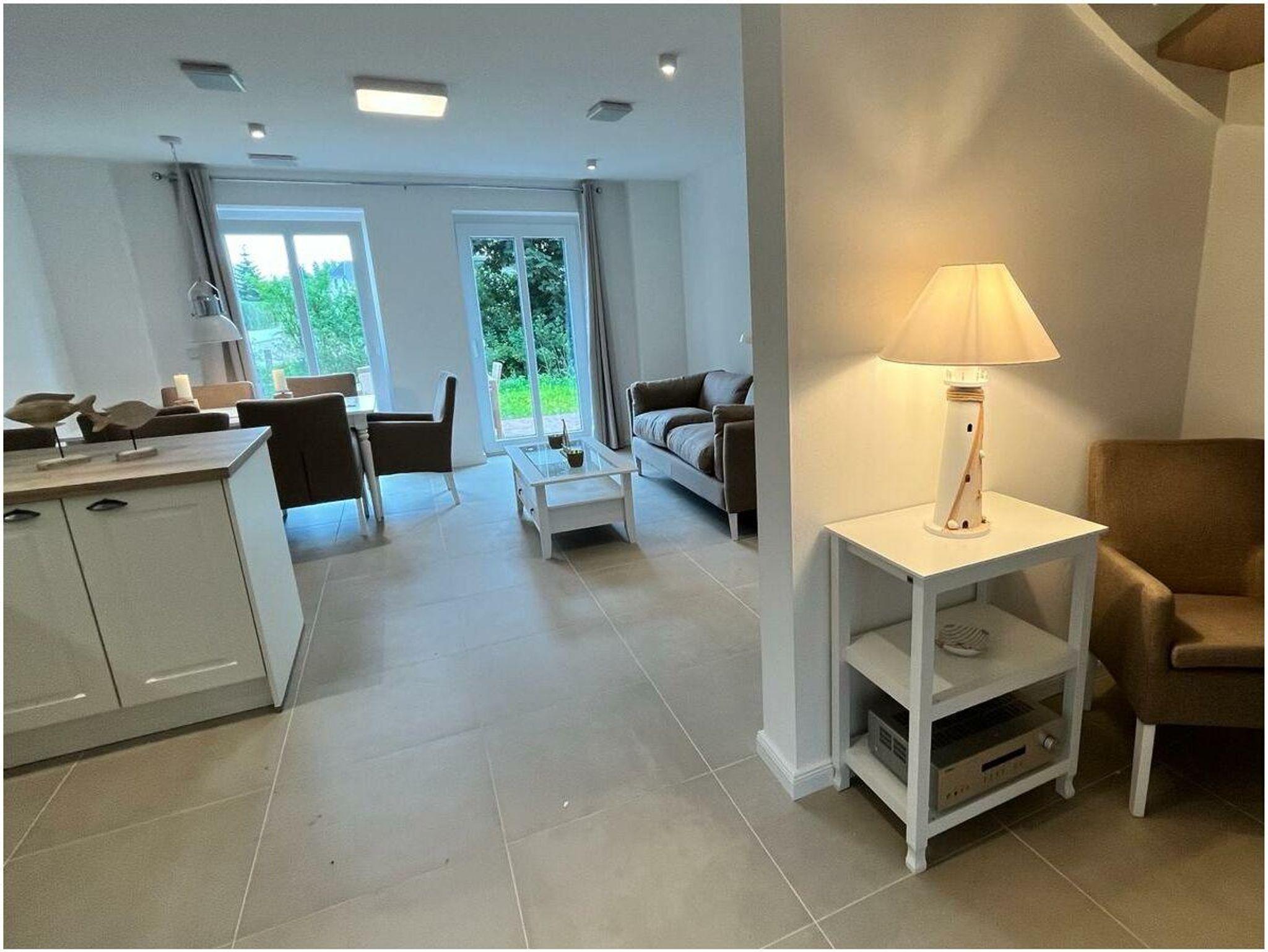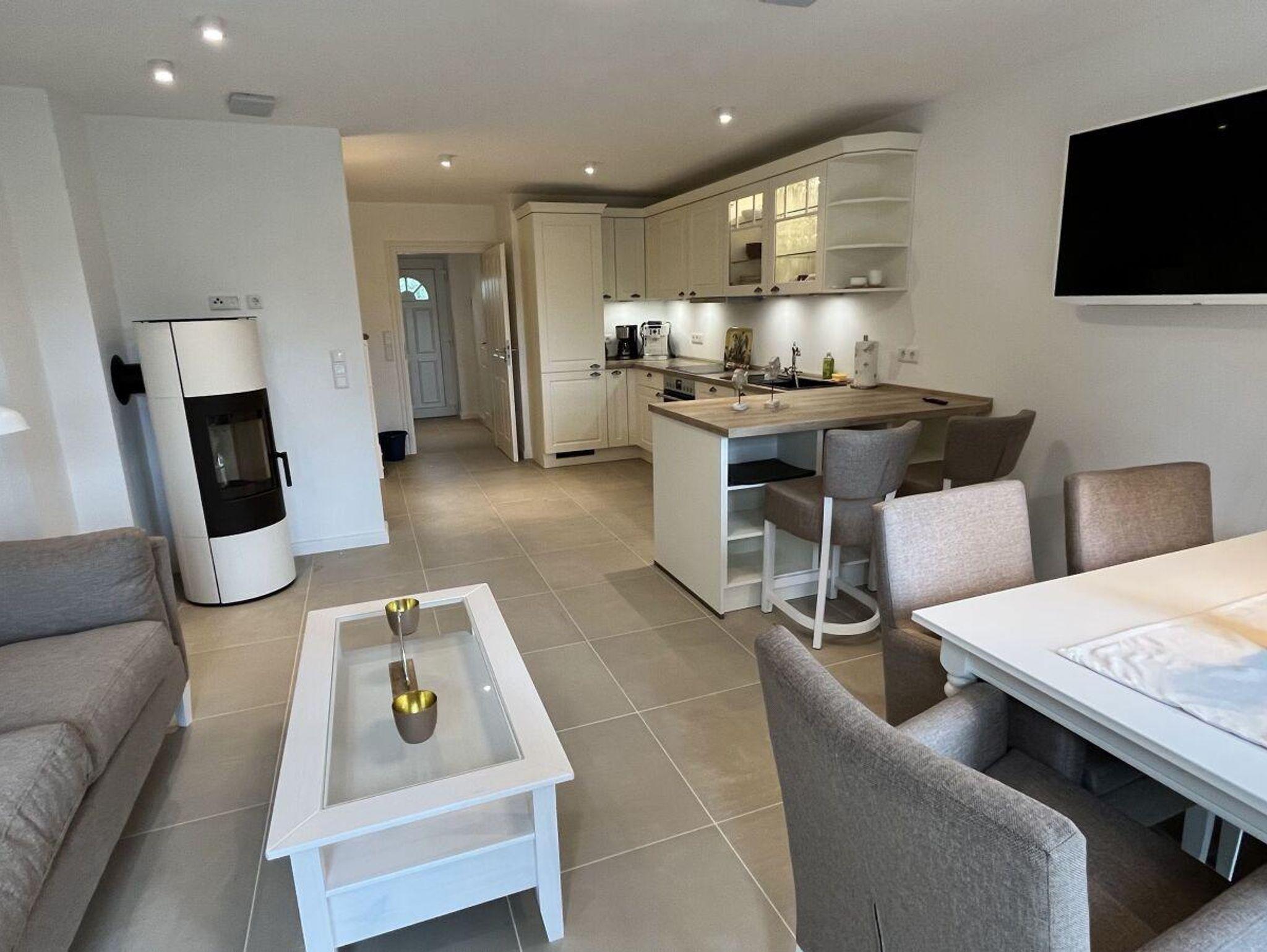 Traumhaftes Neubau - Friesenhaus, geschmackvoll und sonnig eingerichtet in weiß und beige Tönen. Hiermit können wir Ihnen das auf den Bildern mittlere Friesenhaus anbieten. Auf den Grundrissen ist es mit WE 3 bezeichnet. Die Terrasse ist nach Süden. ausgerichtet- . Moderne Gartenmöbel und ein Weber Grill stehen dort zur Verfügung .