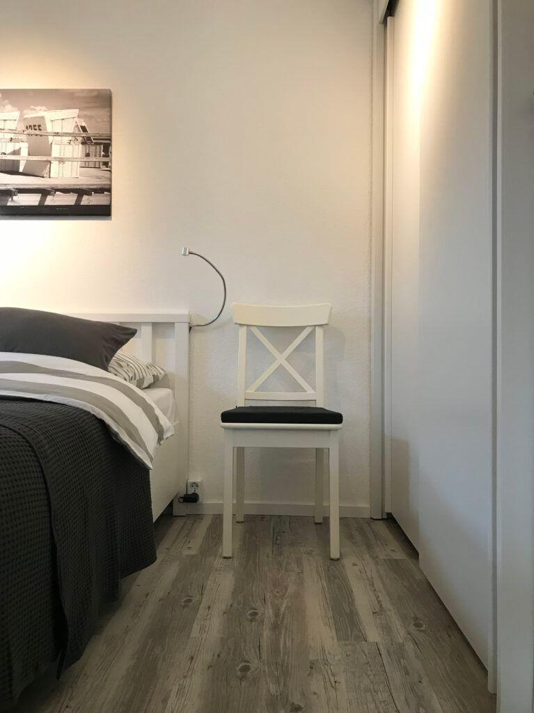 Schlafzimmer mit Doppelbett und Kleiderschrank.