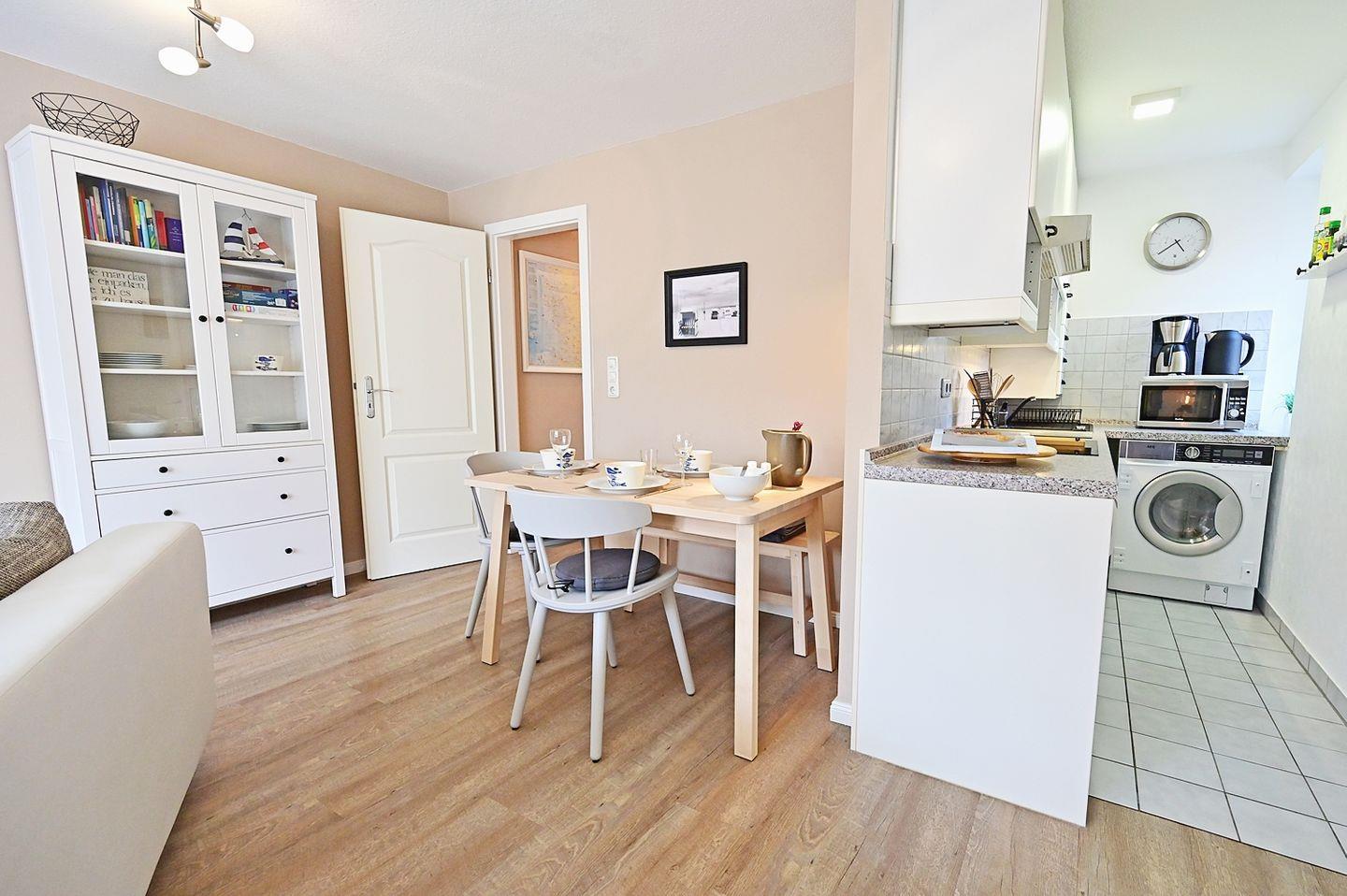 Offene kleine Küche mit Cerankochfeld, Geschirrspülmaschine, Wasch-Trockner, Backofen, Mikrowelle, Kaffeefiltermaschine, Wasserkocher und Toaster, Kühlschrank mit Gefrierfach.