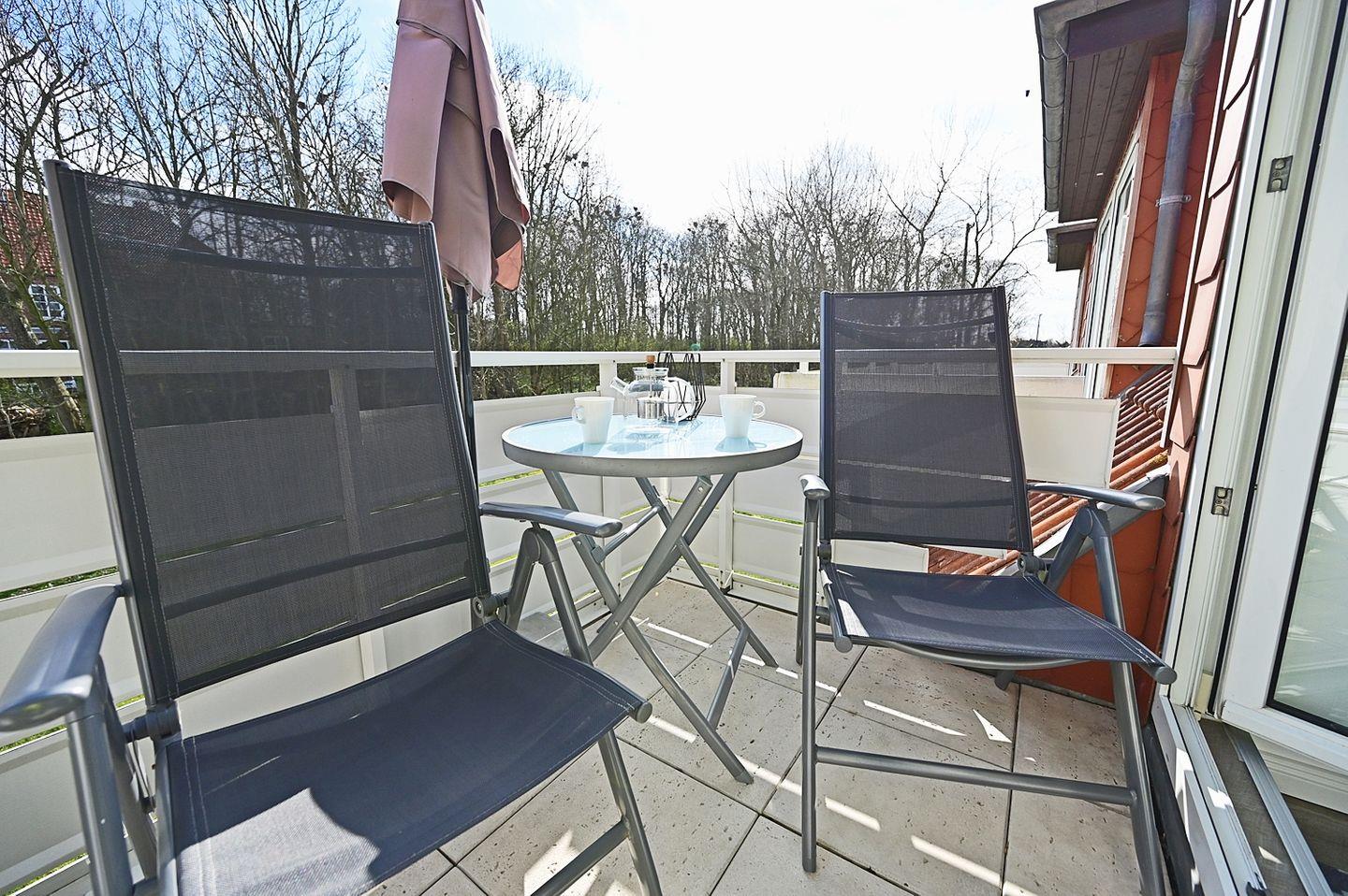 Balkon mit Gartenstühlen, Tisch und Sonnenschirm.