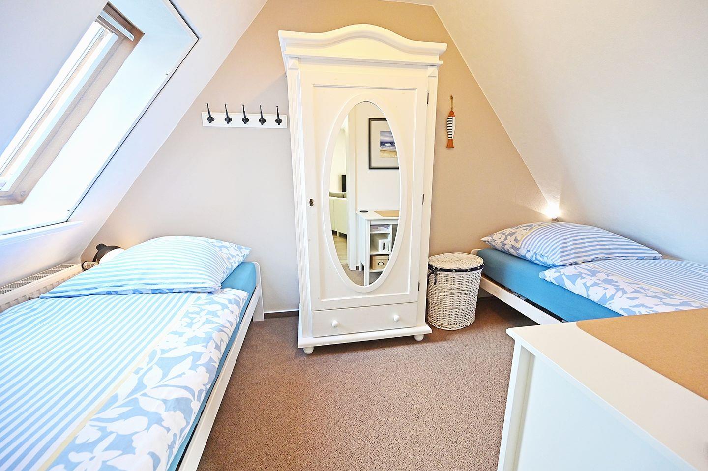 Ein Schlafzimmer mit 2 Einzelbetten (90 x 200 cm), Kleiderschrank mit Spiegel und kleinem Schreibtisch.